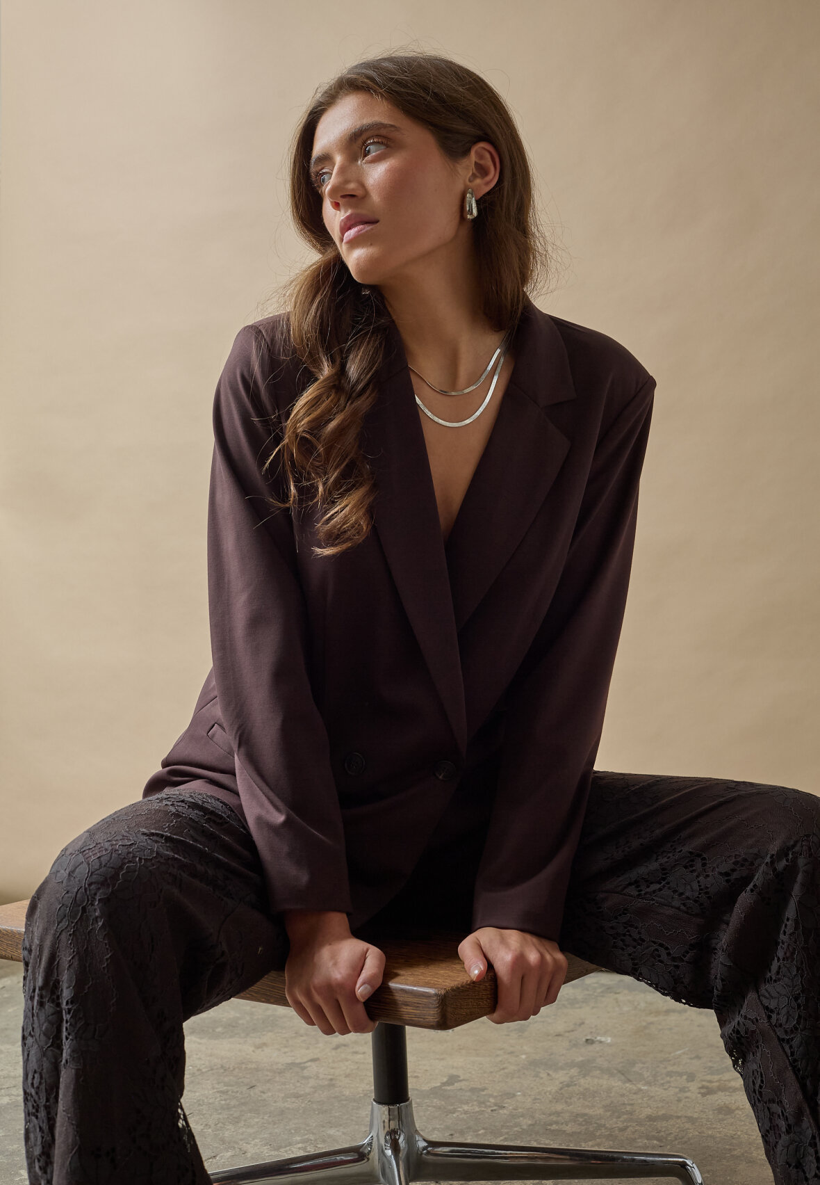 love590 er en klassisk sort blazer med revers og knappelukning. Blazeren har en normal pasform. Fås i sort og mørkebrun.