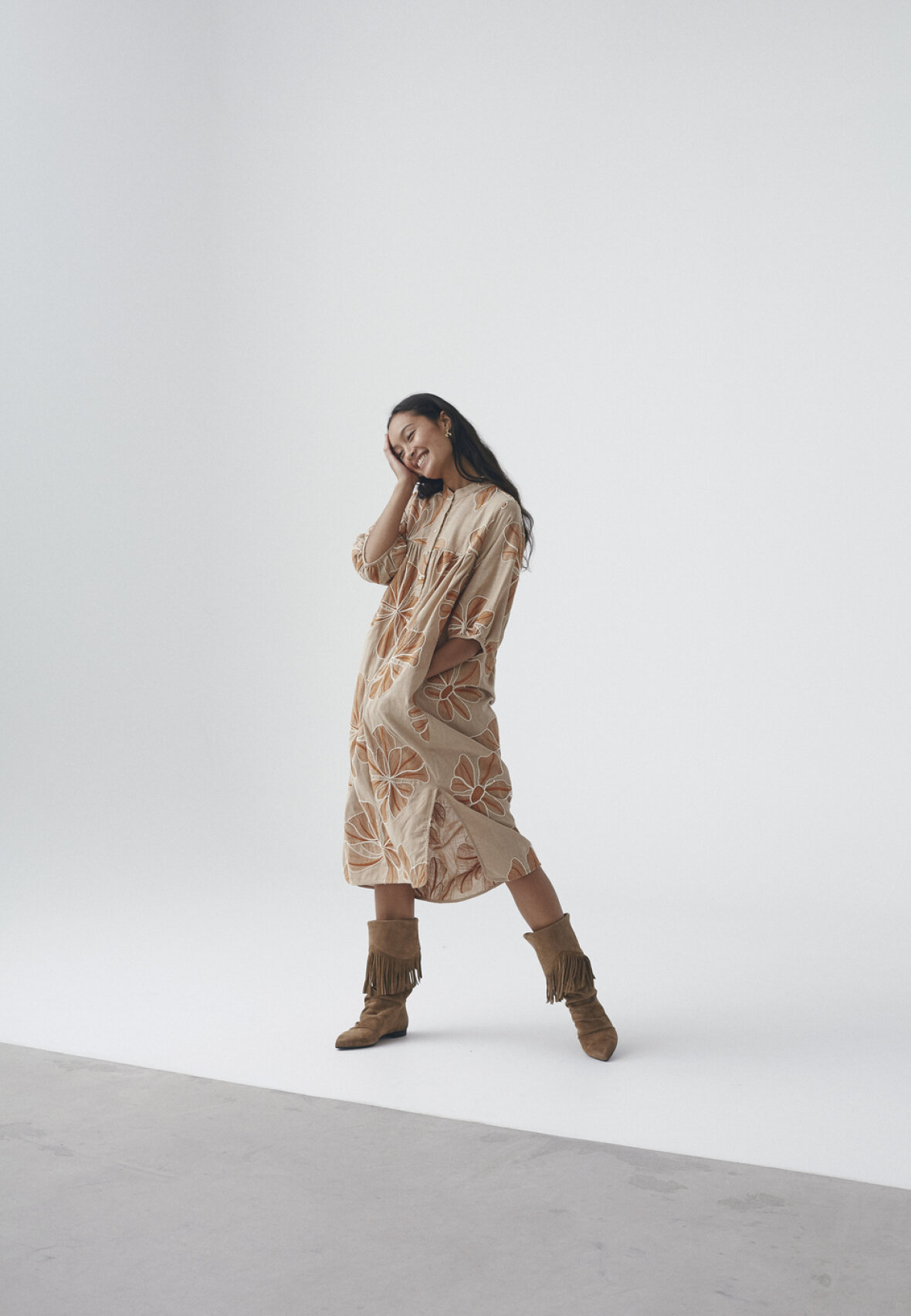 love1009-1 er en kjole med pufærmer og mandarin-krave. Kjolen er knælang og har et let rynk ved brystet. Den er detaljeret med et stort blomstermønster. Modellen har en str. S på og er 175 cm høj.