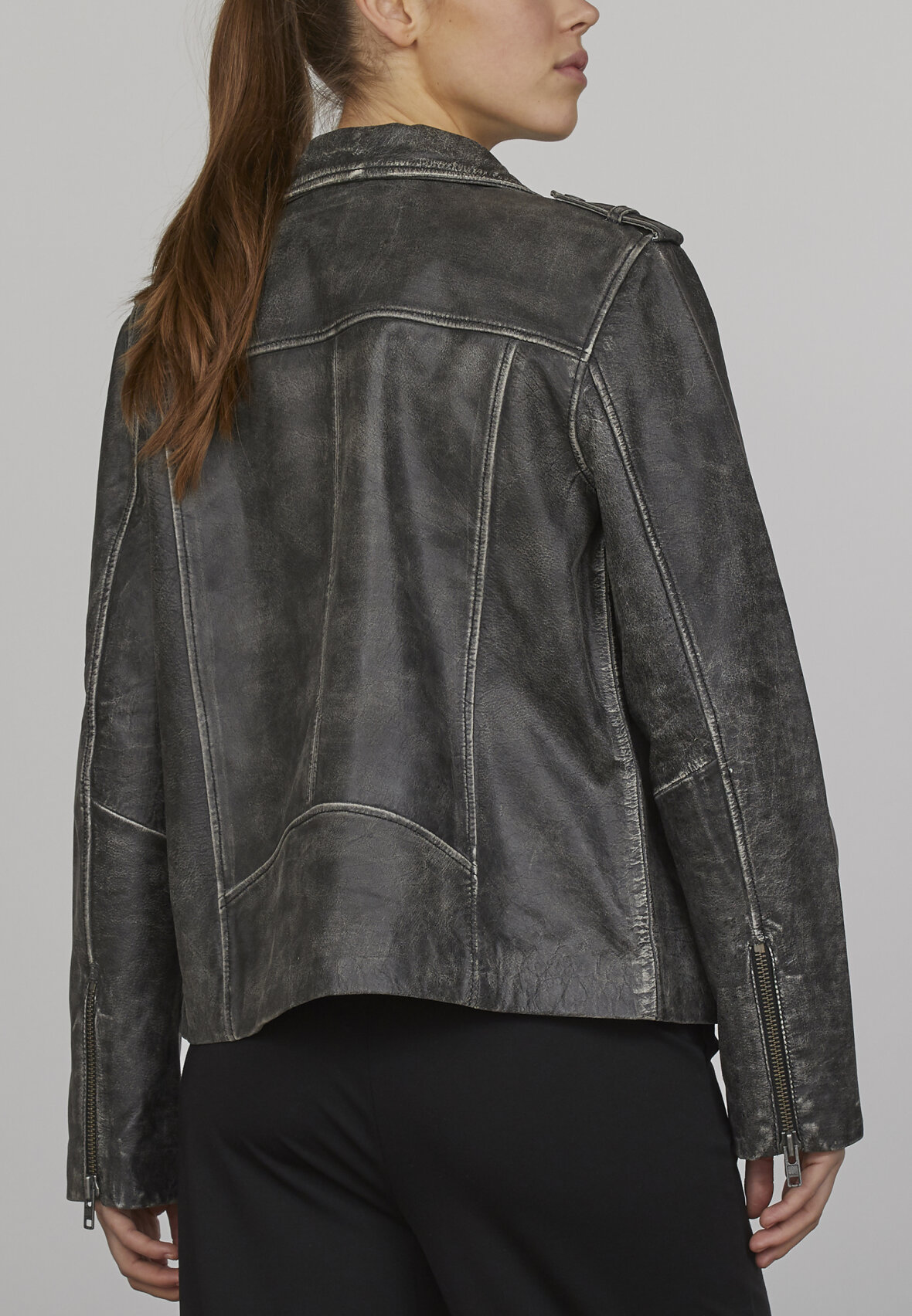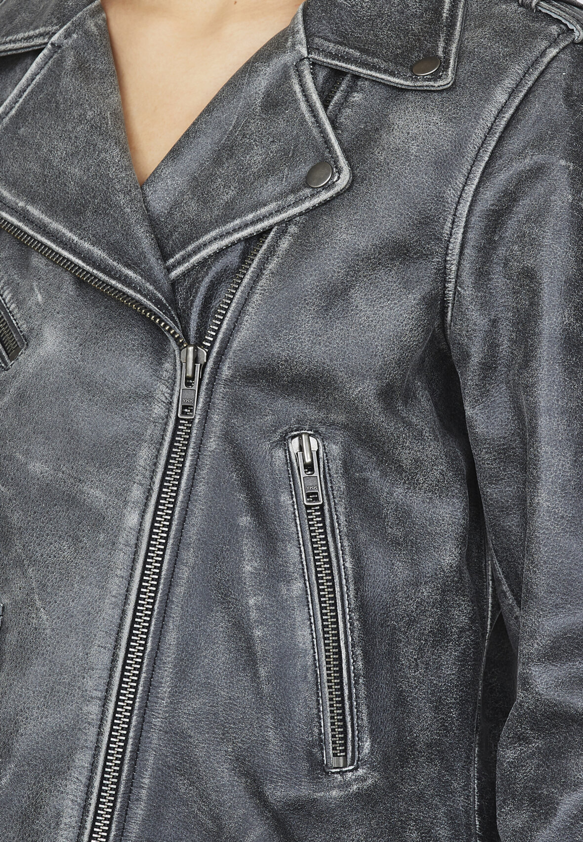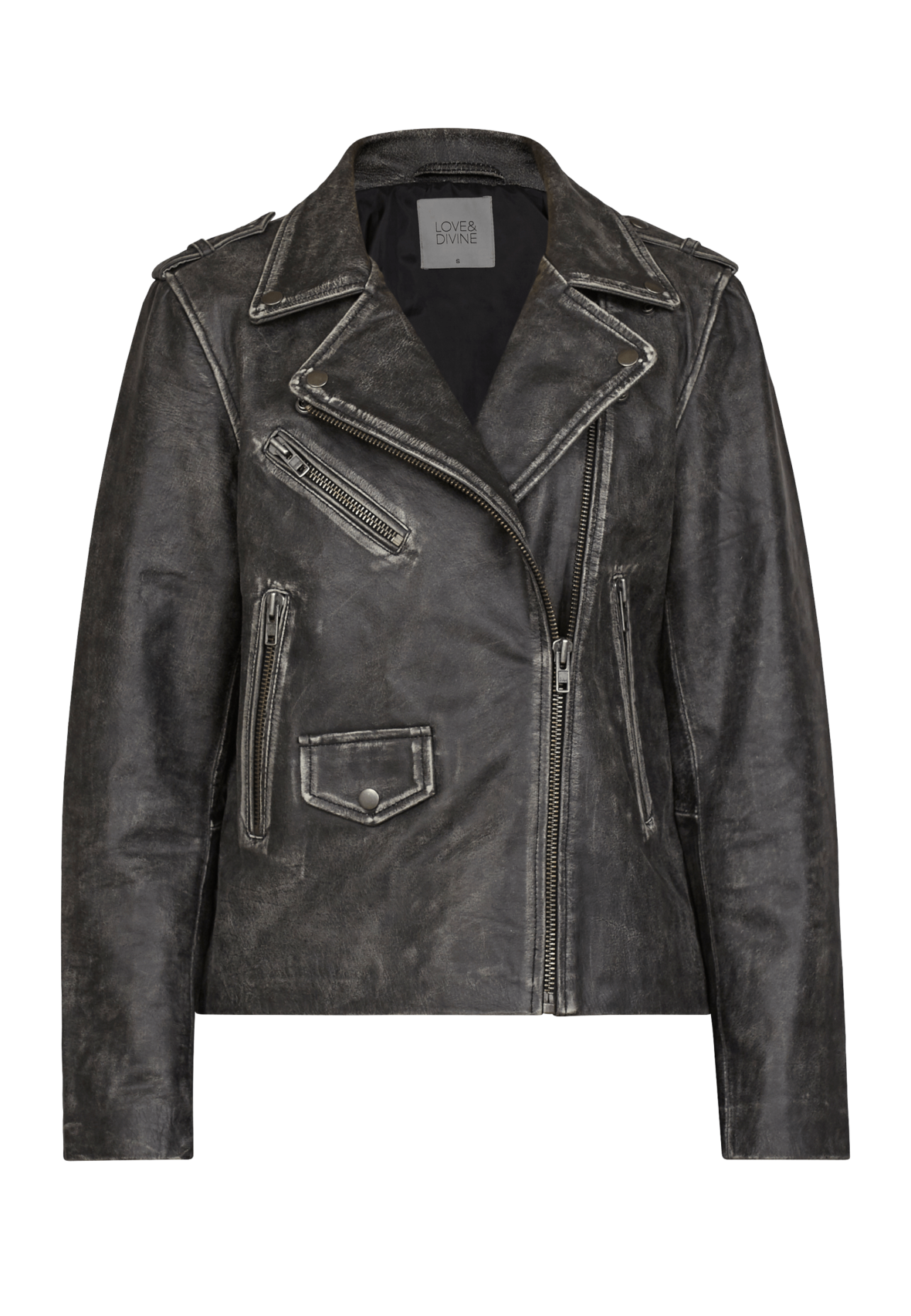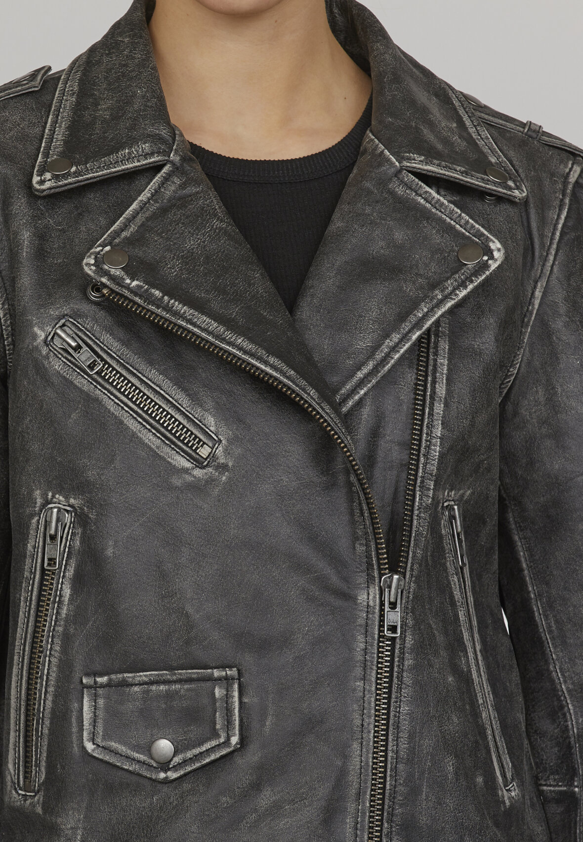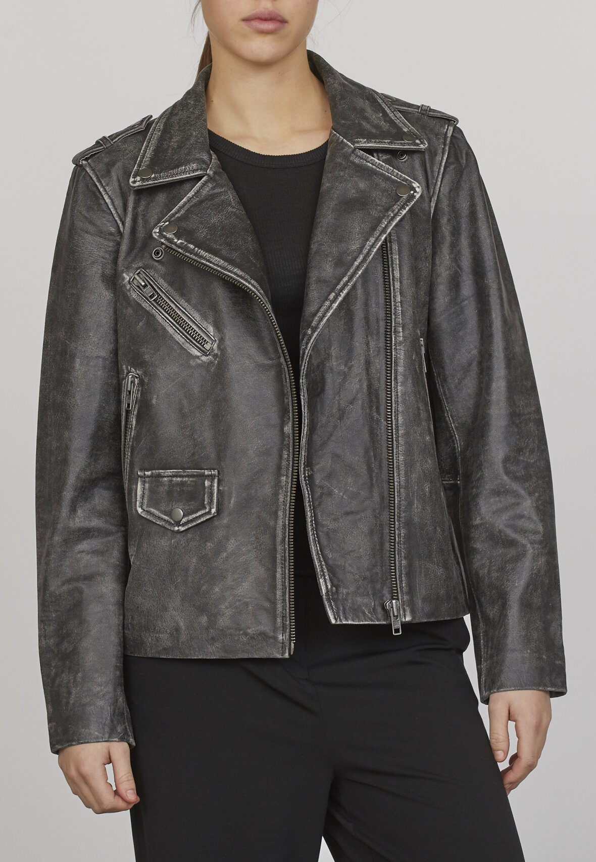 love1082 er en super cool læderjakke i en rå vask. Læderjakken har klassiske lynlåsdetaljer, og har et oversize fit. Modellen er 178 cm høj, og har størrelse S på.