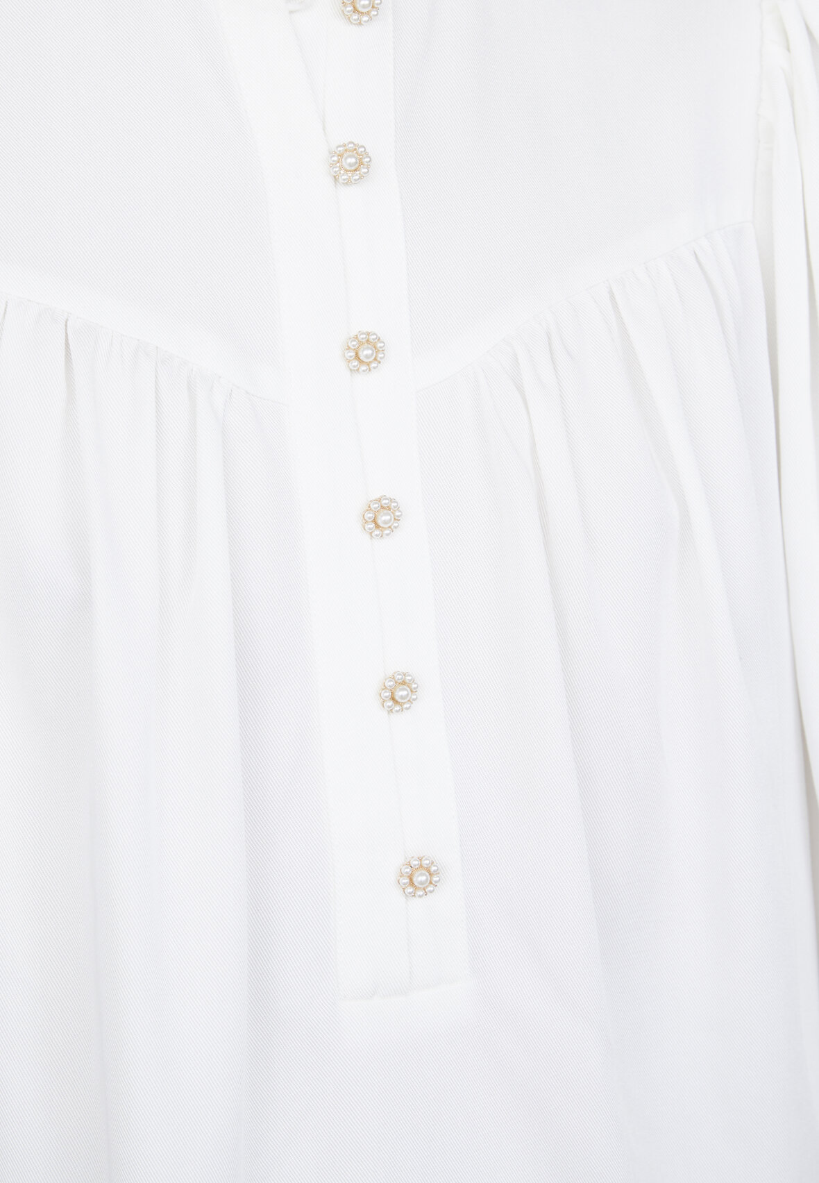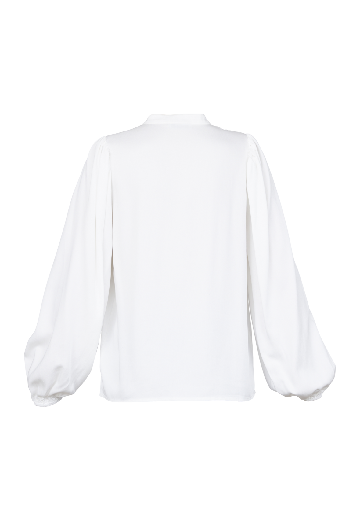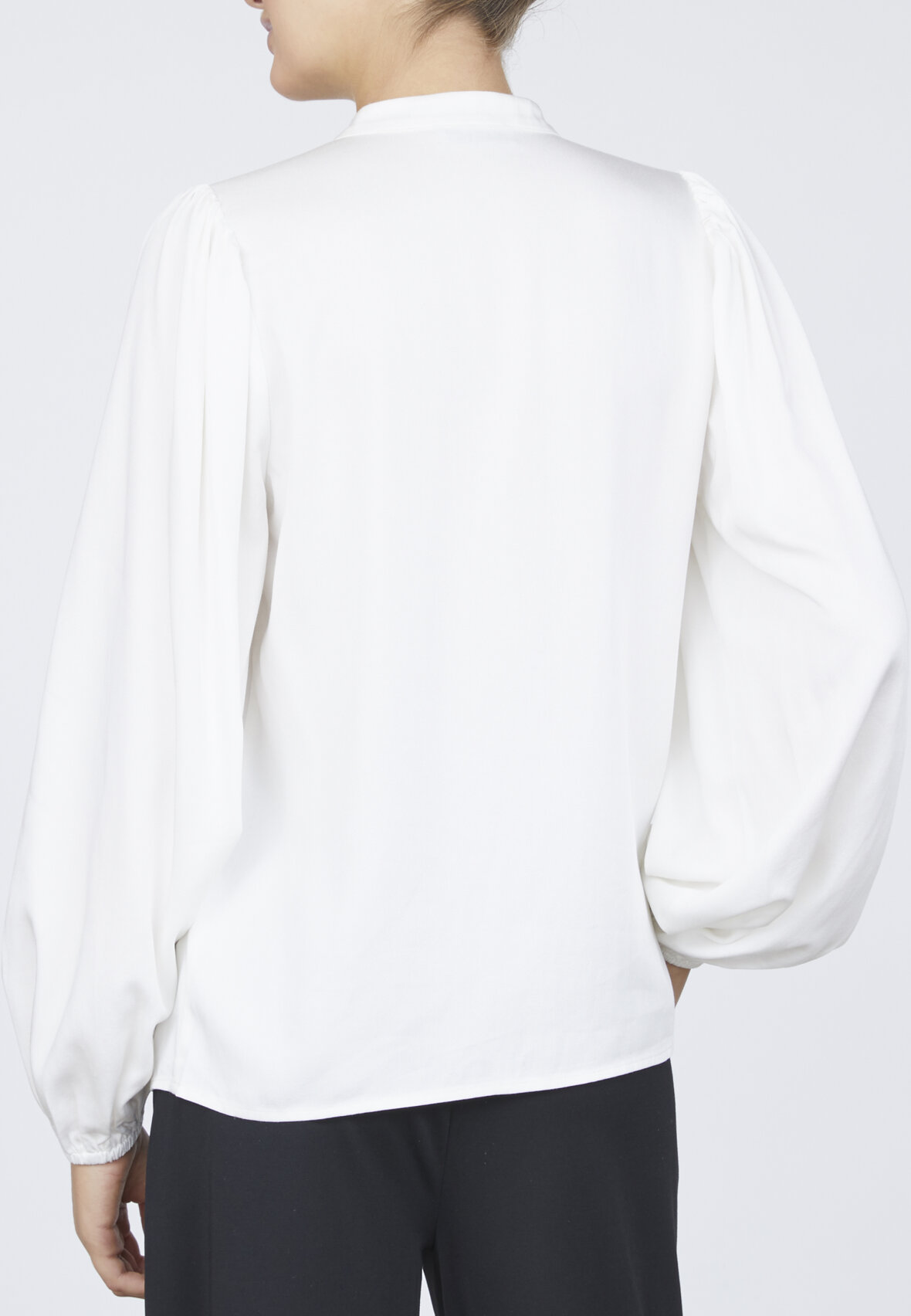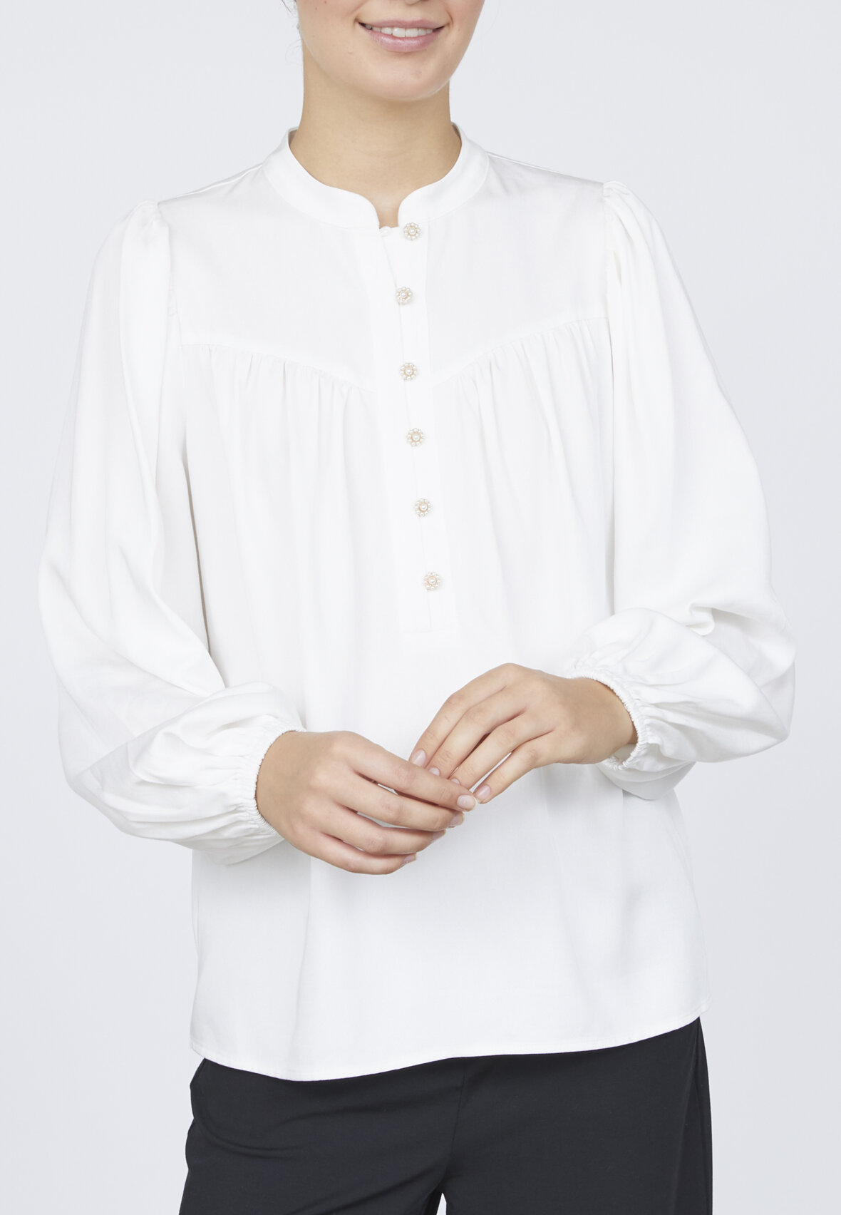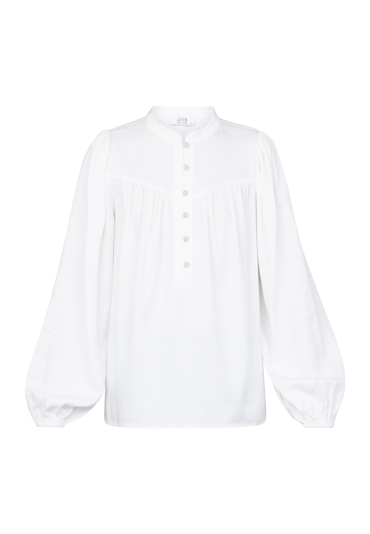 love791-3 er en ensfarvet bluse med en løs og luftig pasform. Blusen har lange pufærmer med elastik forneden og en knaplukning med perleknapper ved halsudskæringen. Modellen er 178 cm høj, og har størrelse S på.