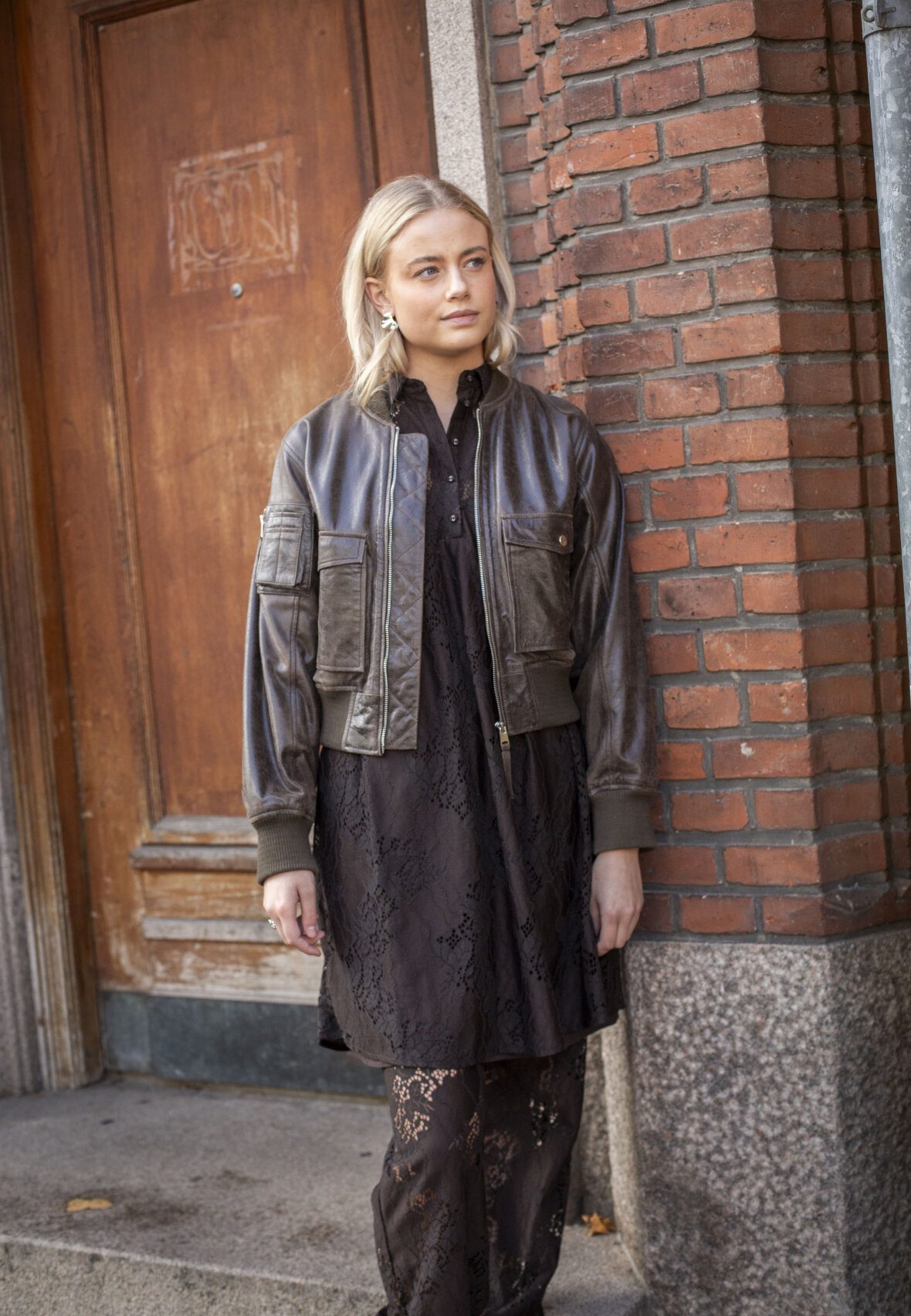 love441-39 er en knælang kjole i en gennemsigtig blondekvalitet med en klassisk krave, 3/4 lange ærmer og gennemgående knaplukning foran. Modellen har en str. S på.