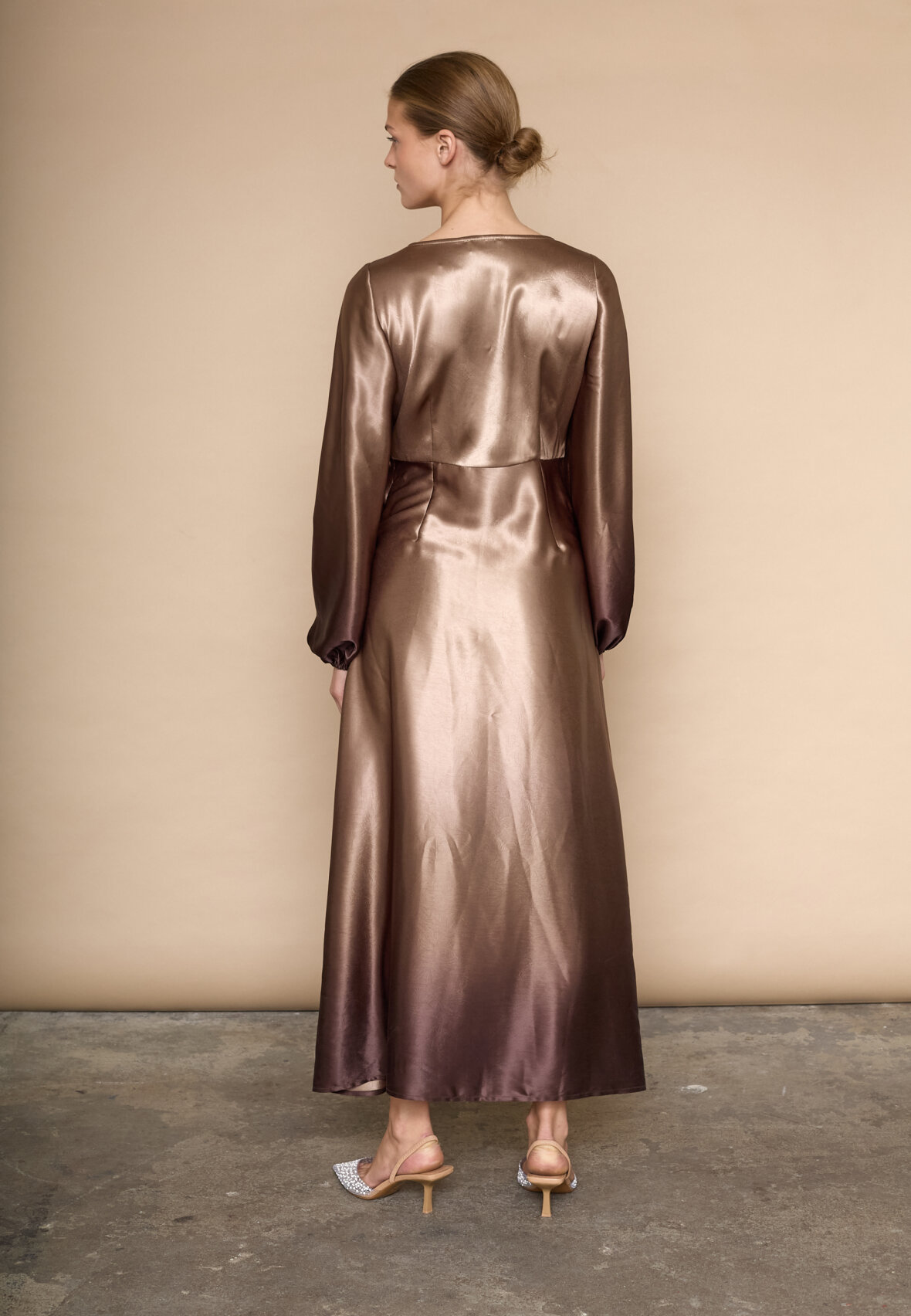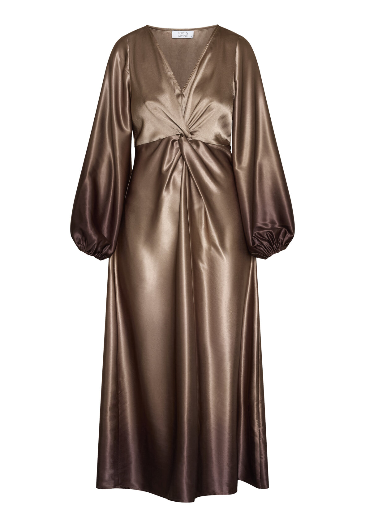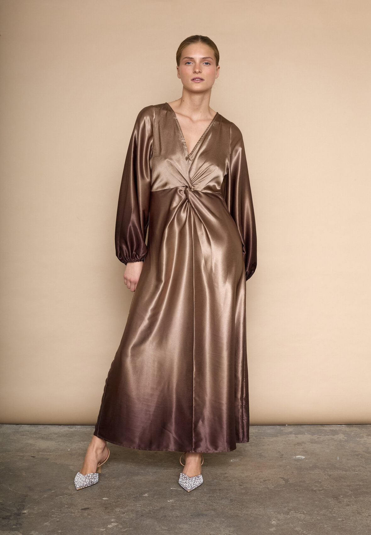 love1404 er en elegant, draperet kjole i et glat, skinnende materiale. Kjolen har en V-halsudskæring, lange, voluminøse ærmer og en asymmetrisk slids i siden. Modellen har en str. S på.