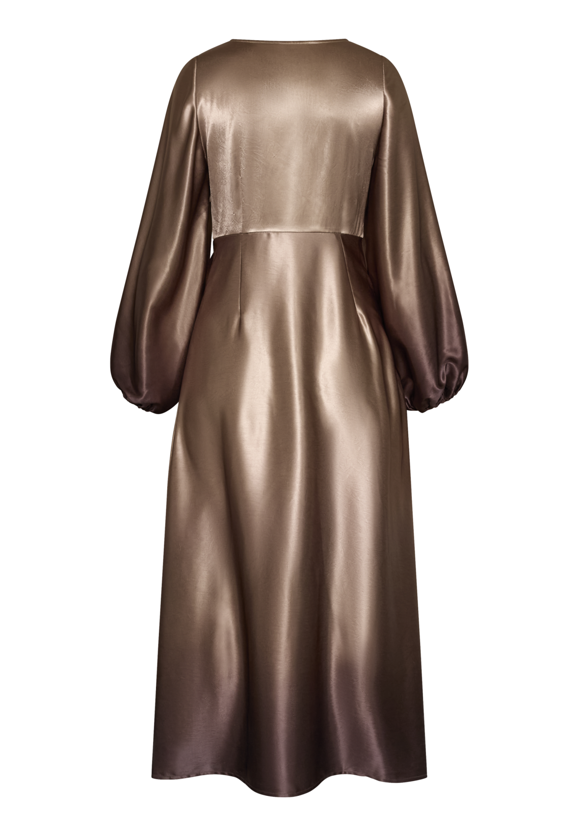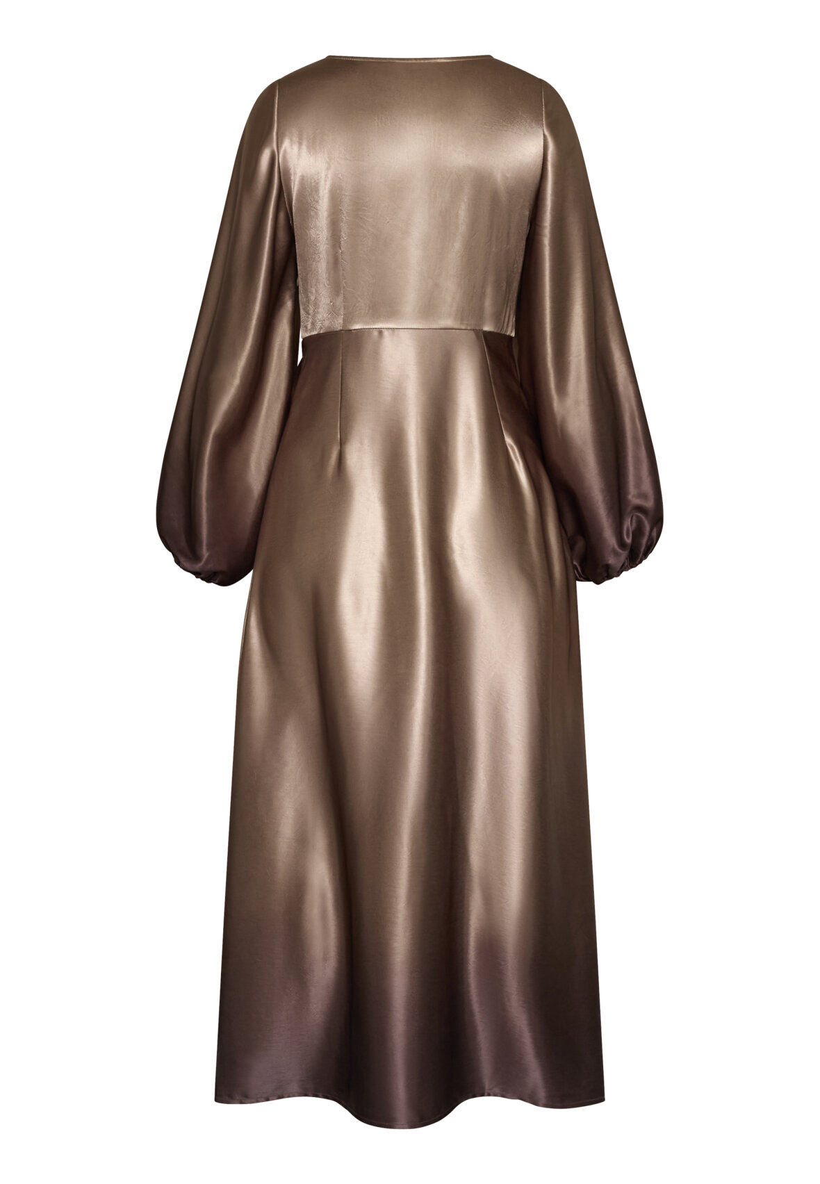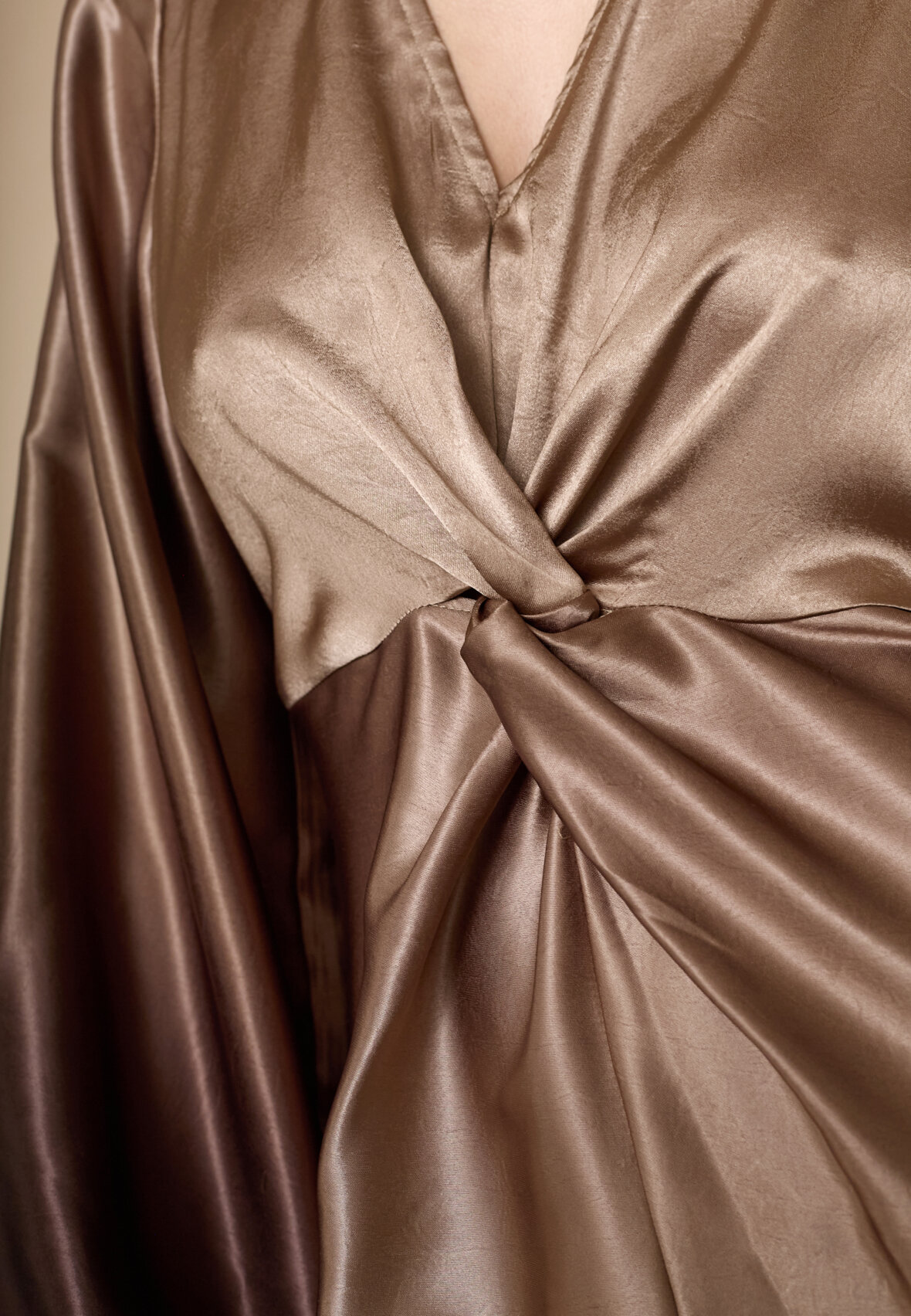 love1404 er en elegant, draperet kjole i et glat, skinnende materiale. Kjolen har en V-halsudskæring, lange, voluminøse ærmer og en asymmetrisk slids i siden. Modellen har en str. S på.