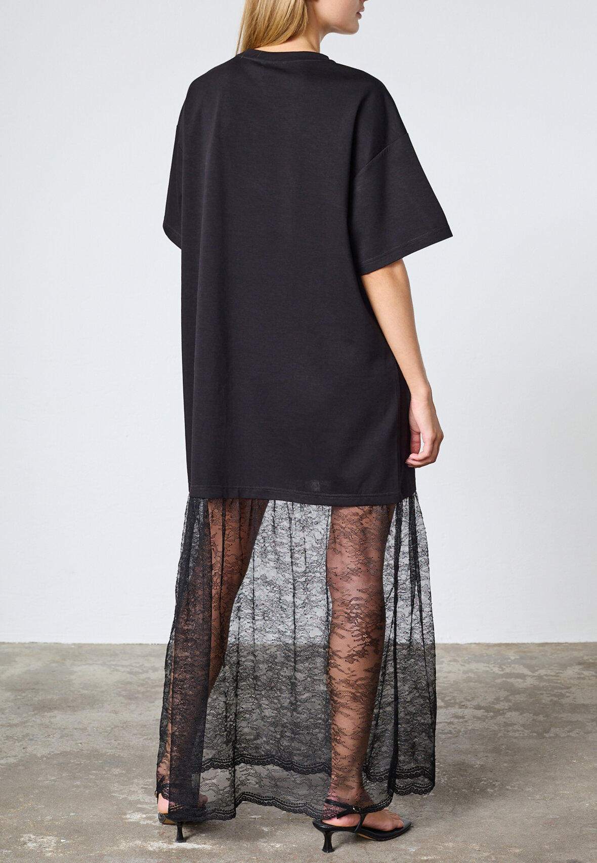 love1447 er en lang kjole med lette, korte ærmer. Den har blonder i bunden. Modellen har en str. S på