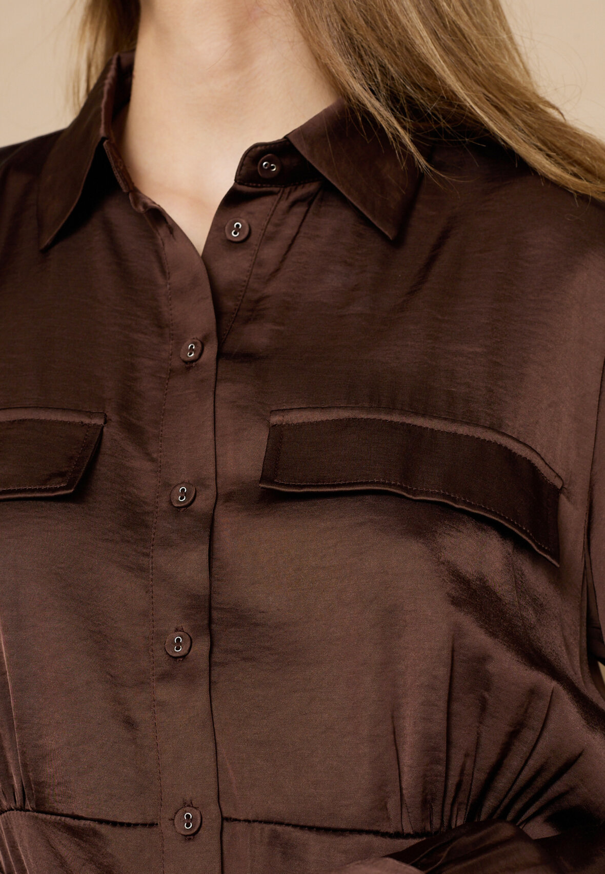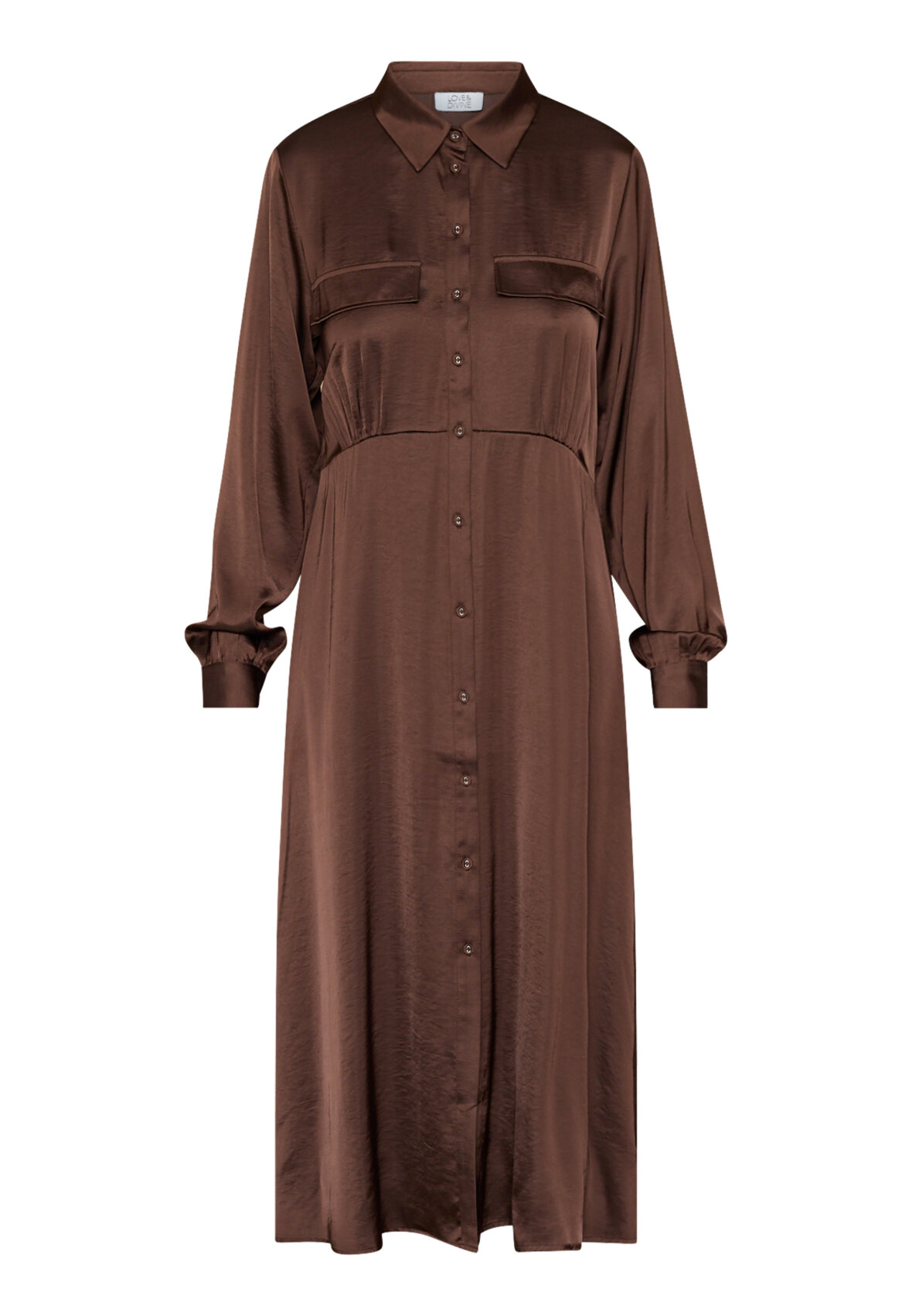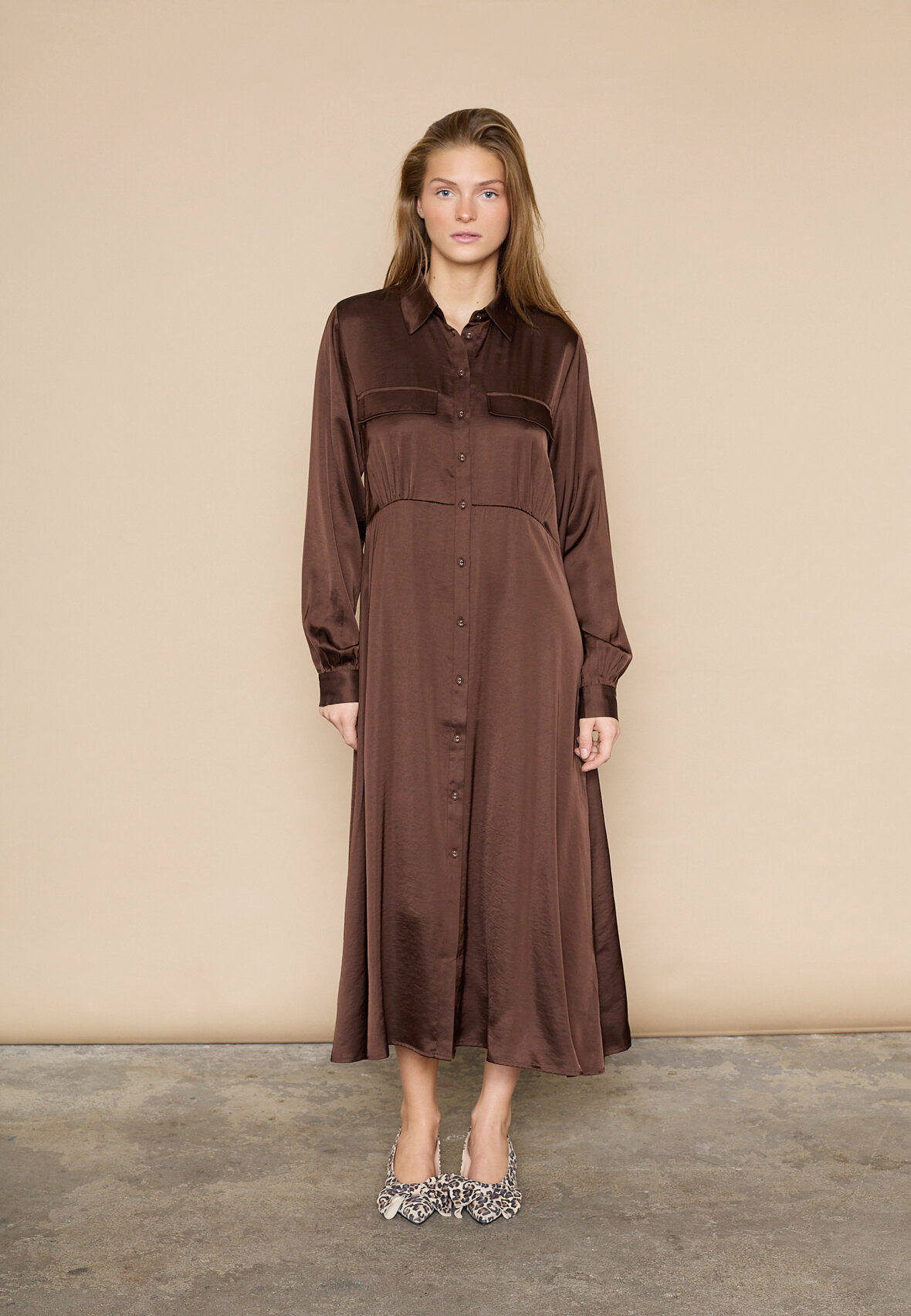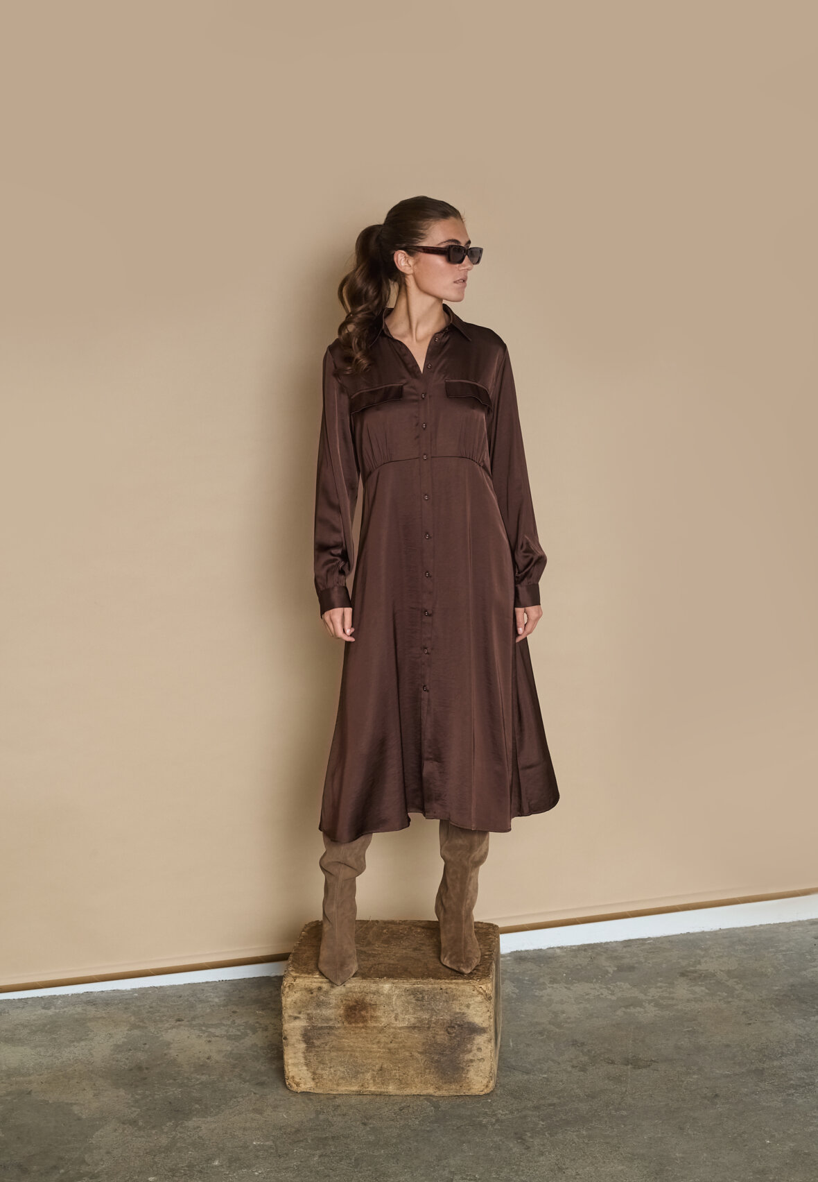 love1420-1 er en elegant lang kjole med klassisk skjortekrave, knaplukning, brystlomme og en flatterende pasform i taljen. Modellen har størrelse S