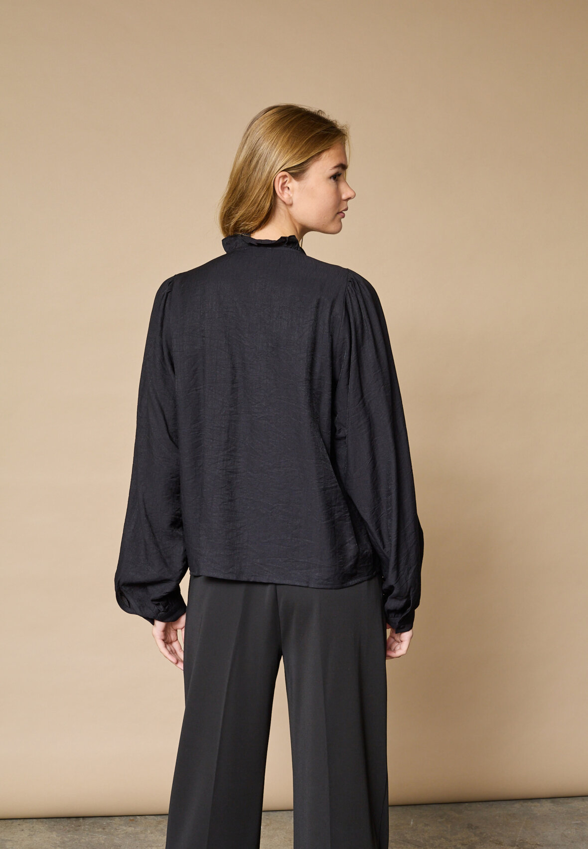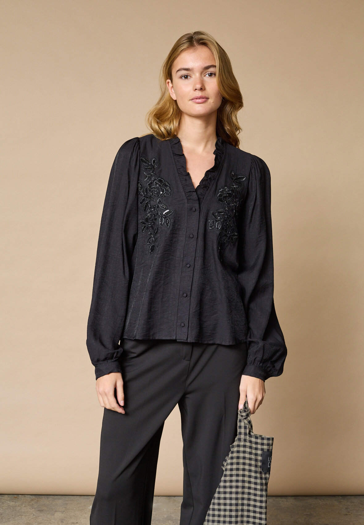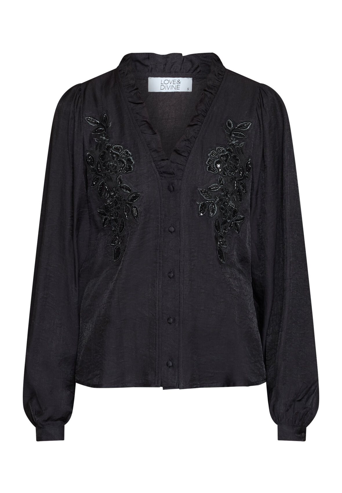 love1483 er en feminin bluse med paliet og perle detaljer. Blusen har lange ærmer, v-hals og knappelukning. Modellen har en str. S på.