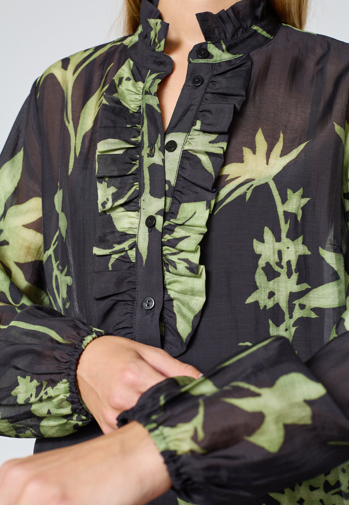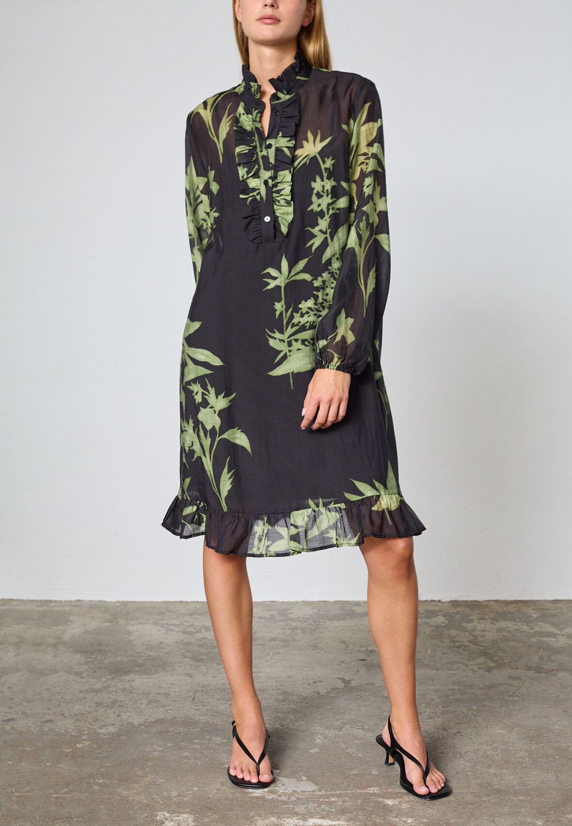 love1449 er en kjole med lange ærmer med rynker og et abstrakt print. Den har en lille stående krave med flæser, rynkede manchetter og en knaplukning. Modellen har en str. S på