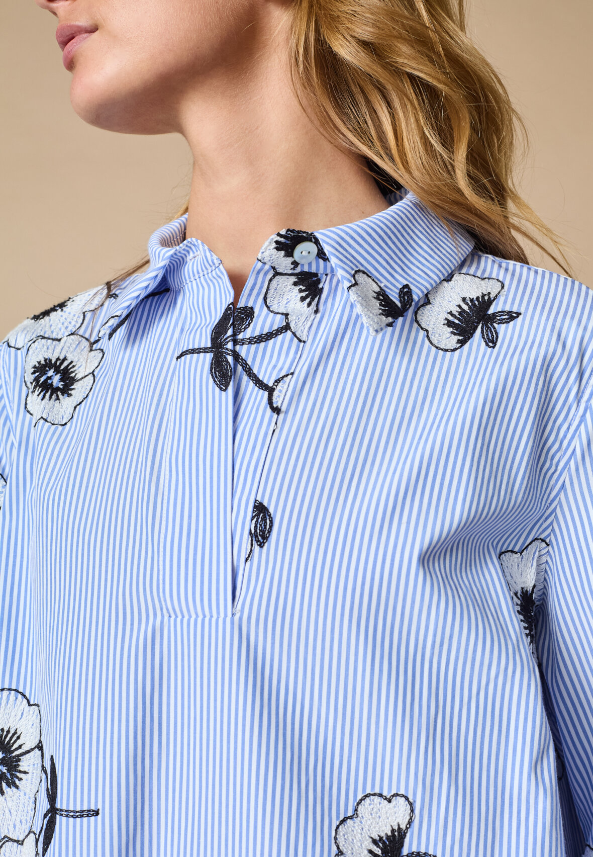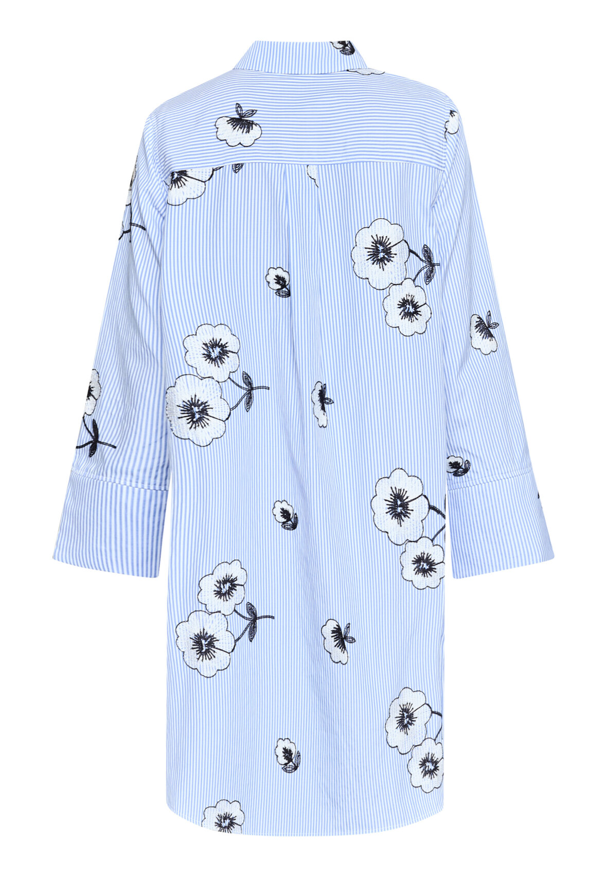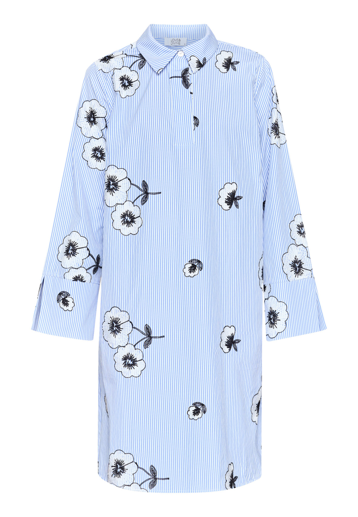 love1476 er en stribet skjortekjole med et unikt blomster broderi. Kjolen har lange voluminøse ærmer, klassisk krave og knaplukning. Modellen har størrelse S på.