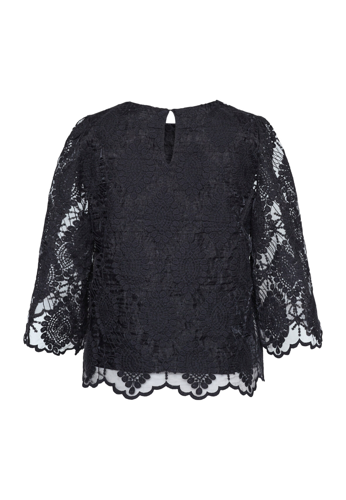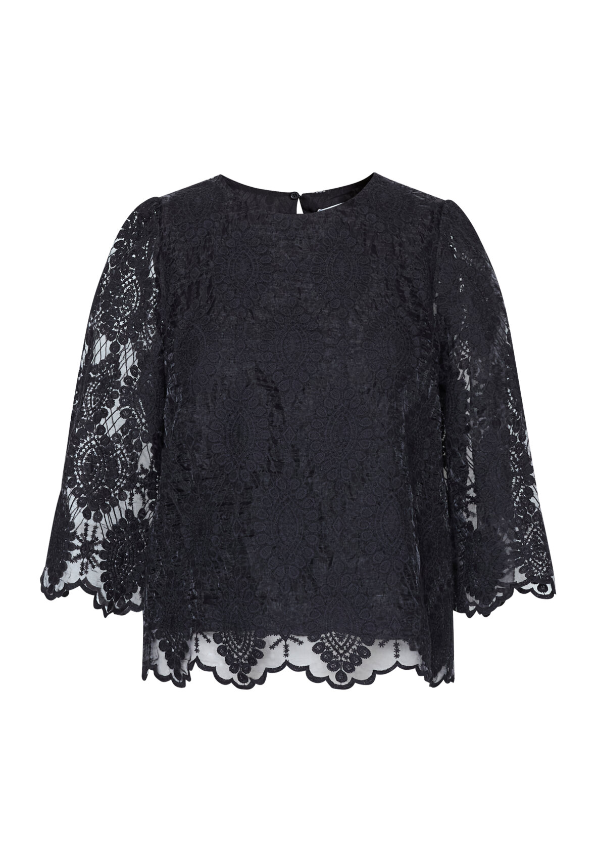 love1498 er en feminin blonde bluse. Blusen har trekvartlange ærmer der er afsluttet af en fin blondekant. Modellen har en str. S på.