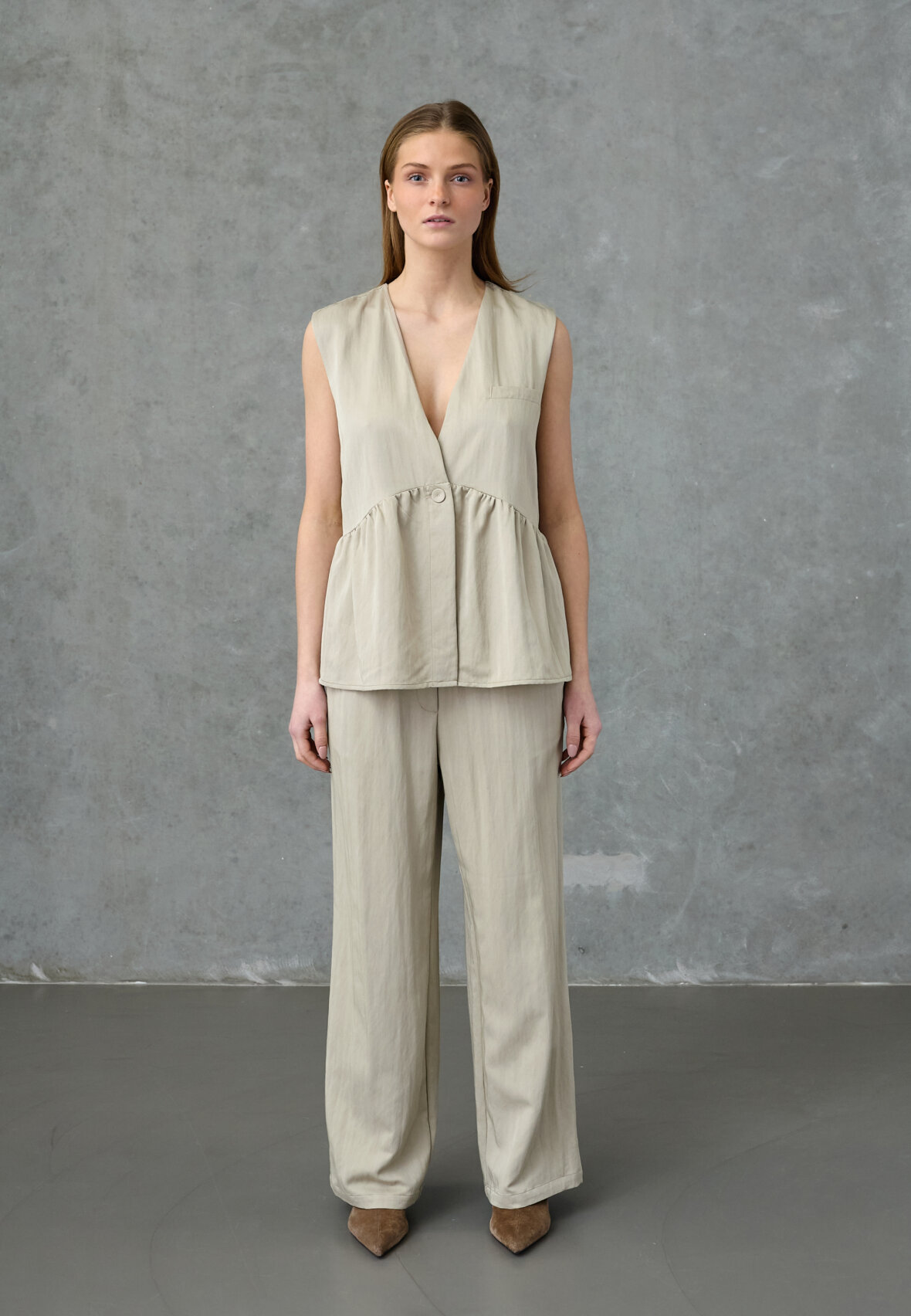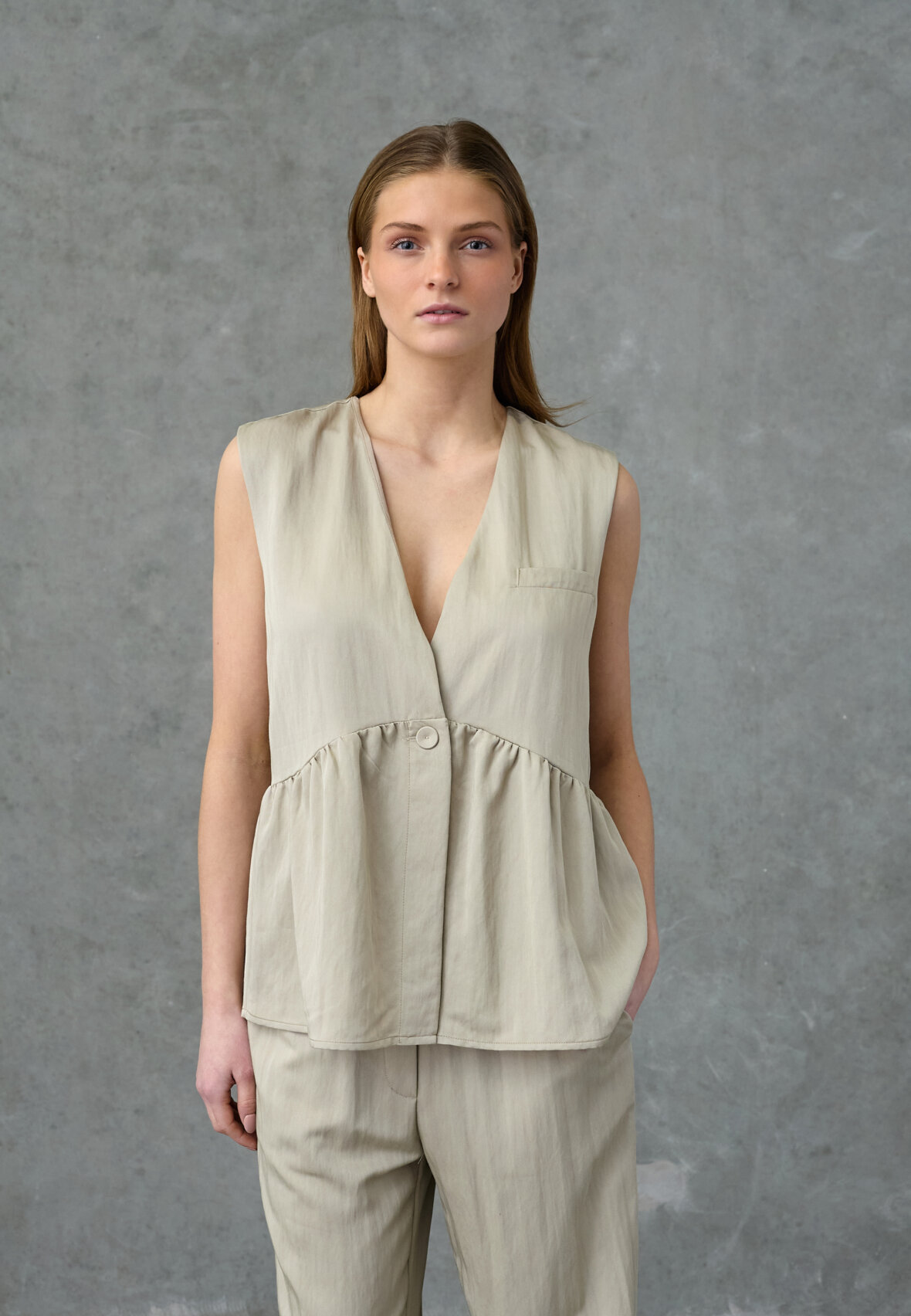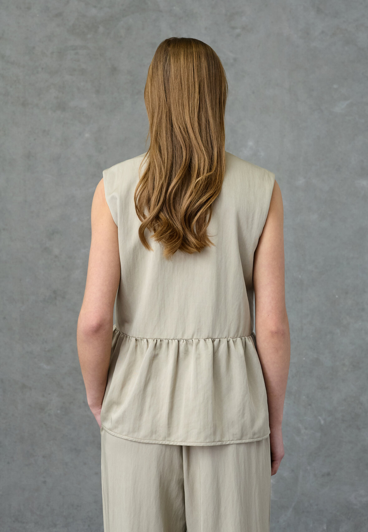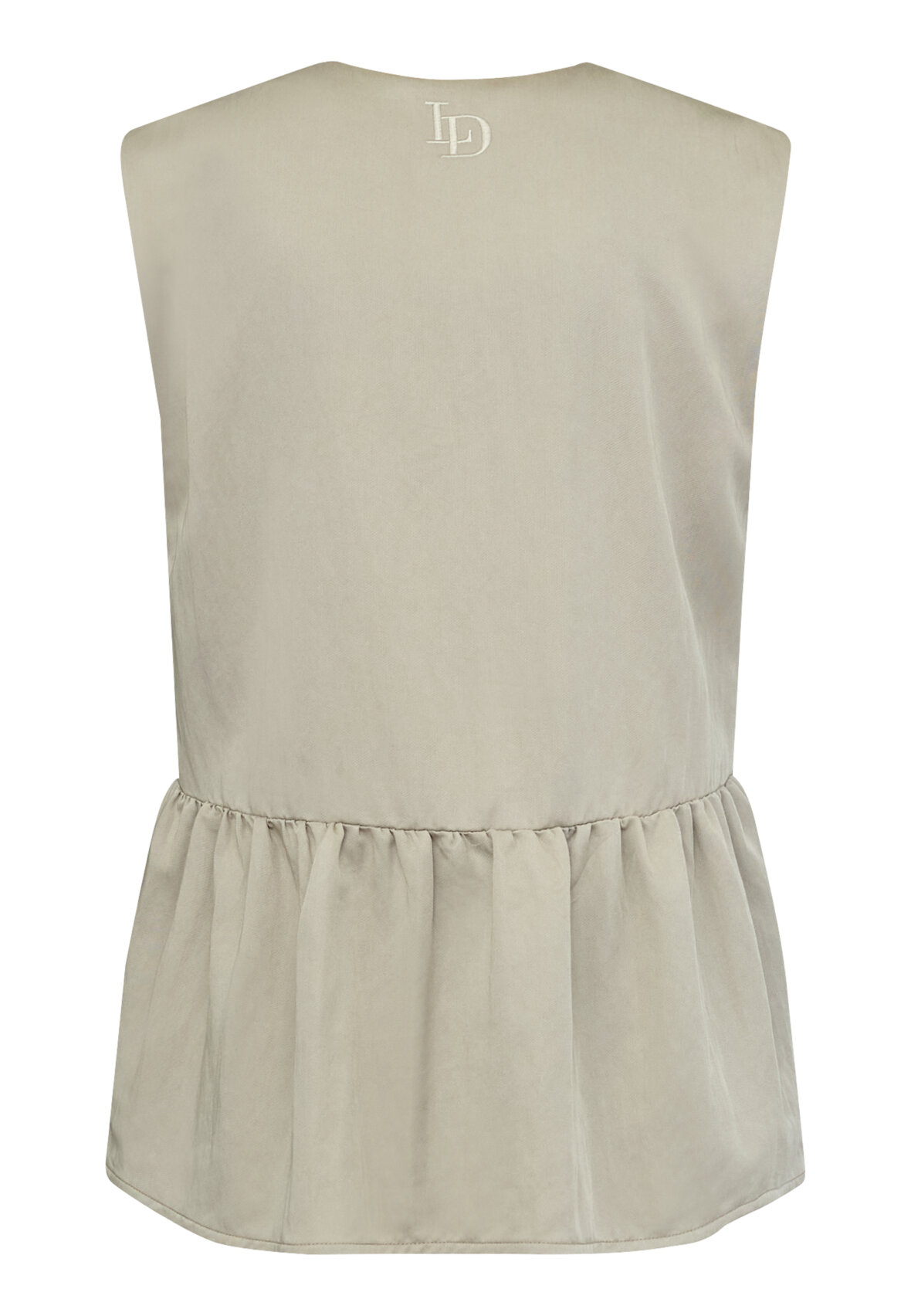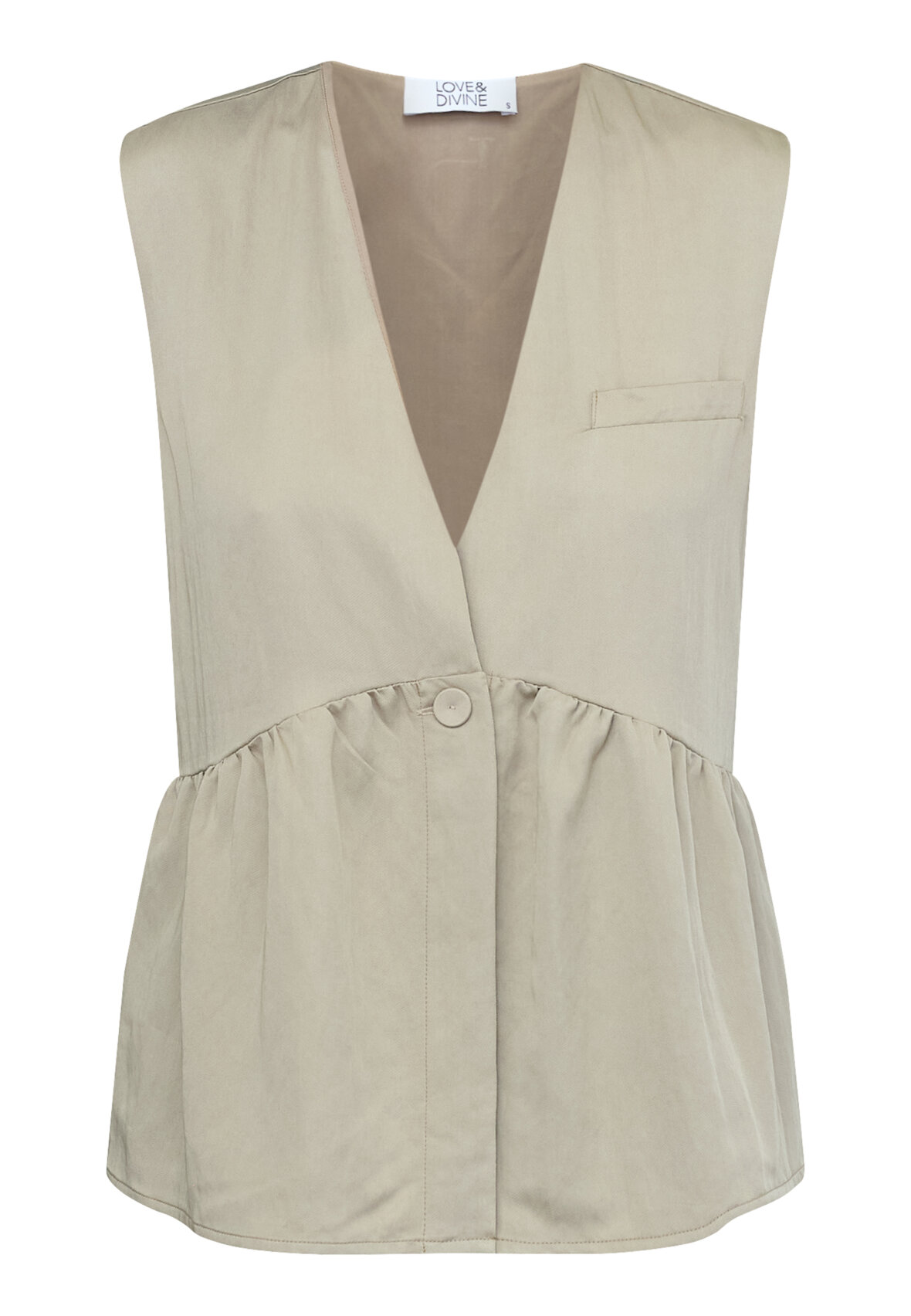love1478 er en top uden ærmer. Toppen har en enkelt knaplukning og en flæsedetalje under brystet. Modellen har en str. S på.