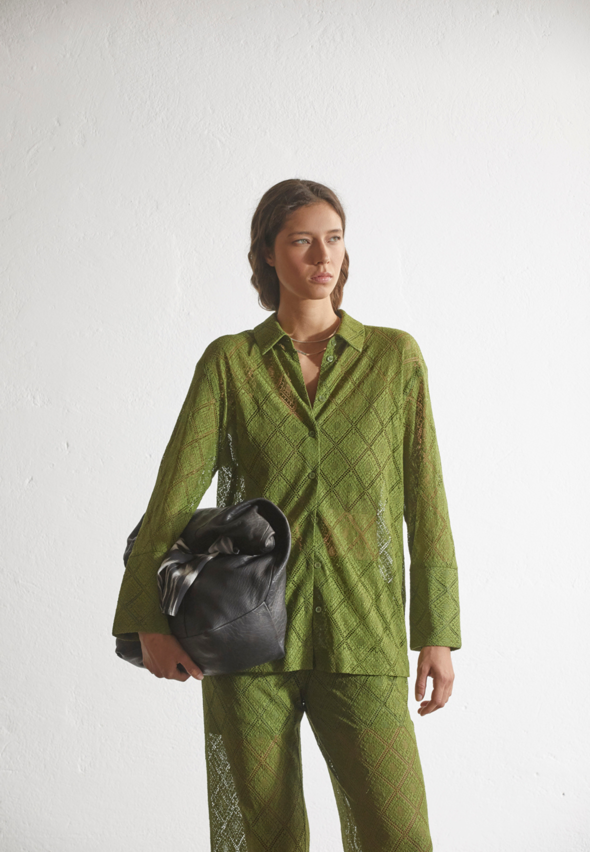 love1439 er en overdel med lange ærmer med brede, rynkede manchetter. Den har en v-hals og knaplukning, med et overordnet mønster. Modellen har en str. S på.