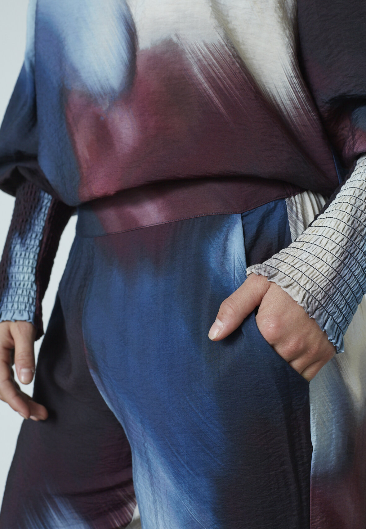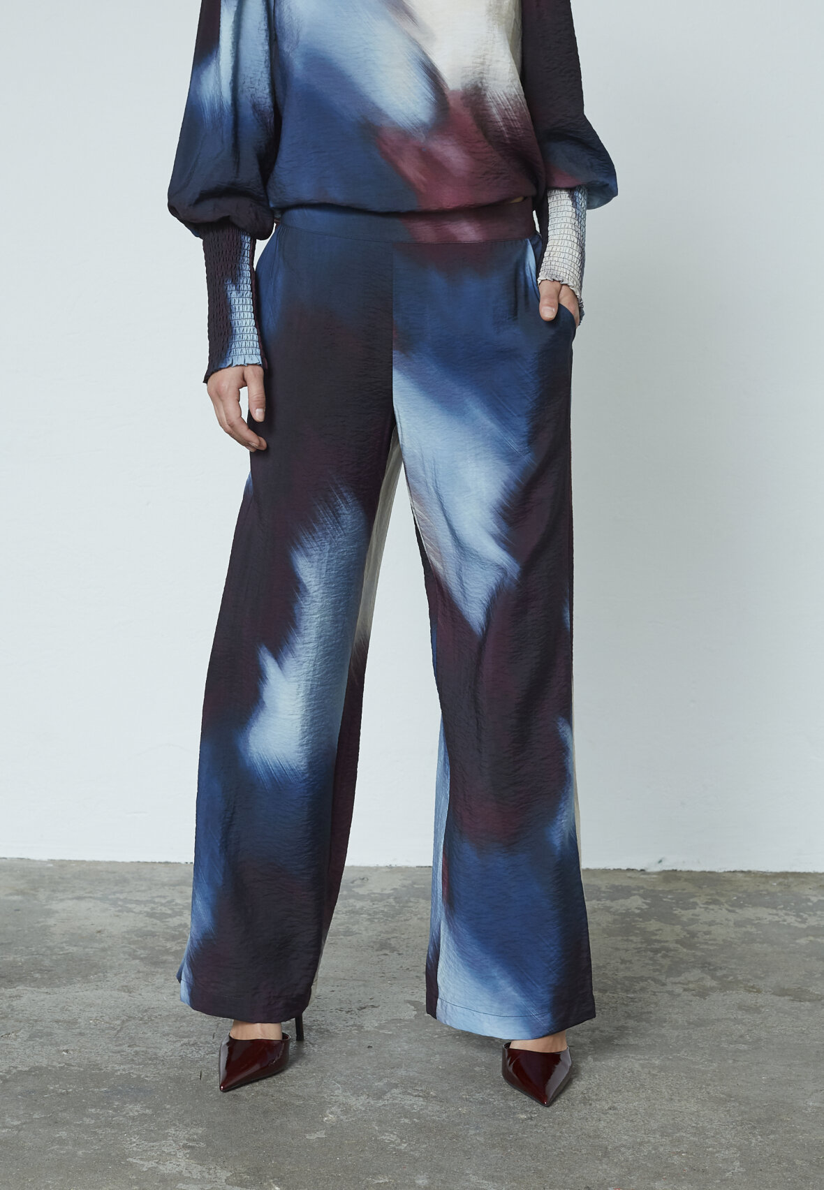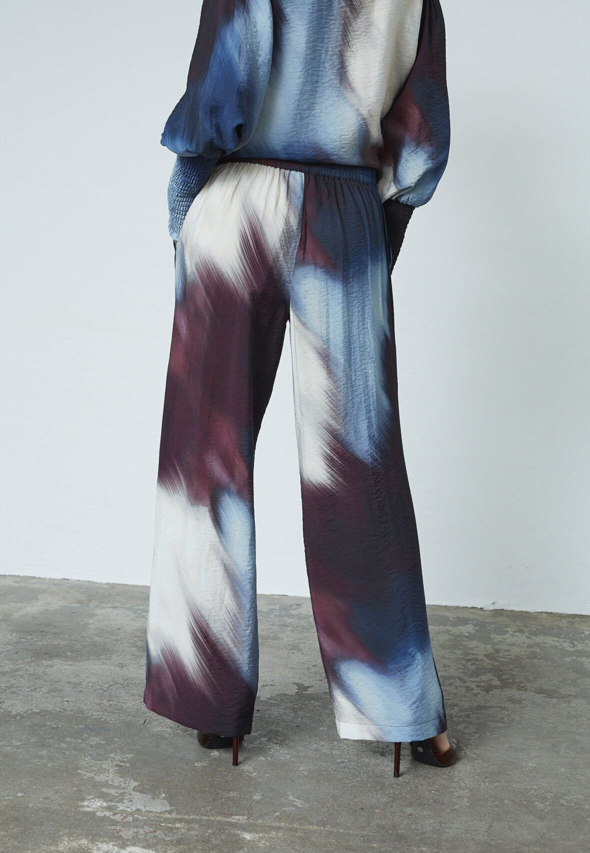 love1024-52 er et par bredbenede, løse bukser med et unikt, abstrakt mønster i blå, lilla og hvide nuancer. Elastik i taljen for en behagelig pasform. Modellen har størrelse S.