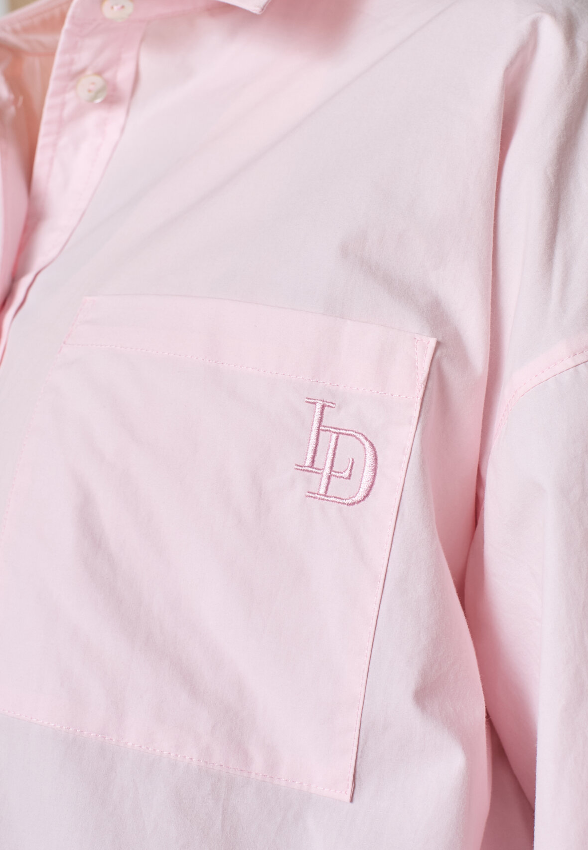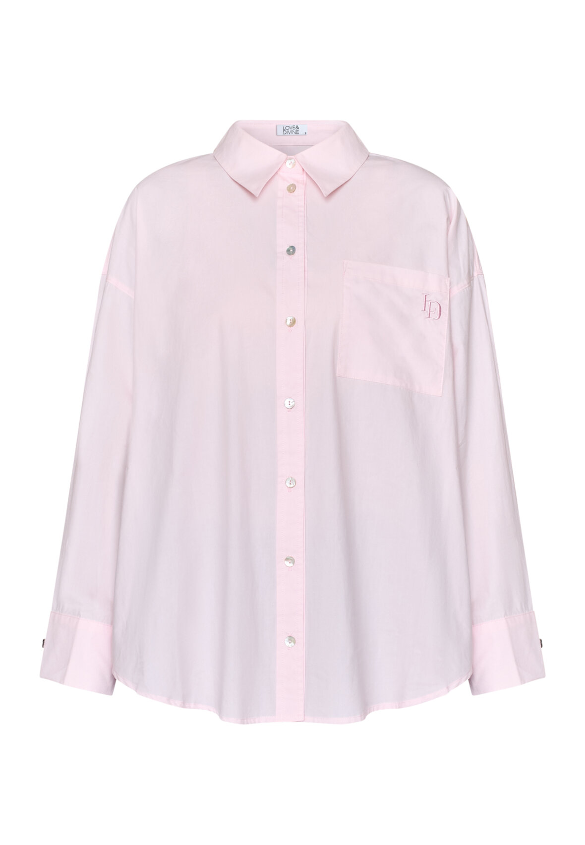 love1518 er en oversized poplin-skjorte i et afslappet boyfriend fit. Skjorten har en klassisk krave, drop shoulders og en elegant brystlomme med diskret logobroderi. Modellen har en str. S på.