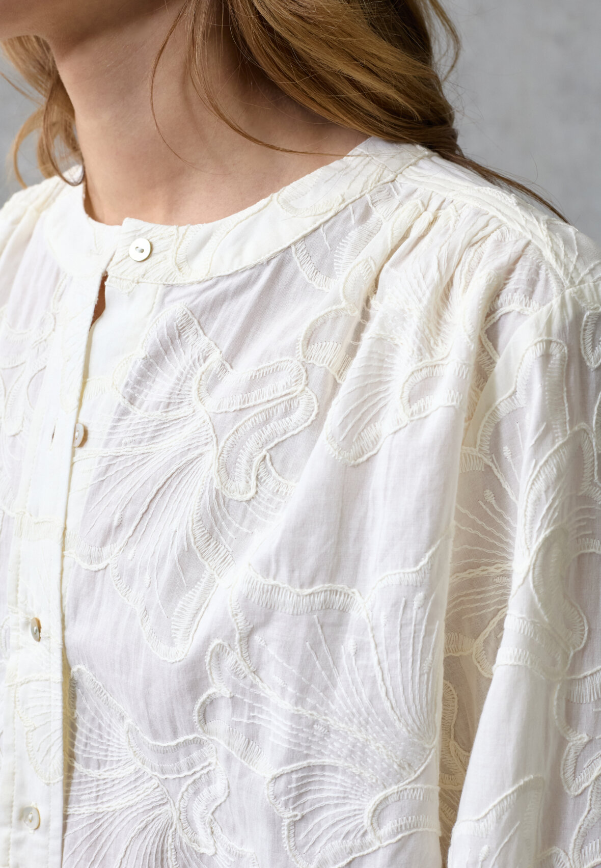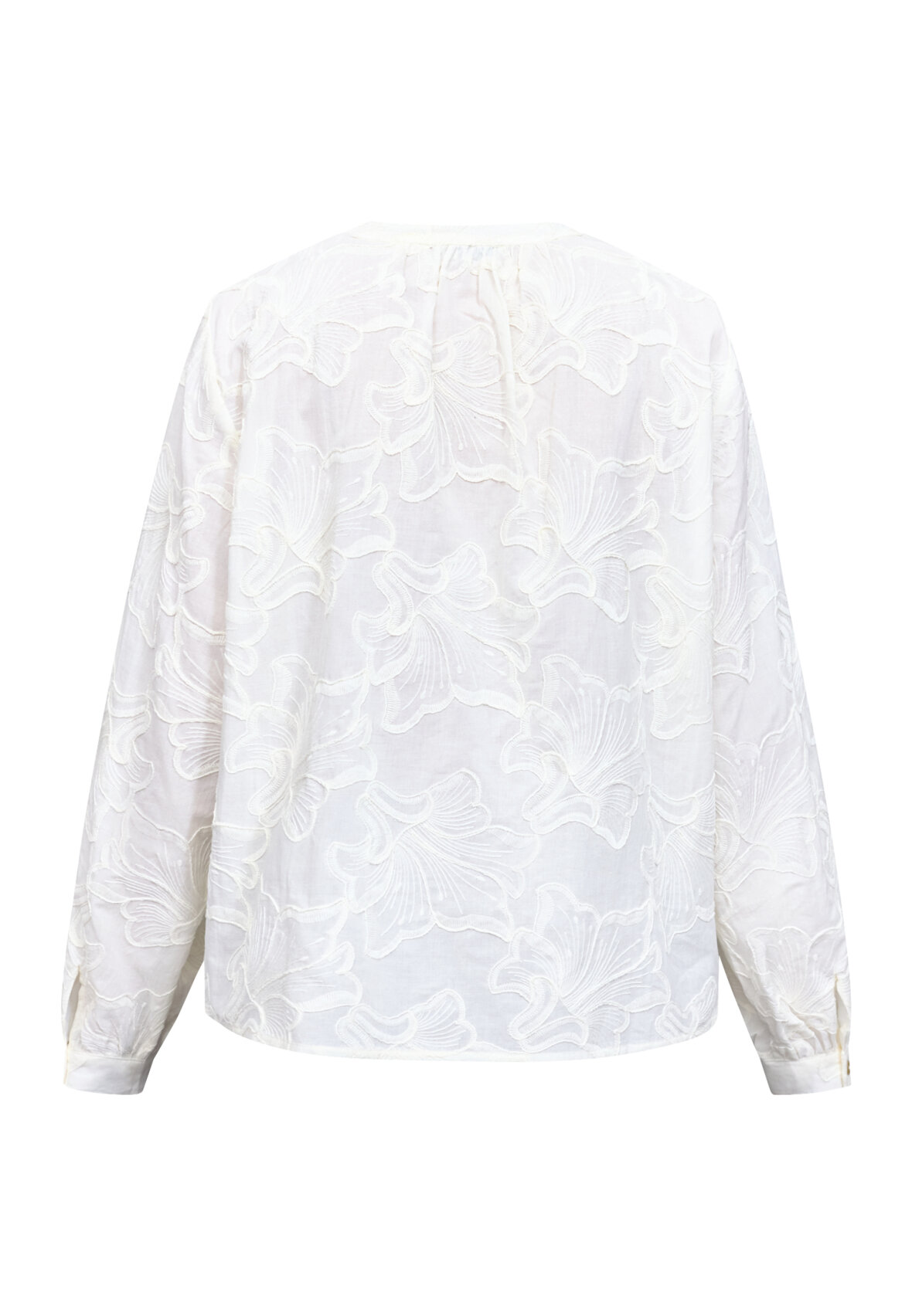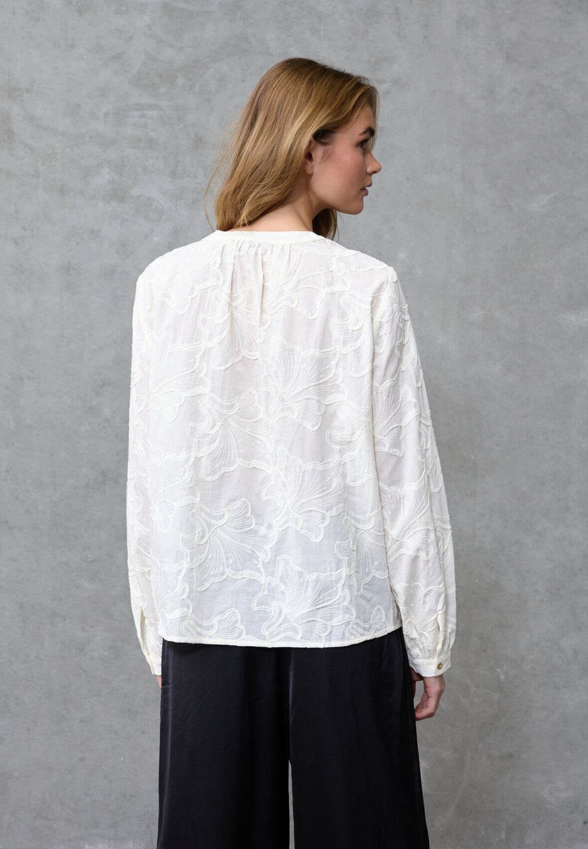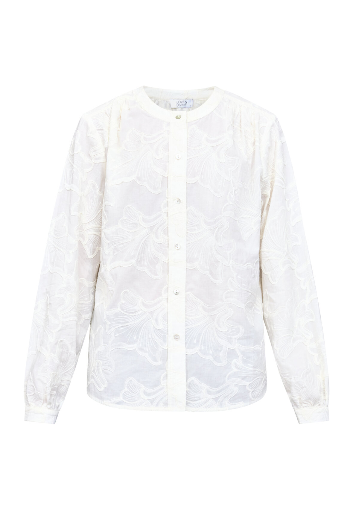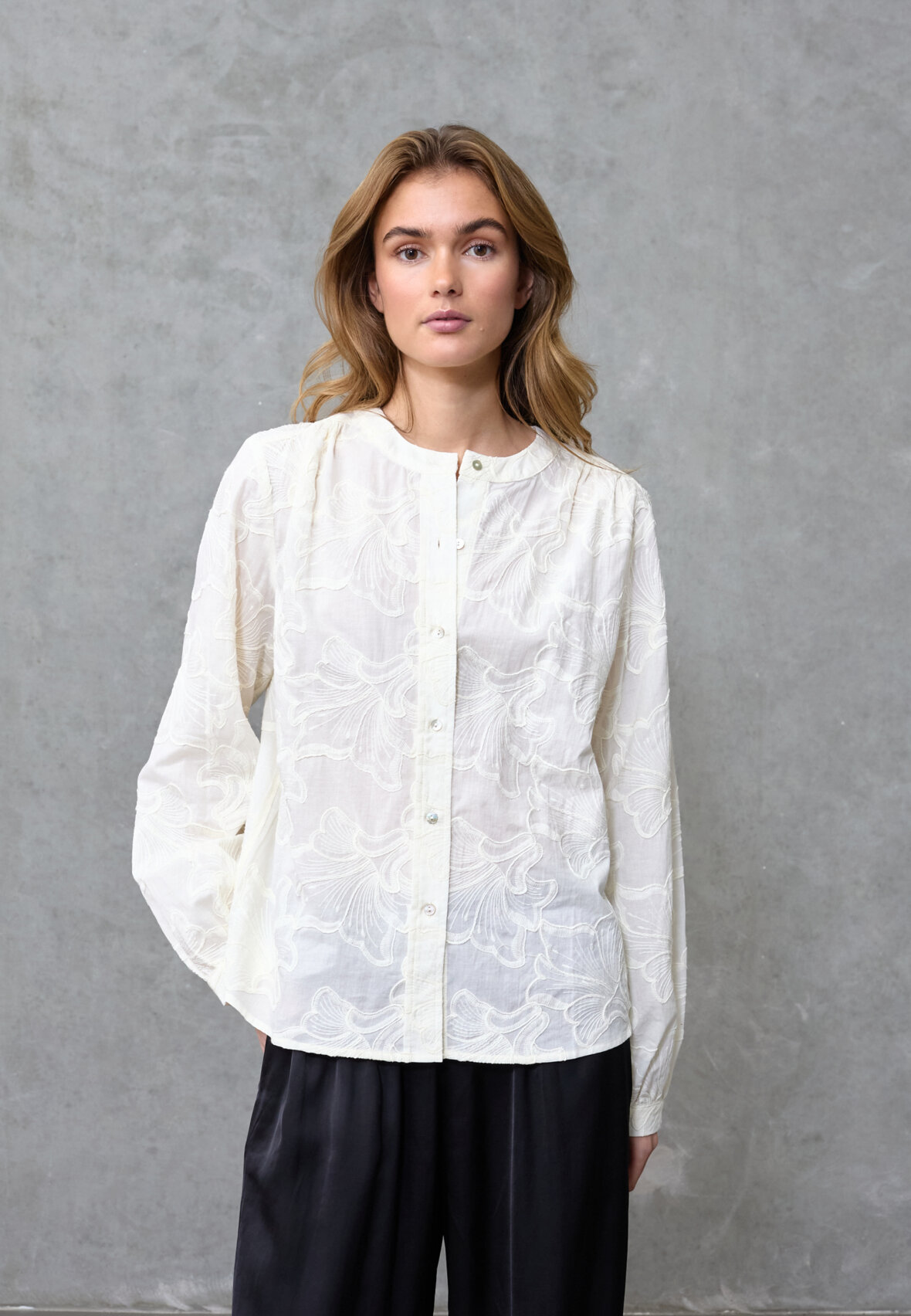 love1519 er en skjortebluse i en let kvalitet med et feminint, tekstureret mønster. Blusen har en gennemknappet front, en diskret kinakrave og voluminøse ærmer med fine detaljer ved manchetterne. Modellen har en str. S på.