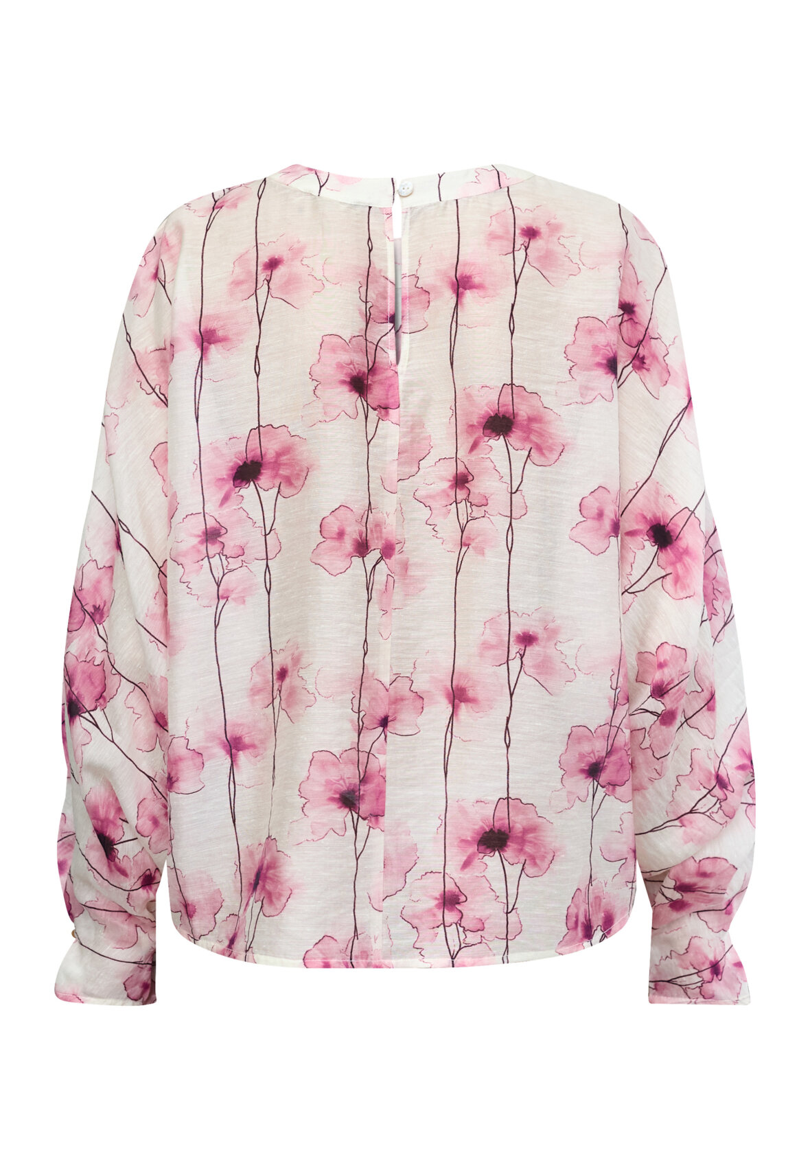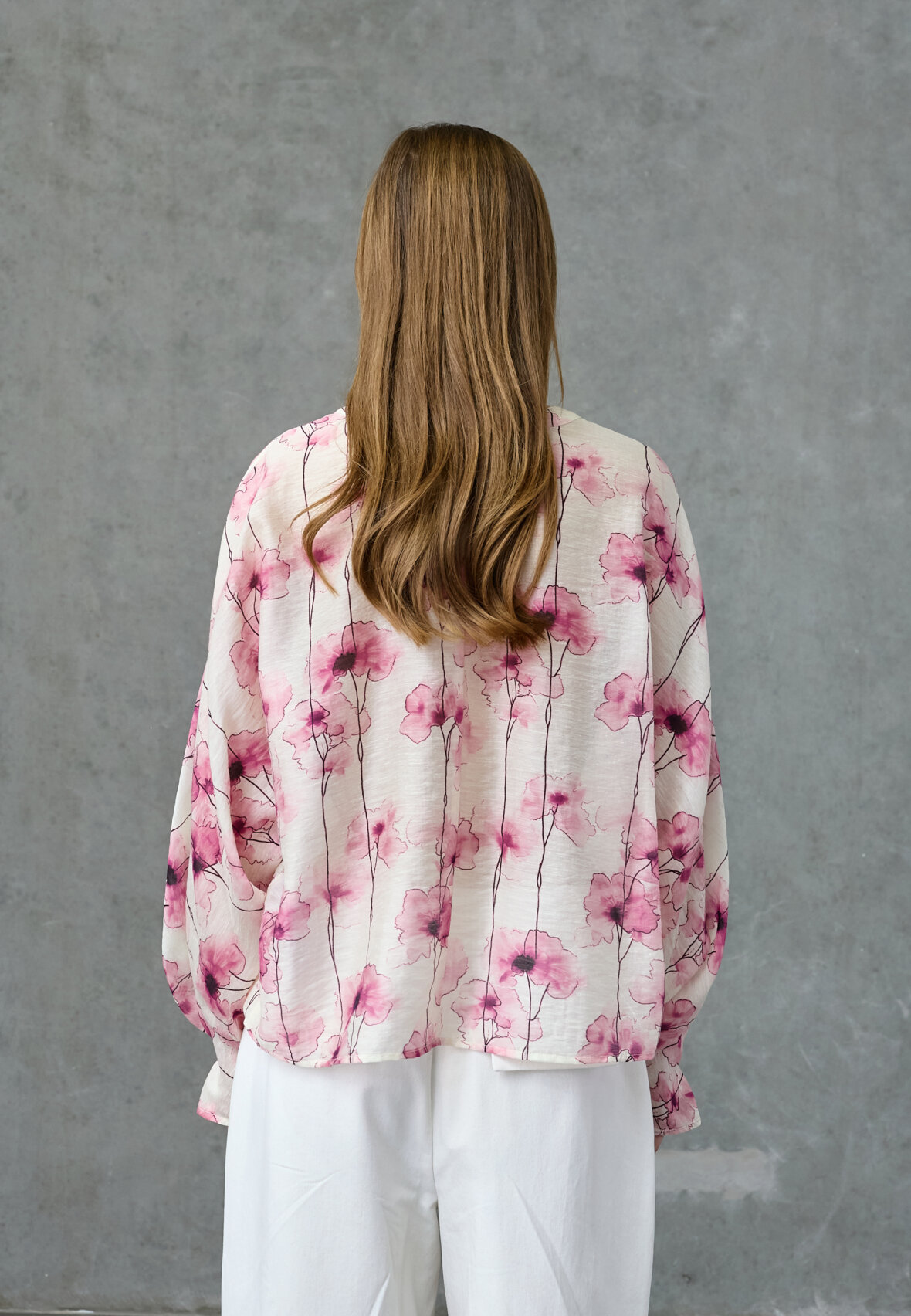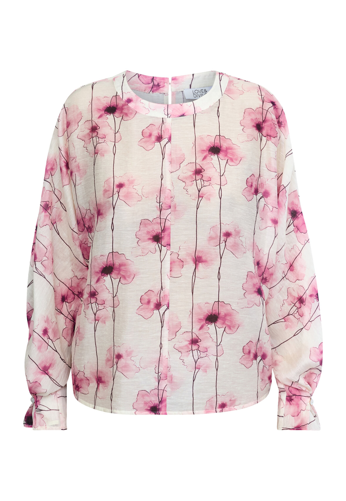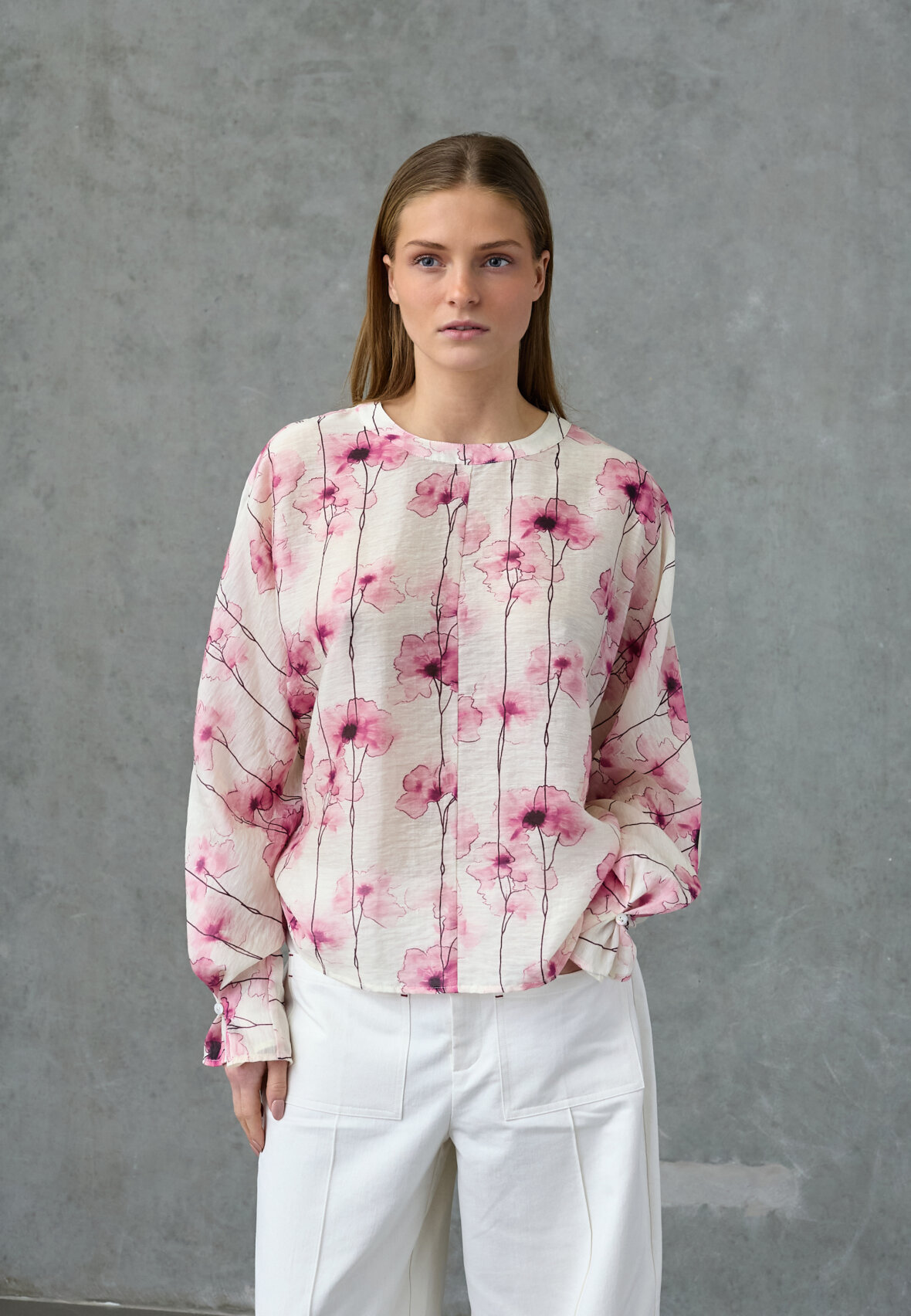 love1551 er en bluse i en let kvalitet med et abstrakt akvarel-print. Toppen har en feminin udskæring og ærmer. Modellen har en str. S på