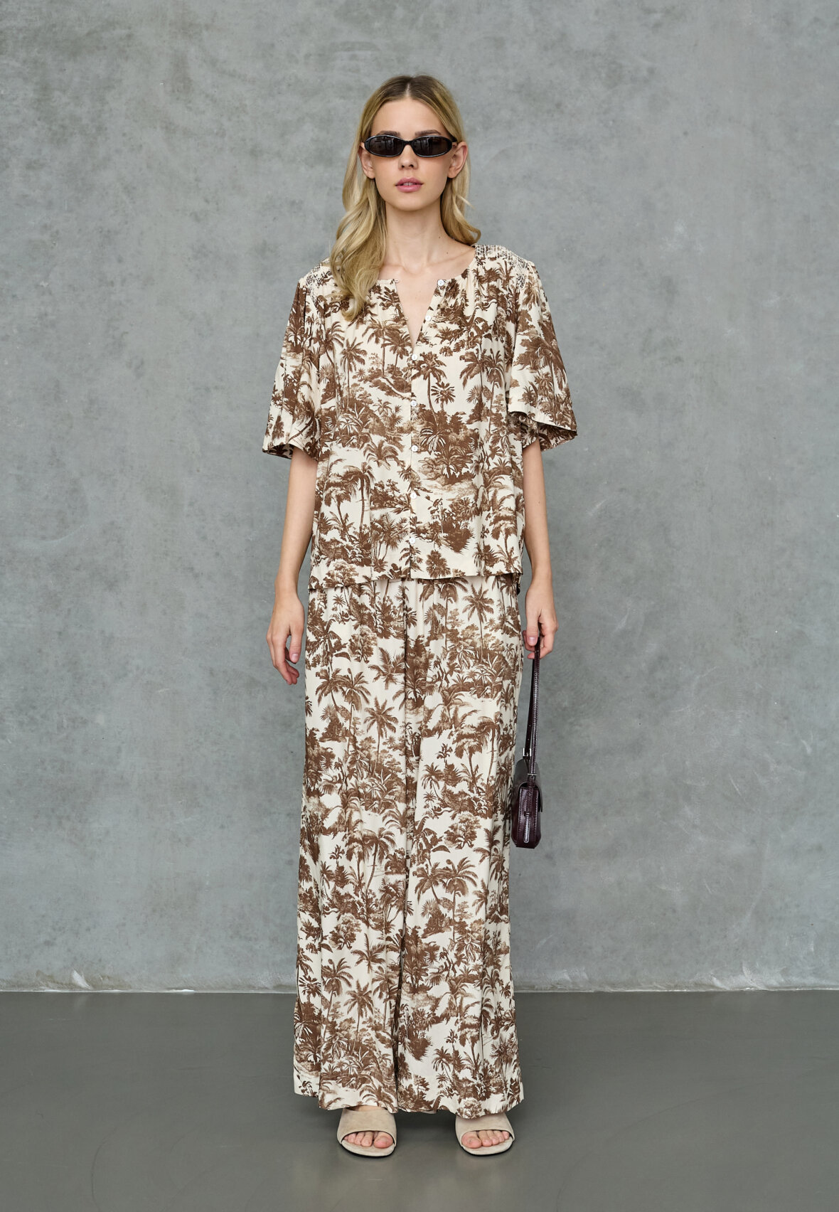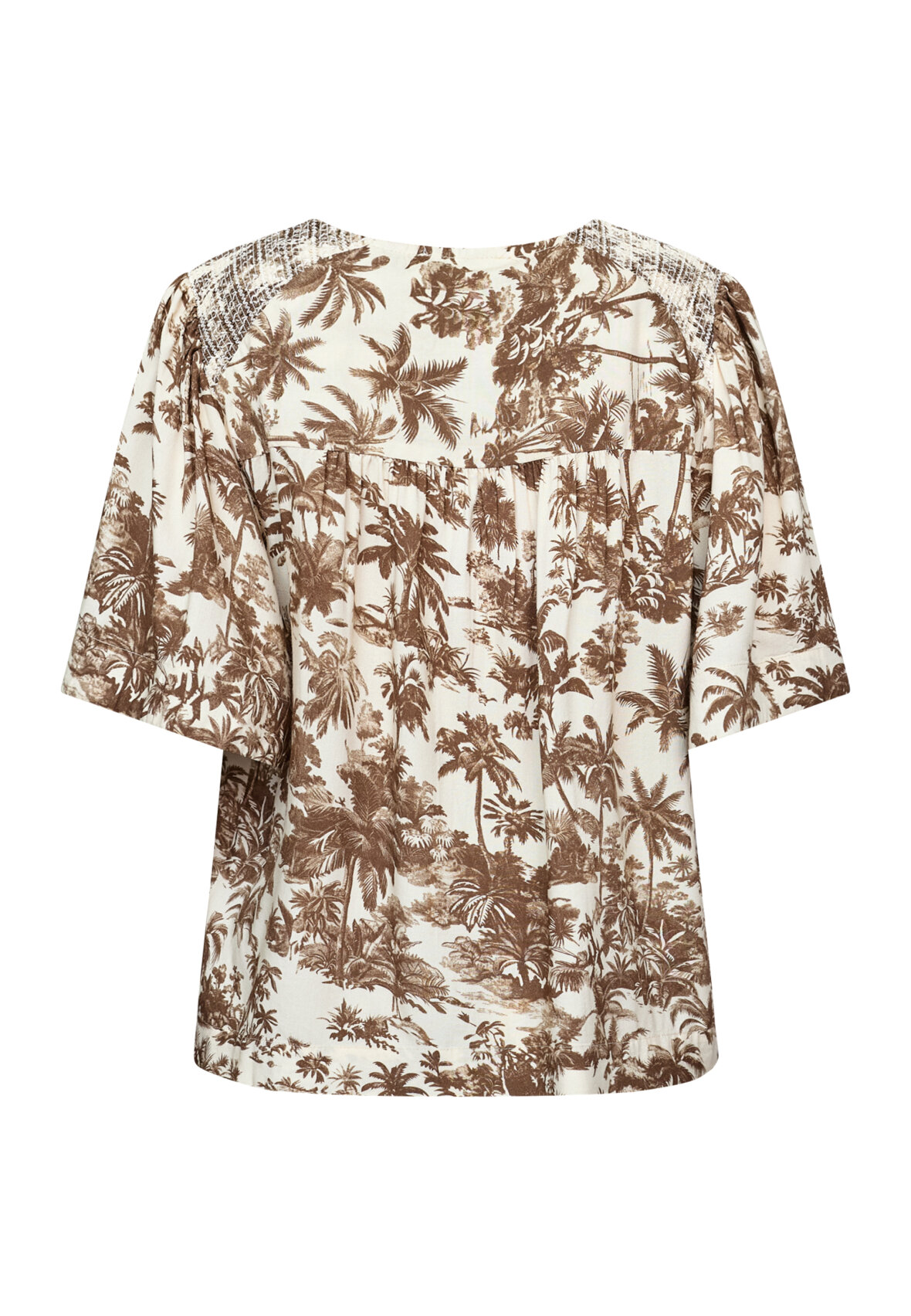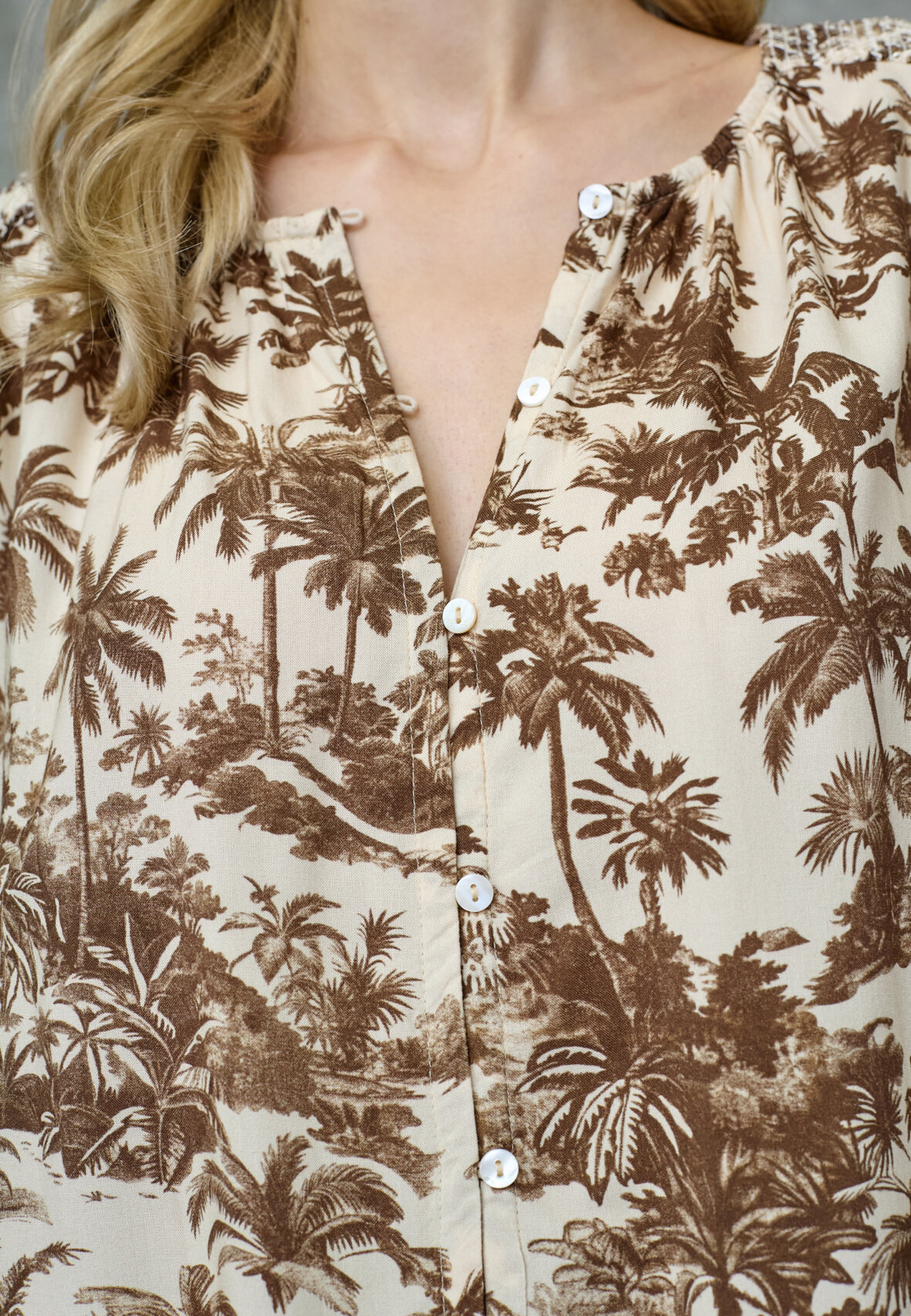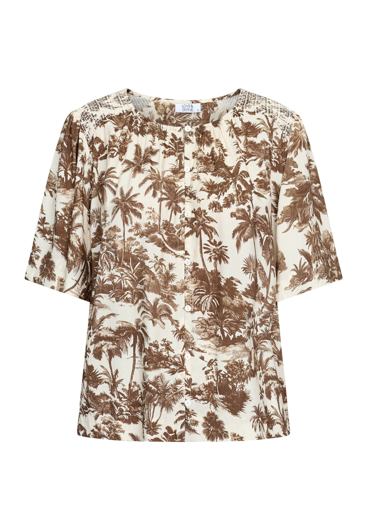 love1579 er en elegant skjorte med et palme print. Skjorten har v-hals, krave og korte ærmer, hvilket giver den et sofistikeret og feminint look. Modellen har en str. S på