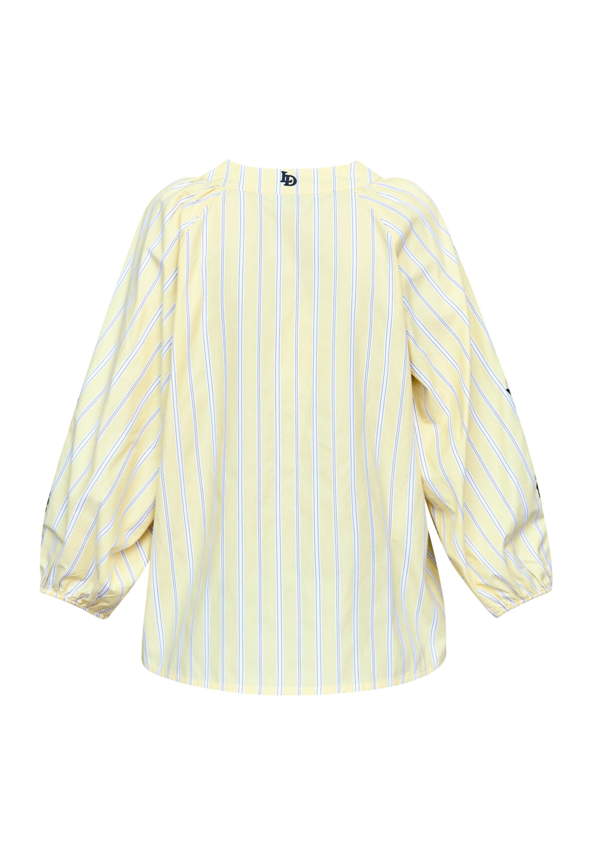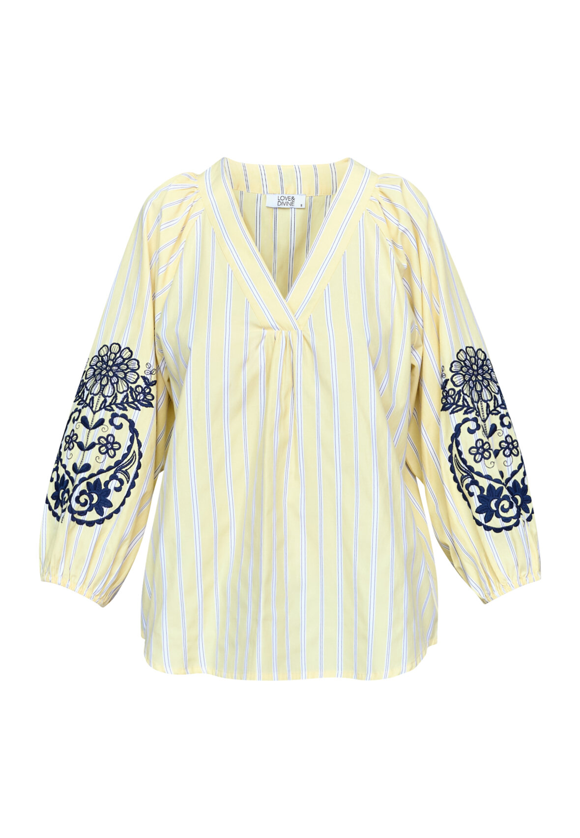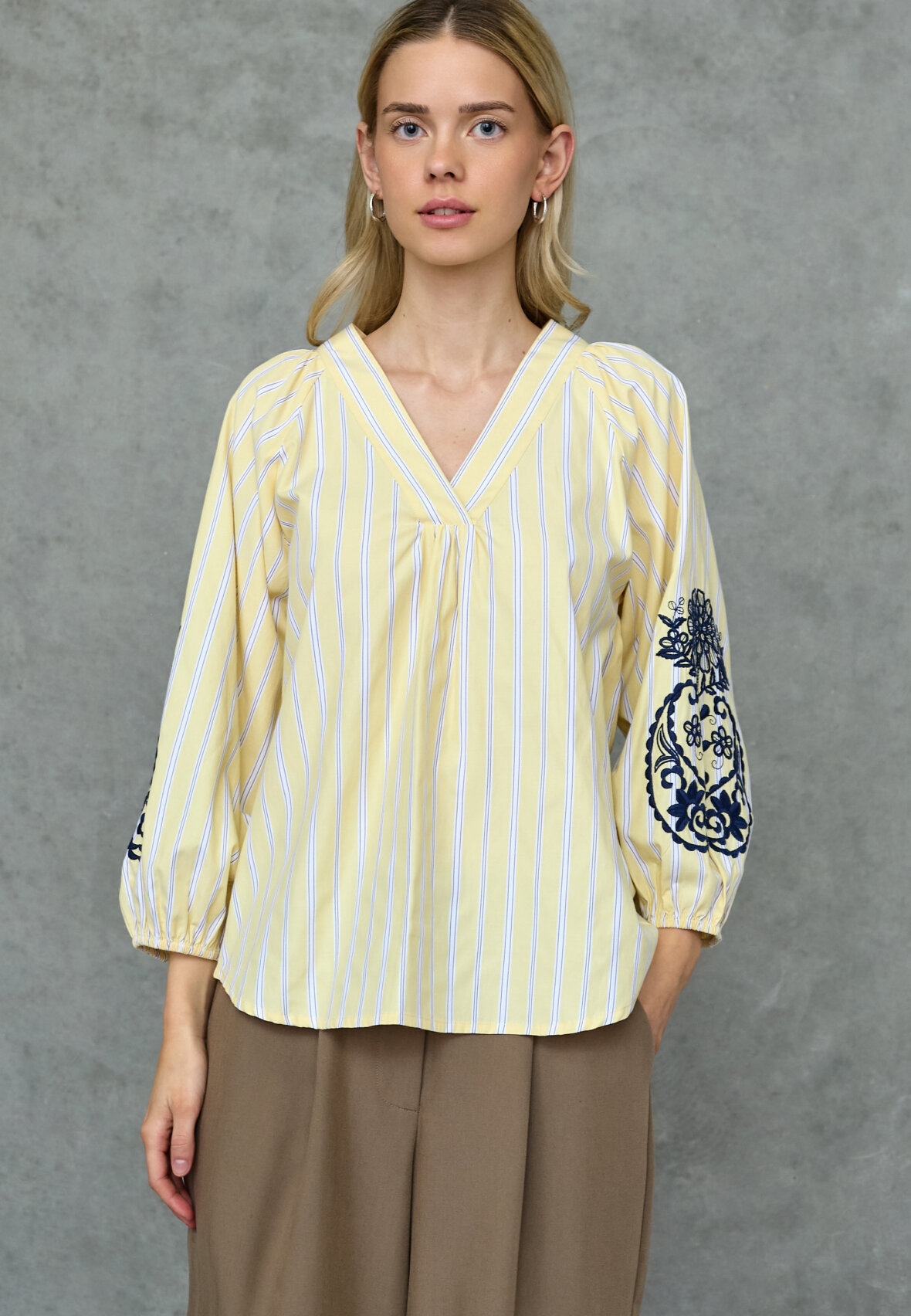 love1597 er en elegant stribet bluse med en feminin v-udskæring, fyldige ballonærmer og smukke florale broderier på ærmerne. Modellen har en str. S på