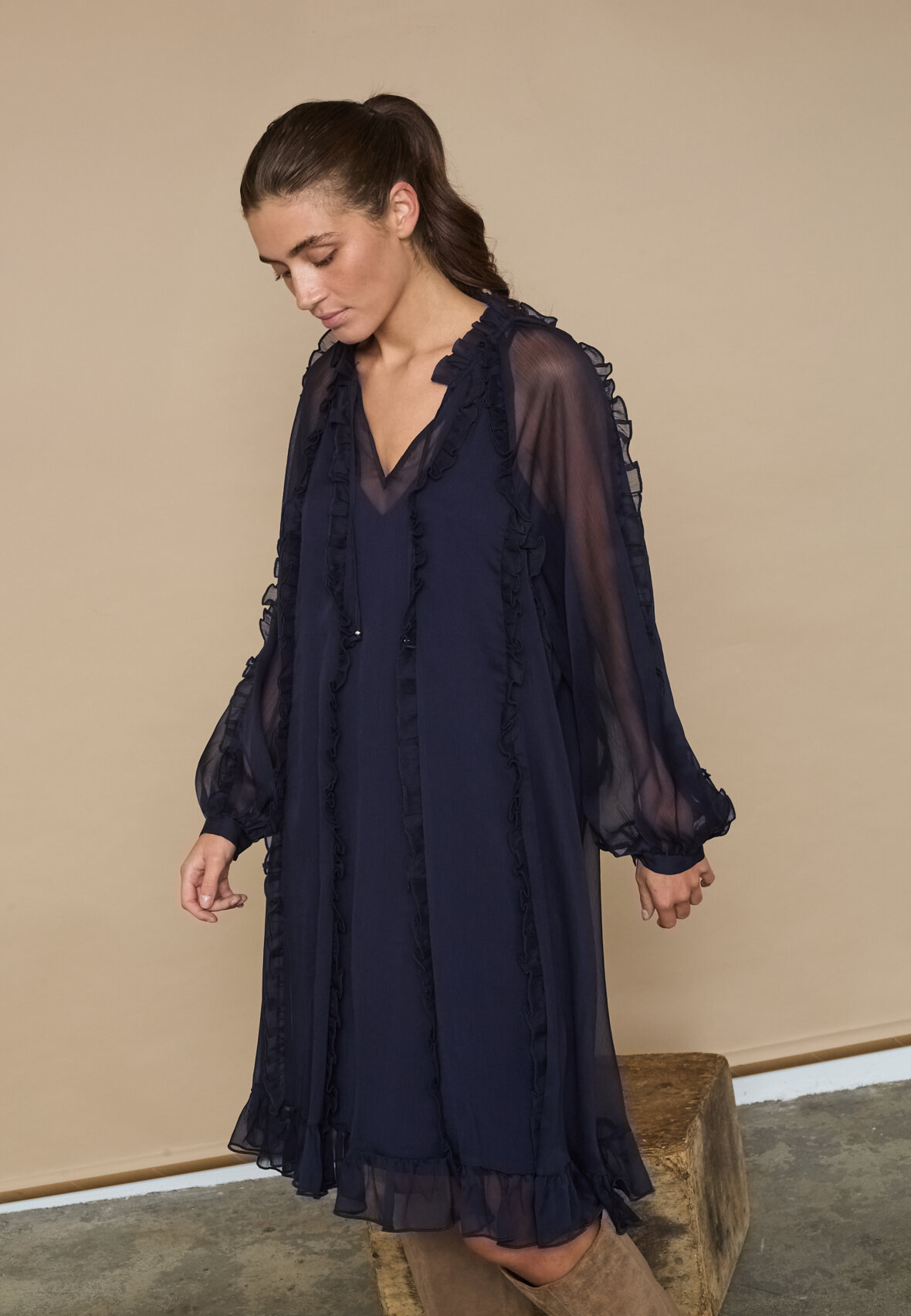 love1359 is a slightly transparent dress with long sleeves. The dress has a high neck with ribbons and an adjustable tie belt. The skirt is finished with a ruffle edge. The model is wearing a size S and is 171 cm tall.