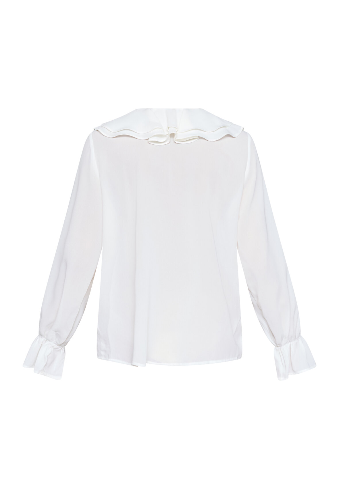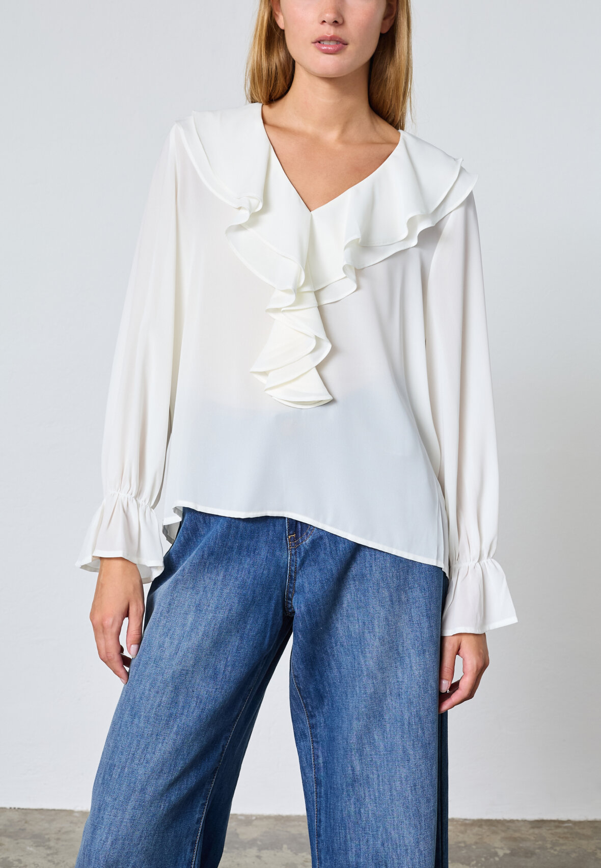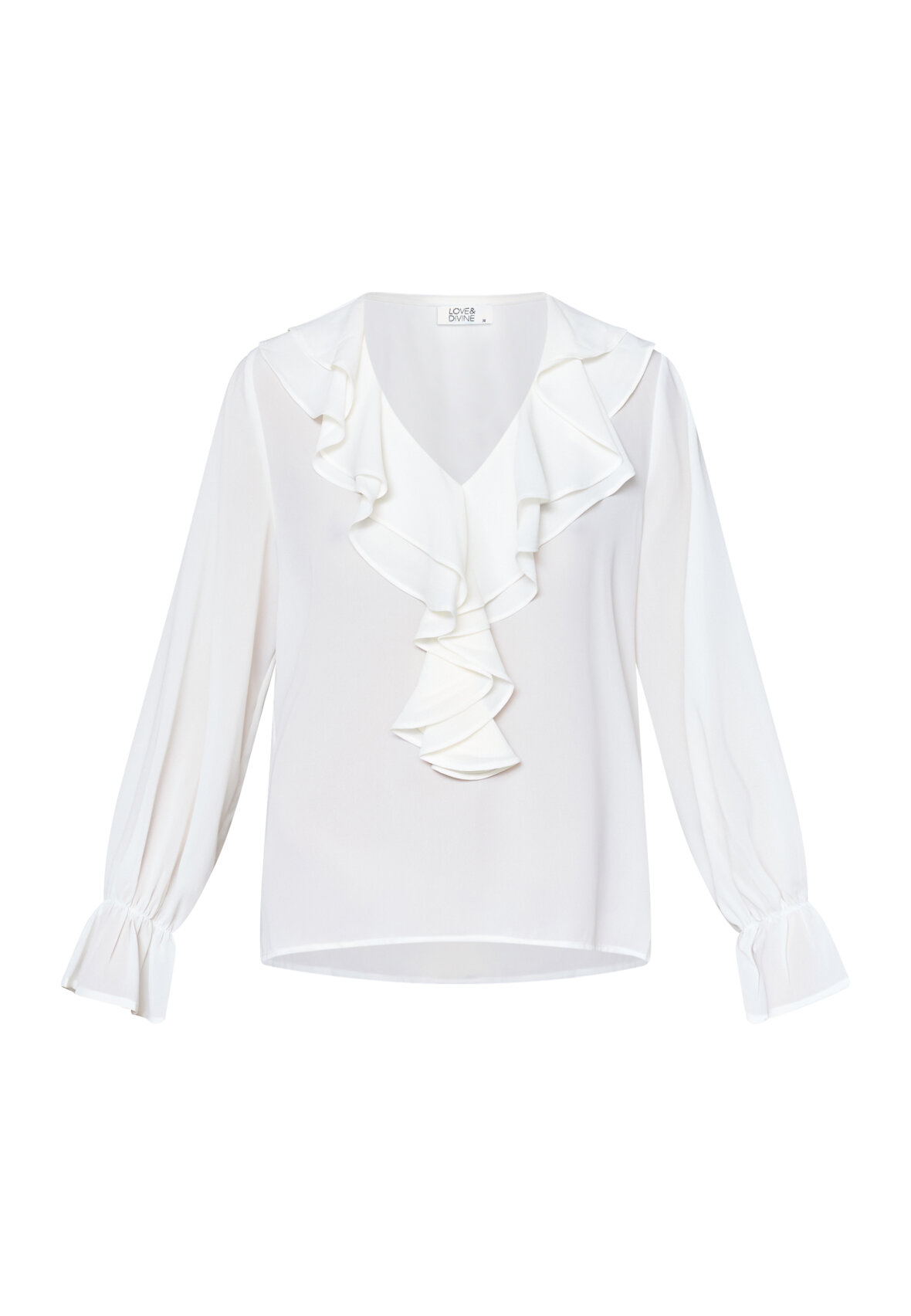 love1433 is a blouse designed with an elegant ruffle panel on the front that continues over the shoulders. The blouse features a V-neck and long sleeves. The model is wearing a size S.
