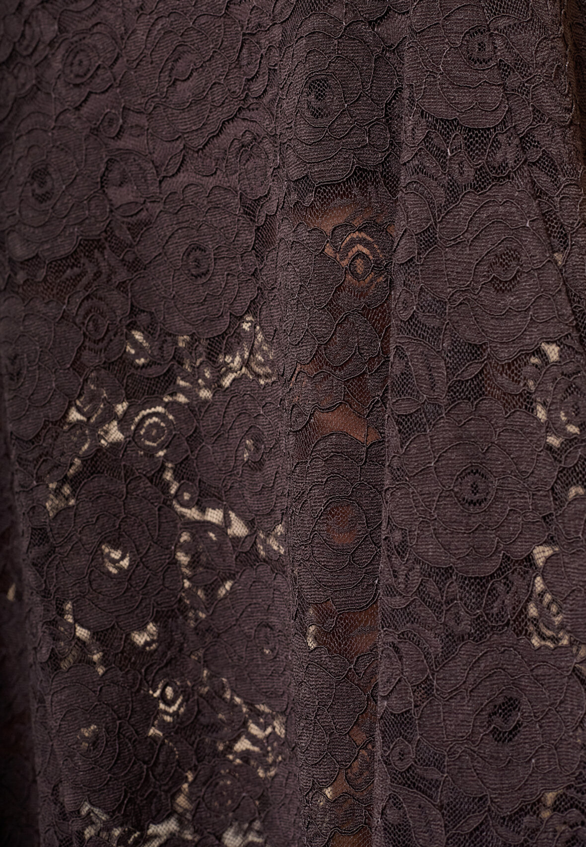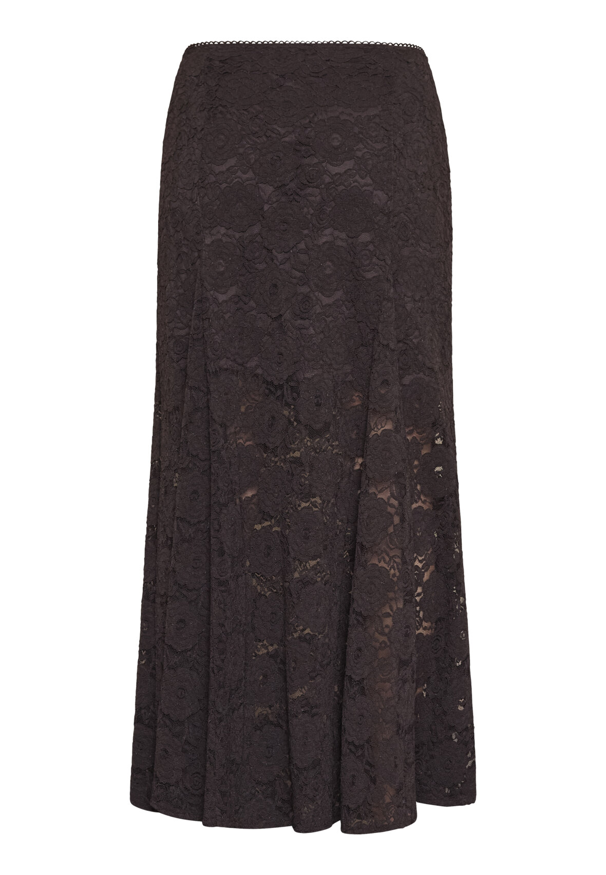 love1346 is a long skirt in a light, transparent fabric. It has a lace pattern that covers the entire fabric. The skirt has an A-shape and goes to the middle of the calf. The model has a size S on.