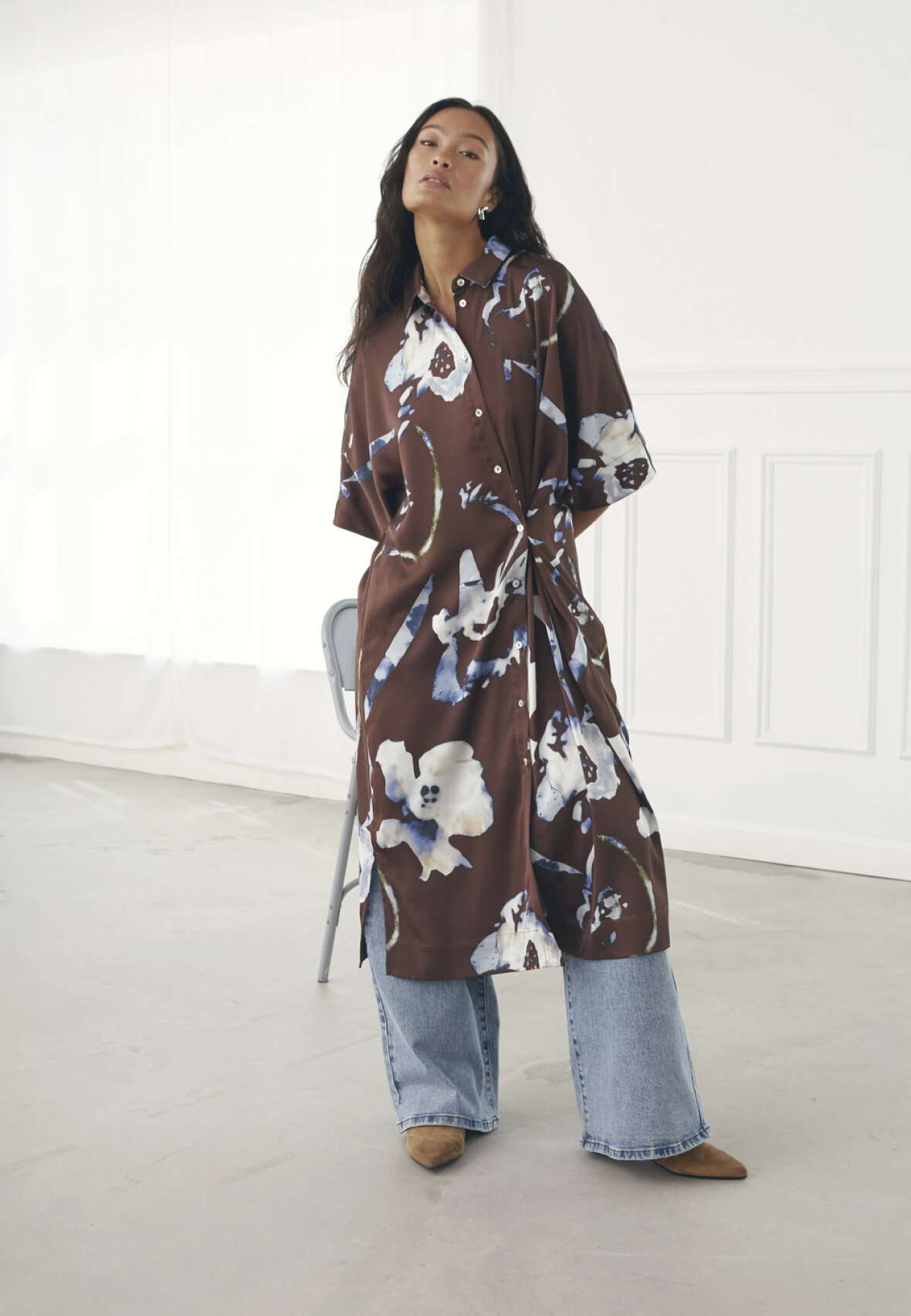 love1397-1 is a midi shirt dress with an abstract pattern. It has a loose fit with short sleeves and a classic collar. It is a button-down style. The model is wearing a size S.