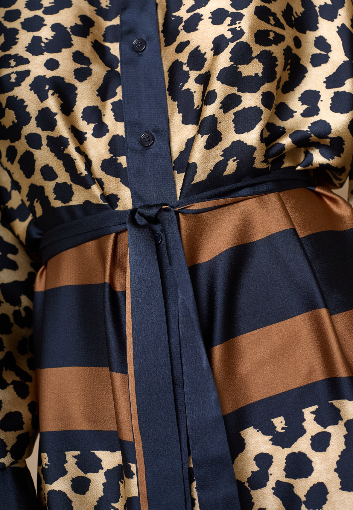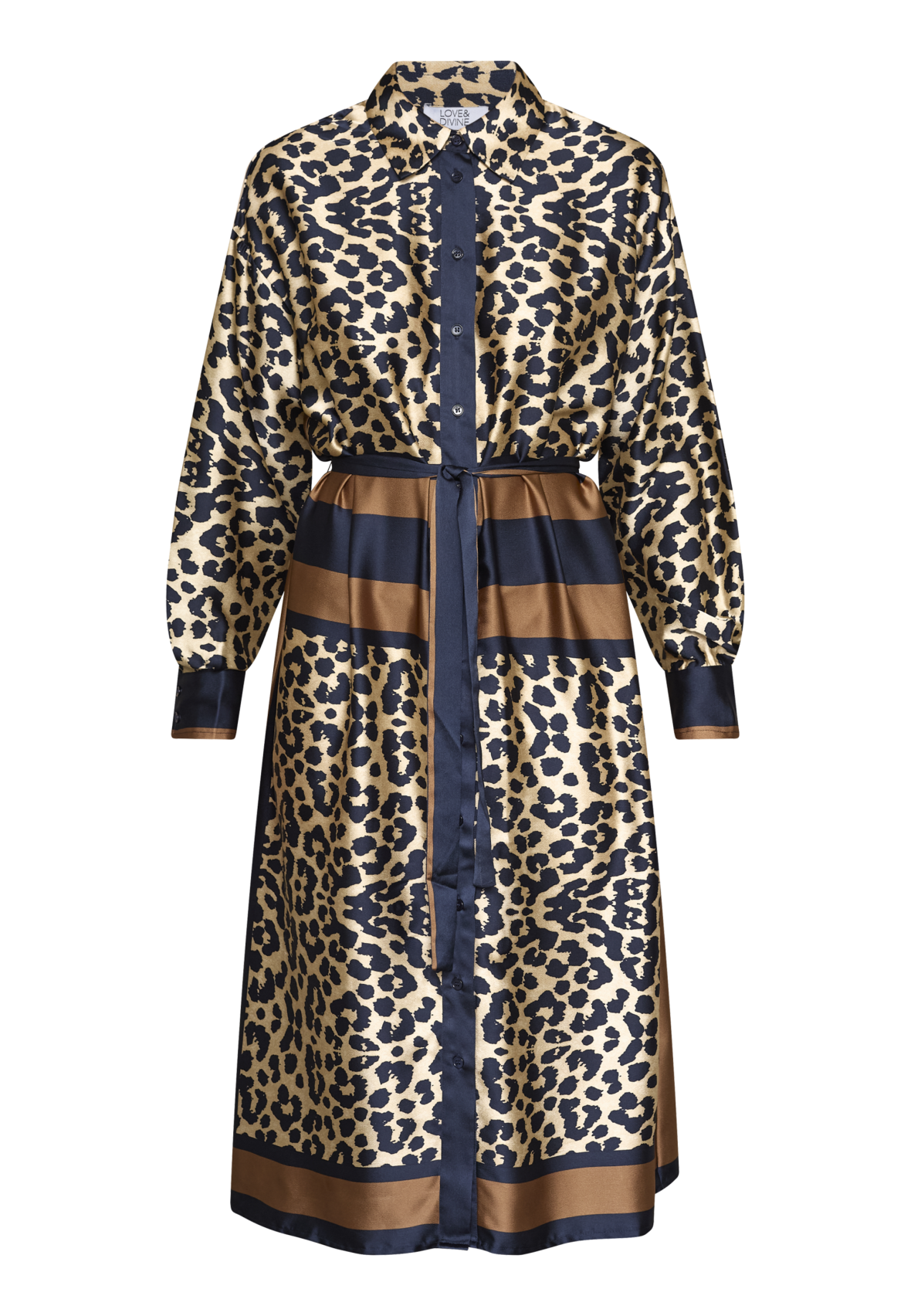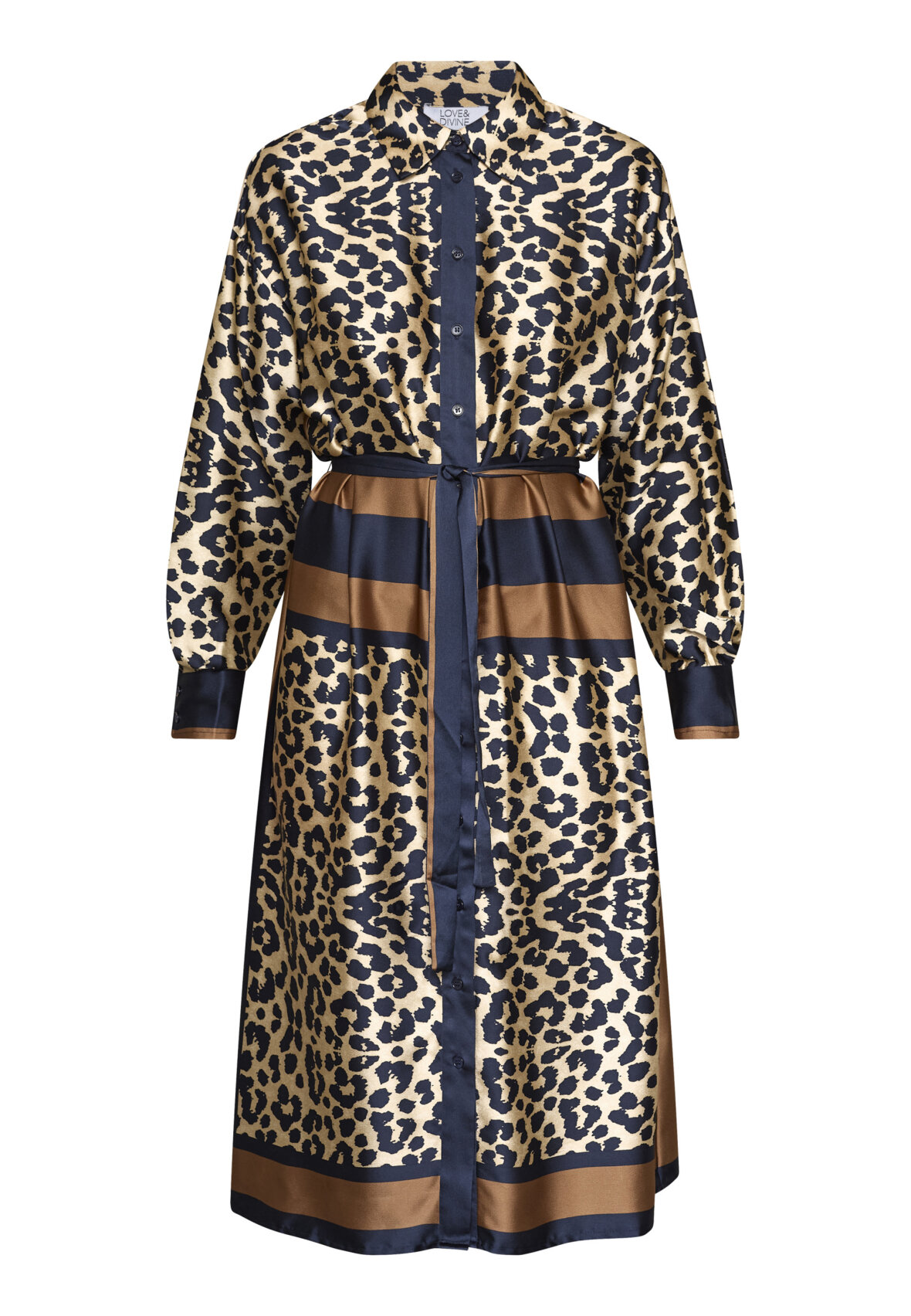 love1394 is a long shirt dress with a striking print. The dress features a classic collar, full-length button closure, and long sleeves with cuffs. The model is wearing a size S.
