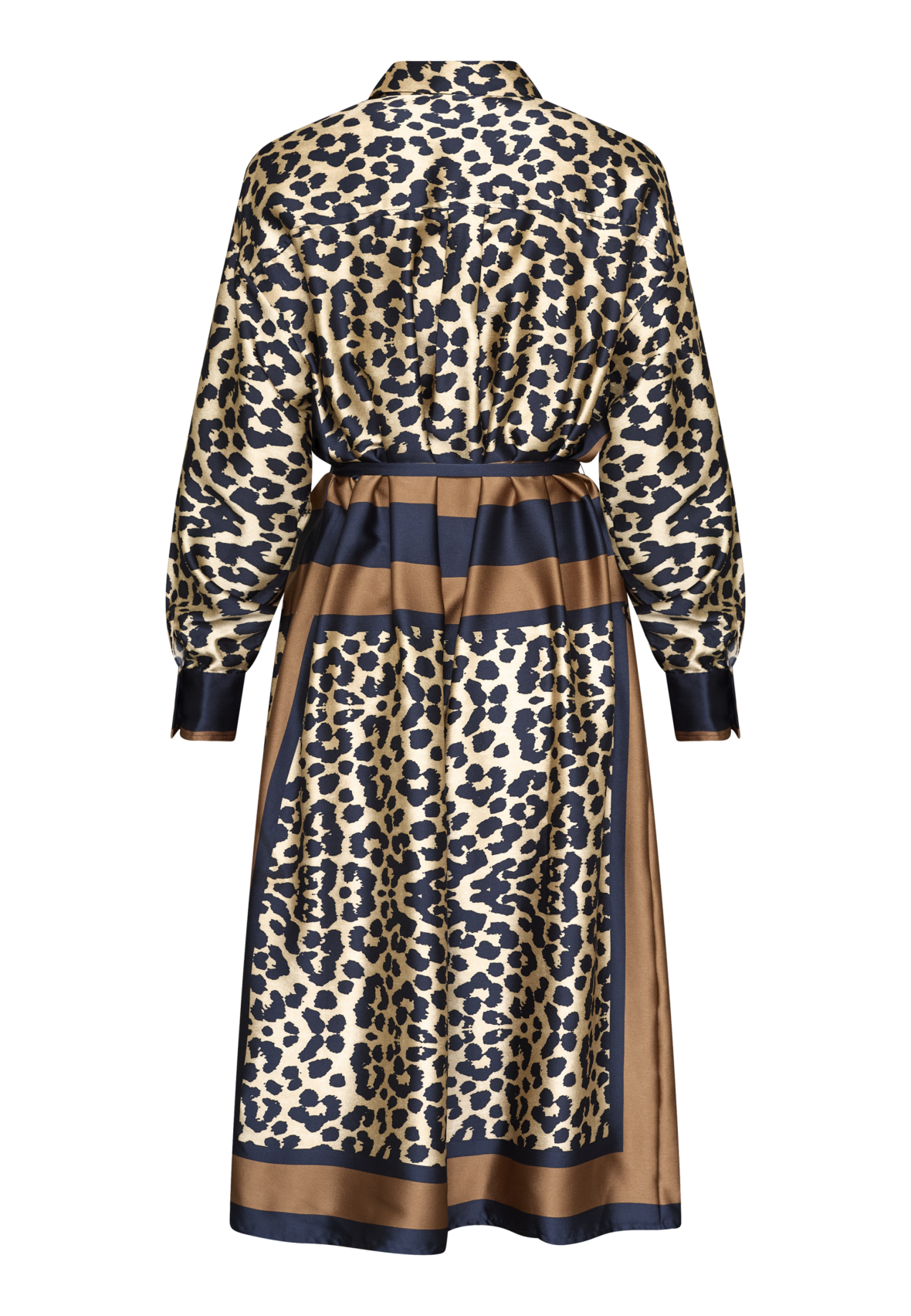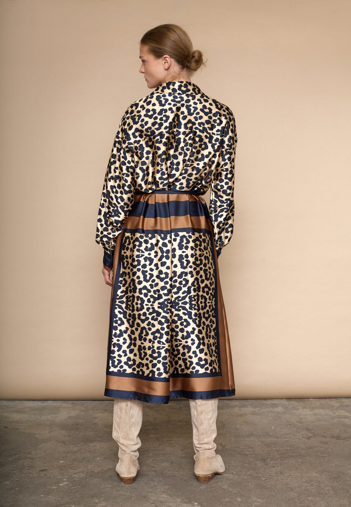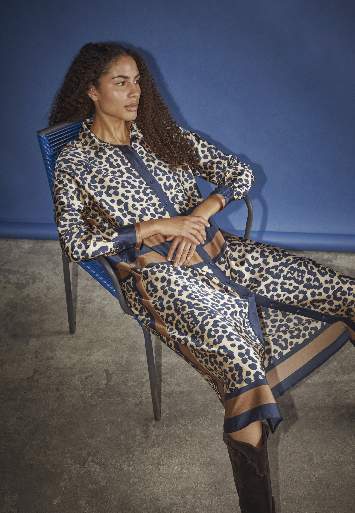 love1394 is a long shirt dress with a striking print. The dress features a classic collar, full-length button closure, and long sleeves with cuffs. The model is wearing a size S.