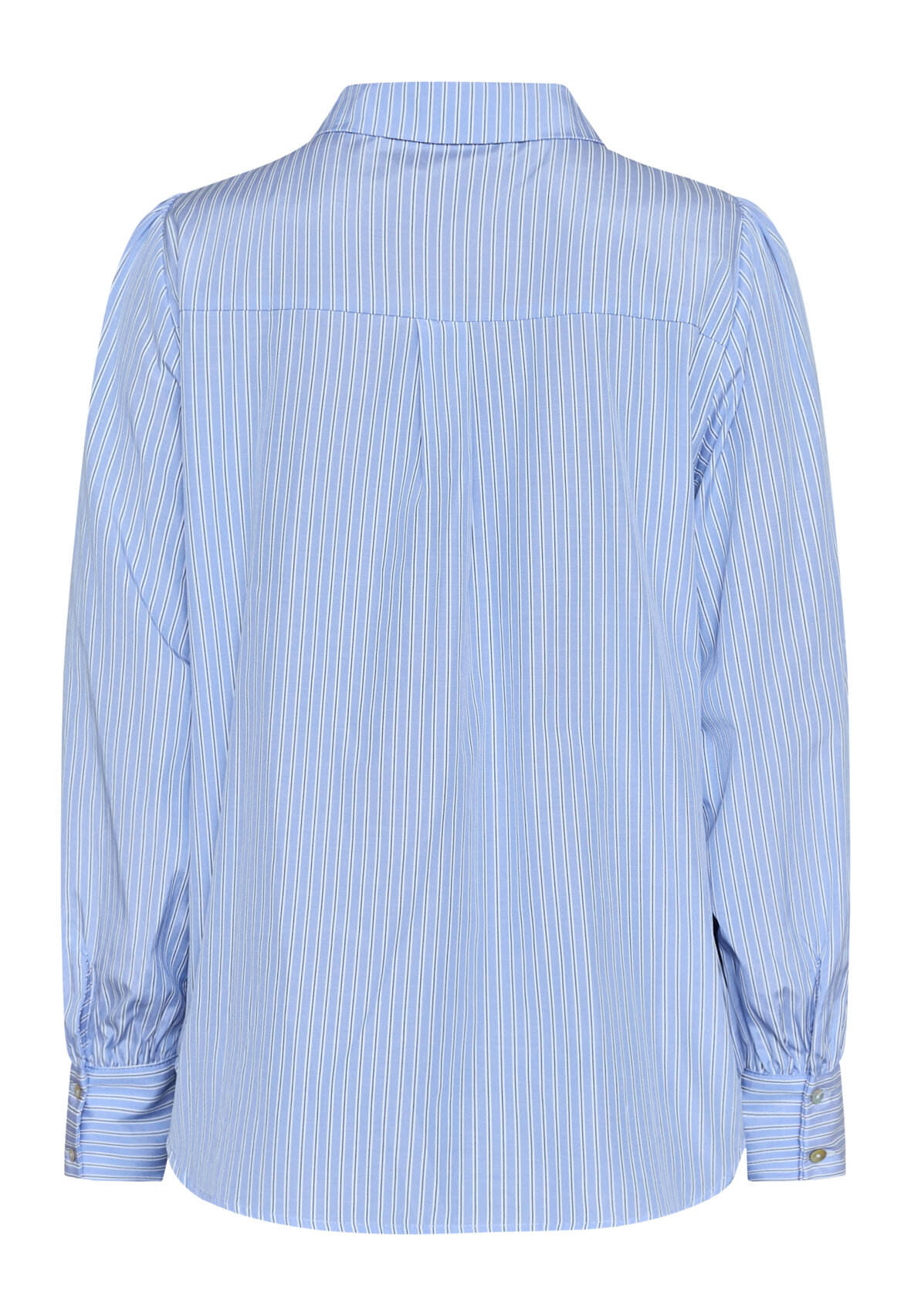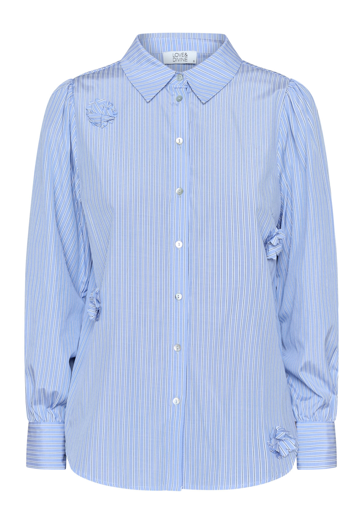 love919-21 is a shirt with a vertical stripe pattern and a classic collar. It features a button closure and puff sleeves with wide cuffs. Small appliqué flower details adorn the front. The model is wearing a size S.