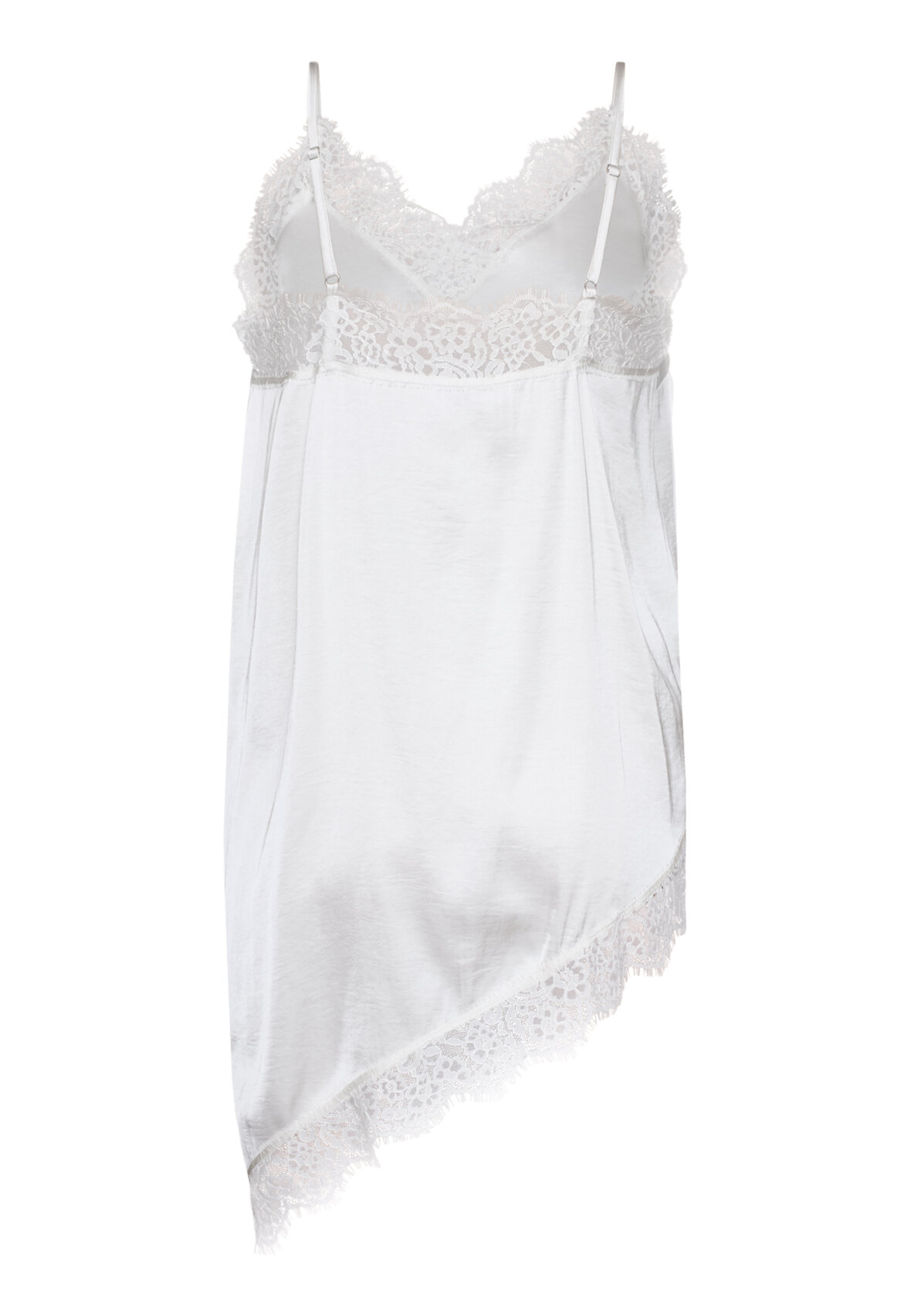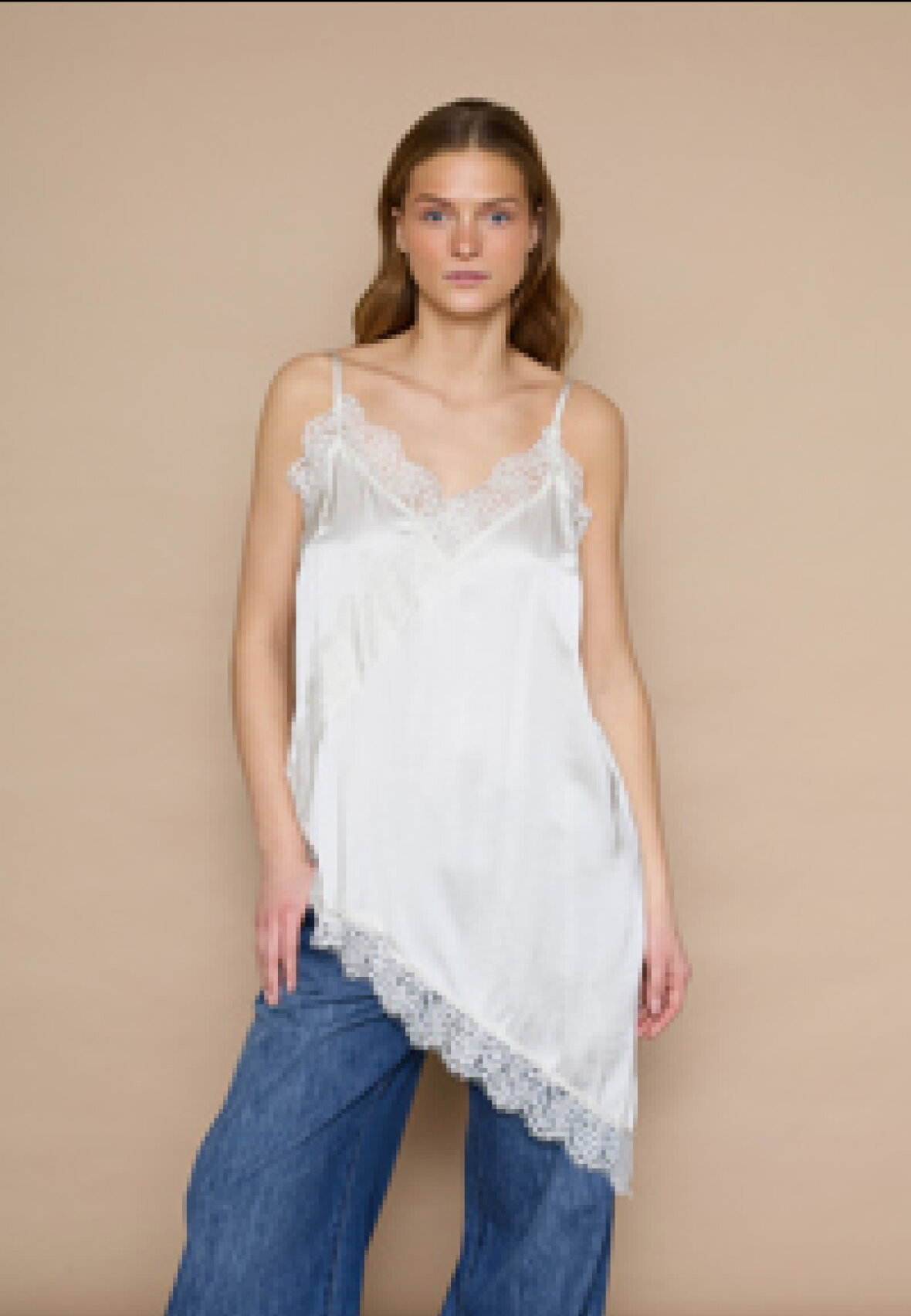 love1472 is a beautiful and feminine satin top with lace details. The top has adjustable straps and a diagonal lace detail at the bottom of the top. The model is wearing a size S