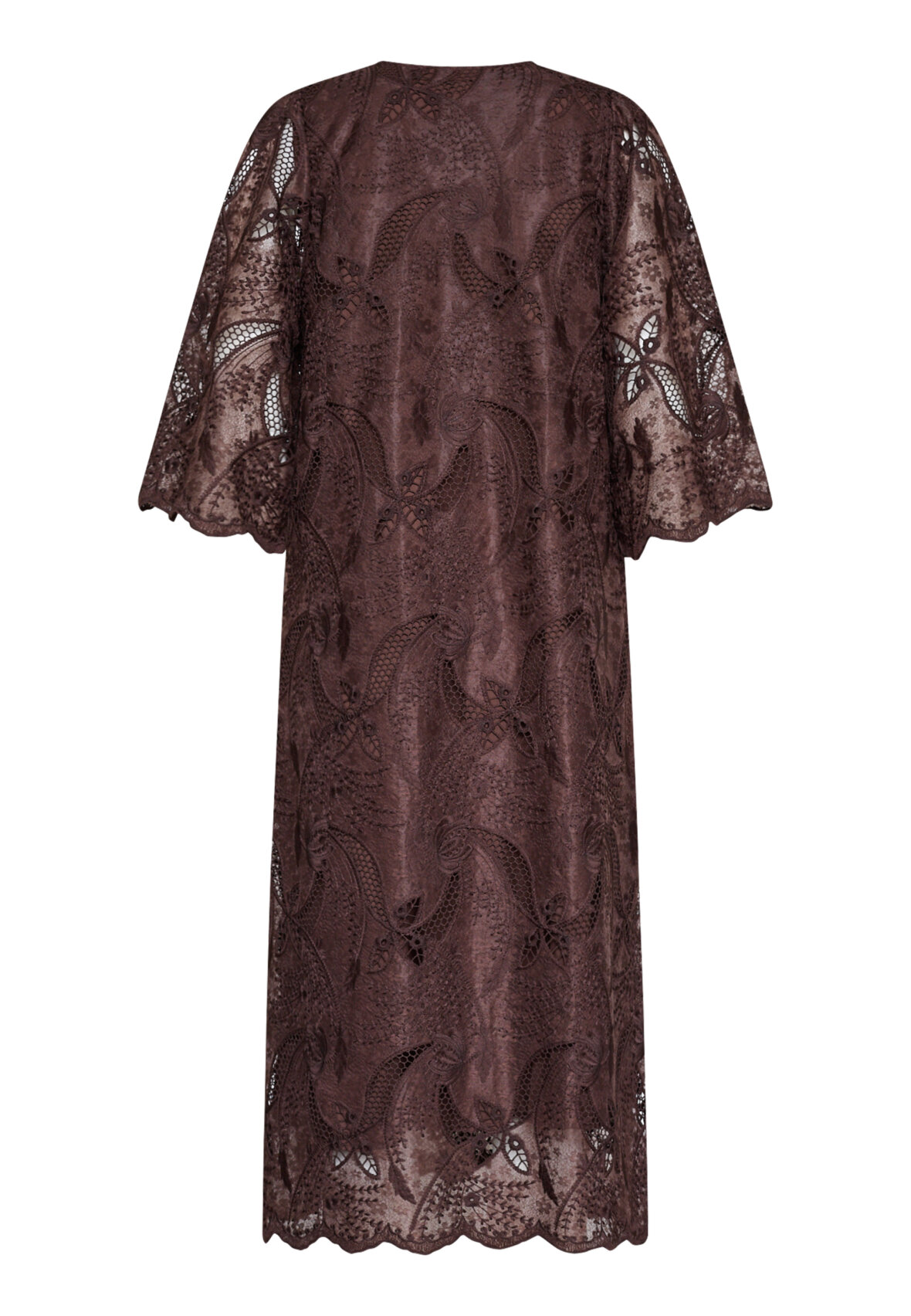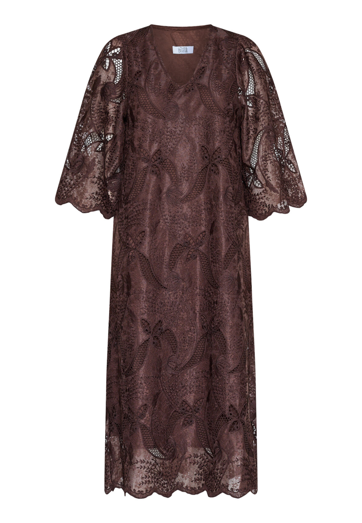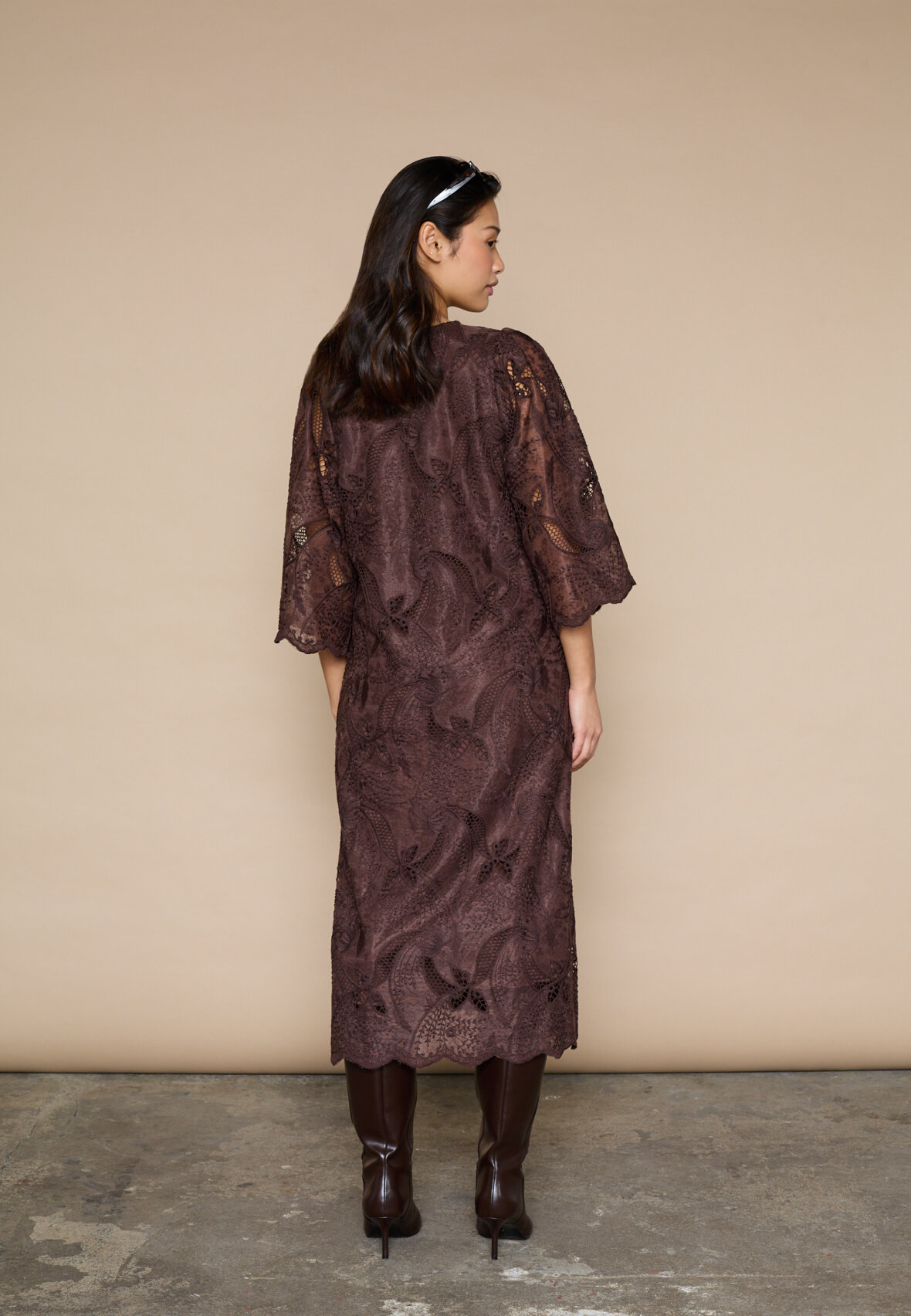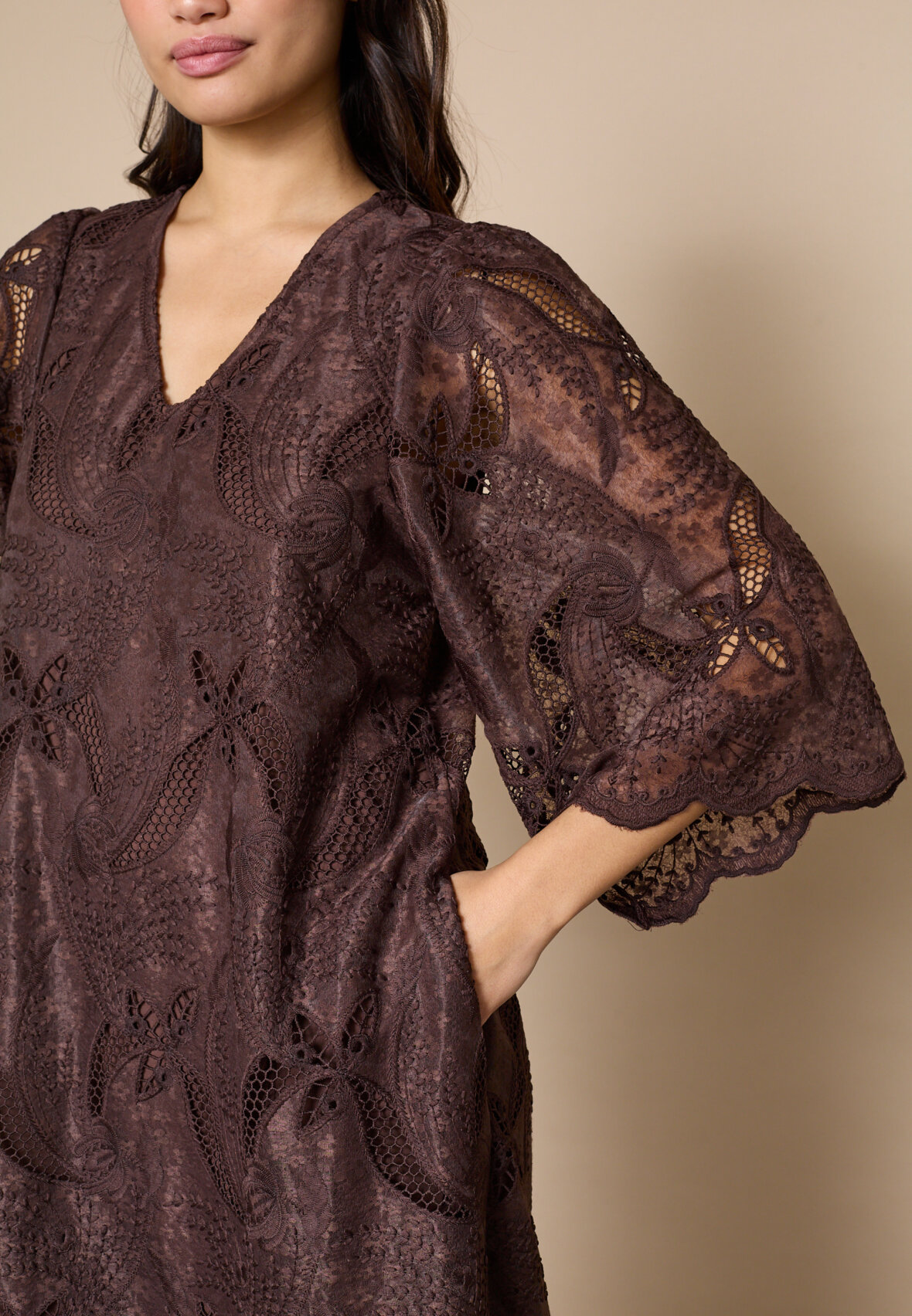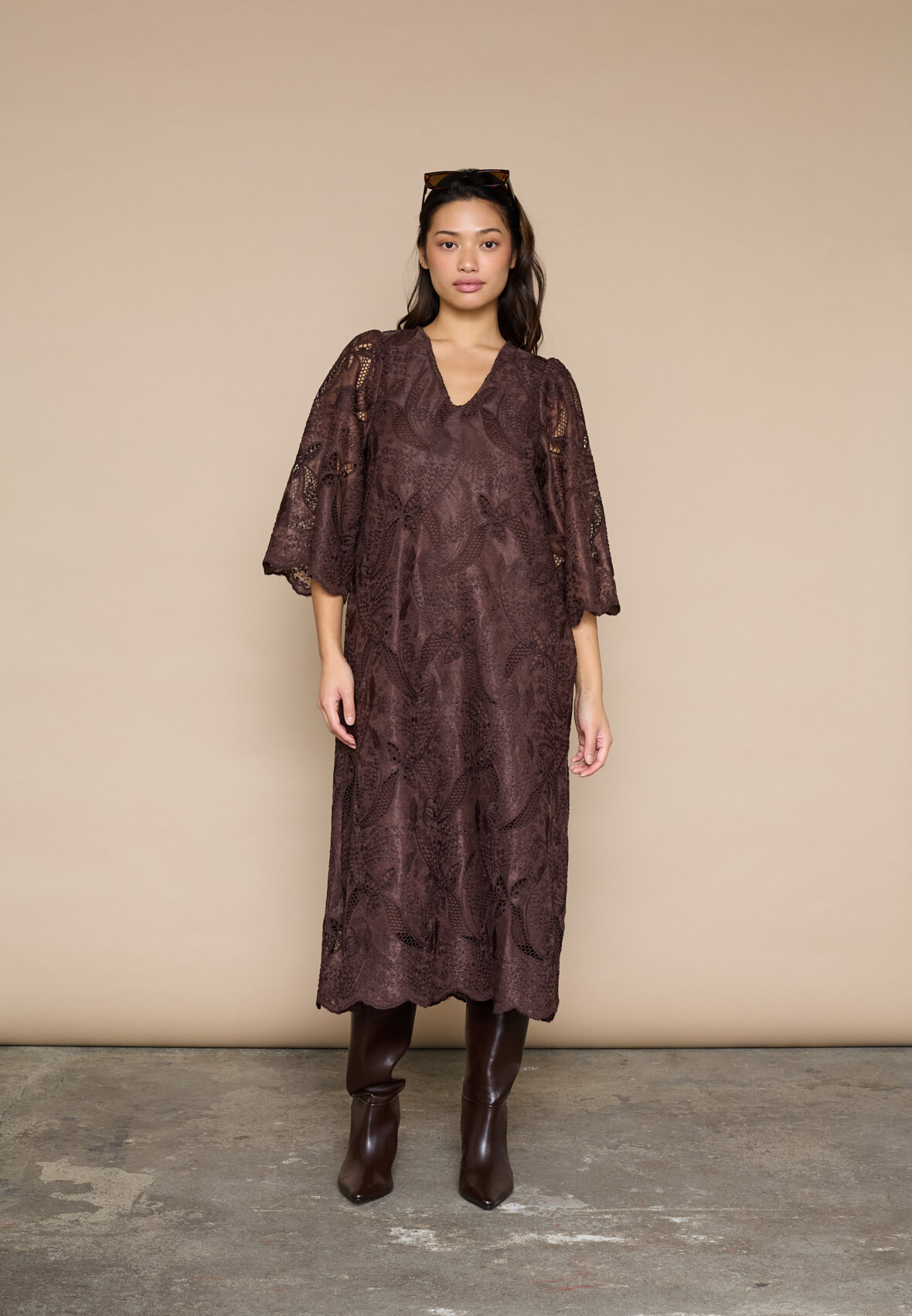 love1444 is a feminine lace dress in a midi length. The dress has three-quarter sleeves and an attached underskirt. The model is wearing a size S.