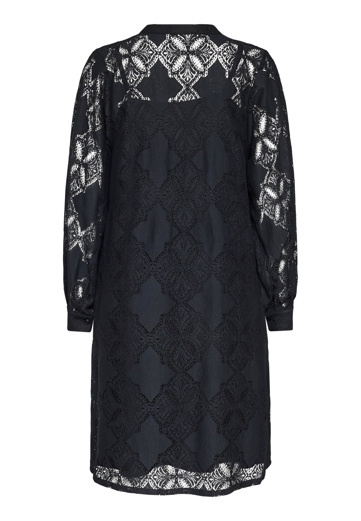 love1453 is a tunic dress in a delicate lace pattern. The dress has a relaxed fit with long sleeves and a deep V-neckline. The model is wearing a size S.