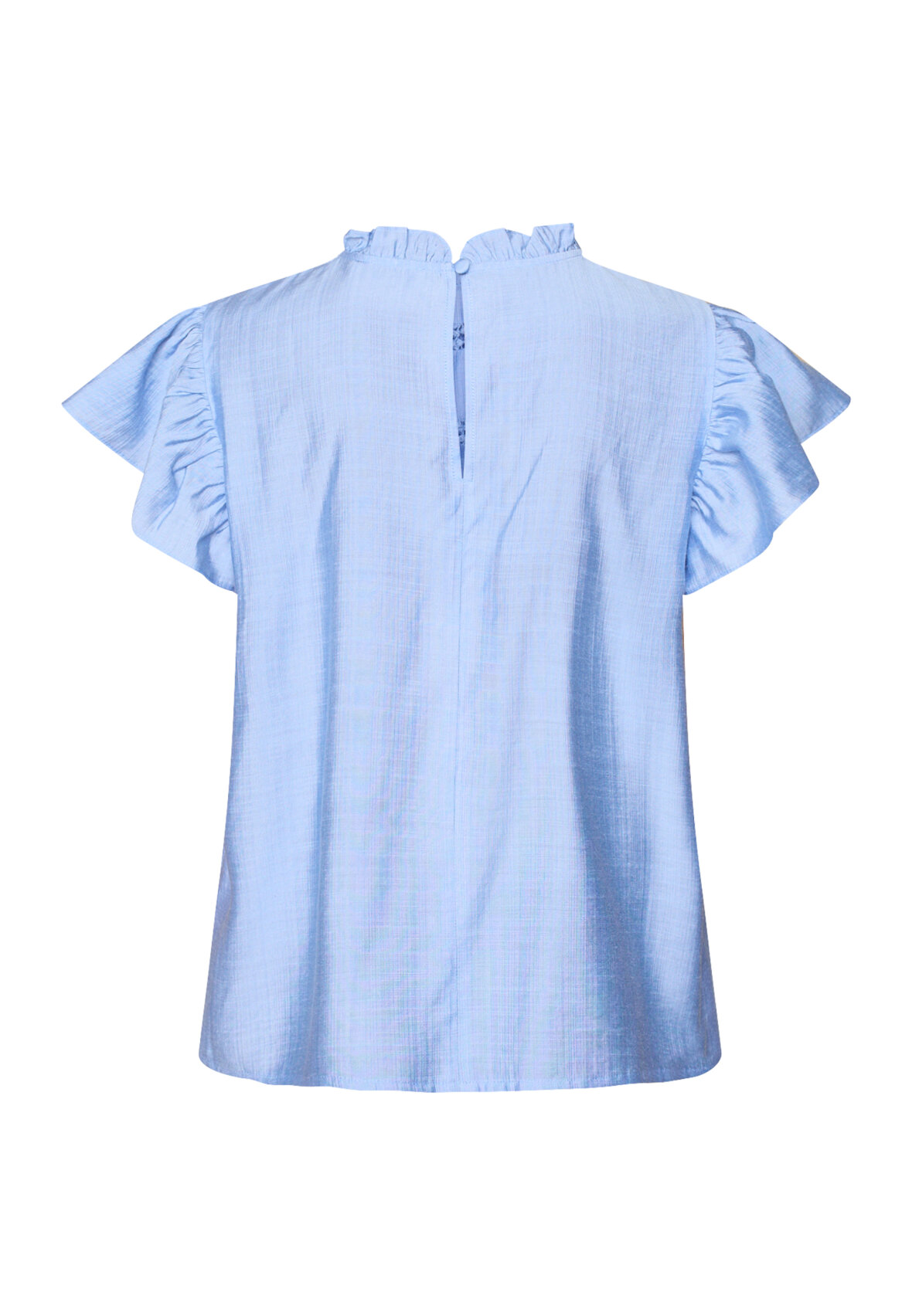 love1374 is a feminine, white blouse with short flutter sleeves. The blouse features a high, ruffled neckline and decorative V-shaped embroidery on the front. The model is wearing a size S.