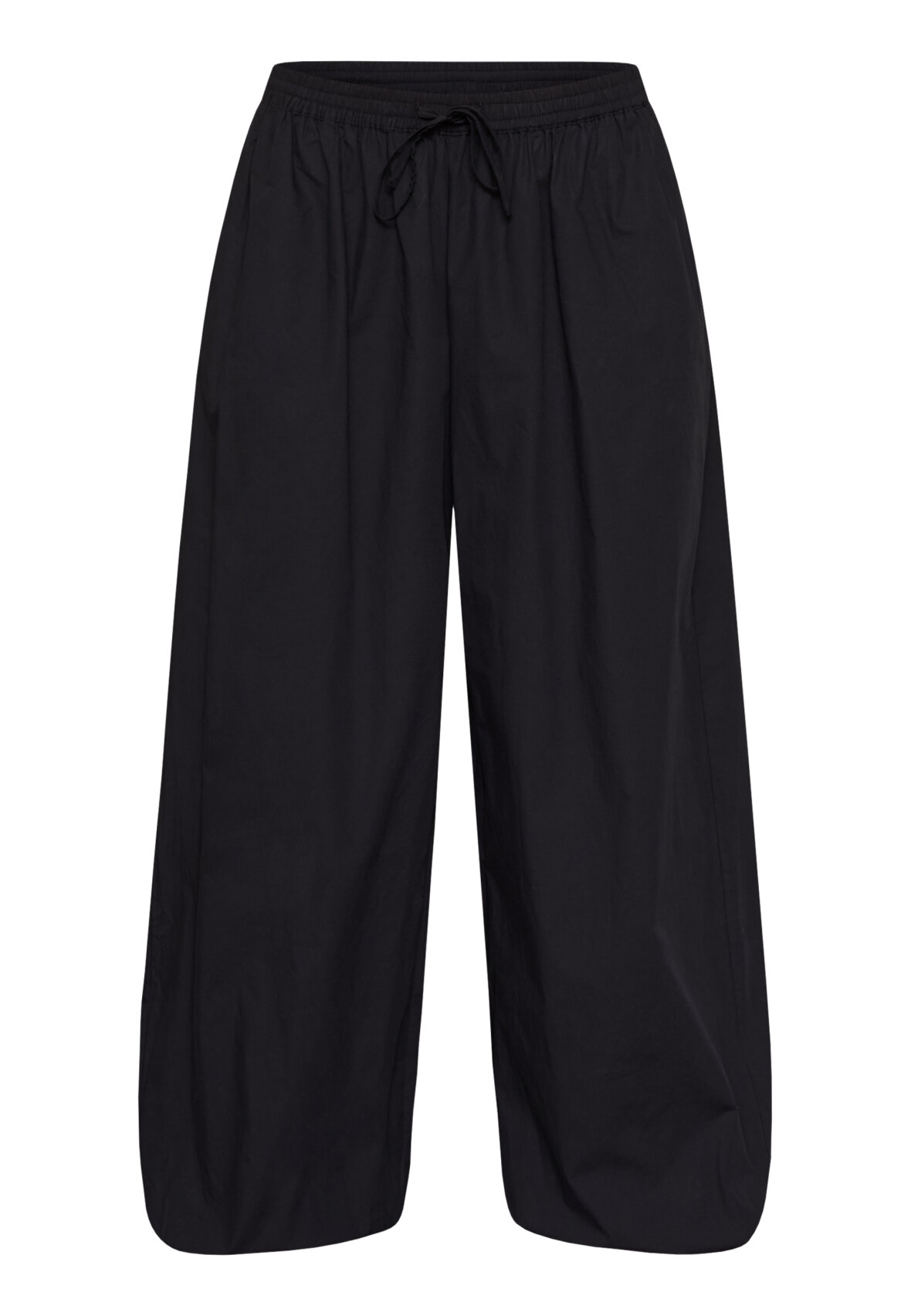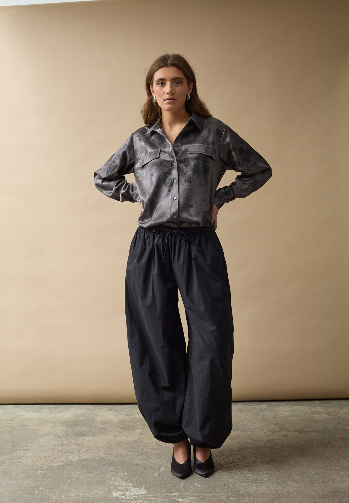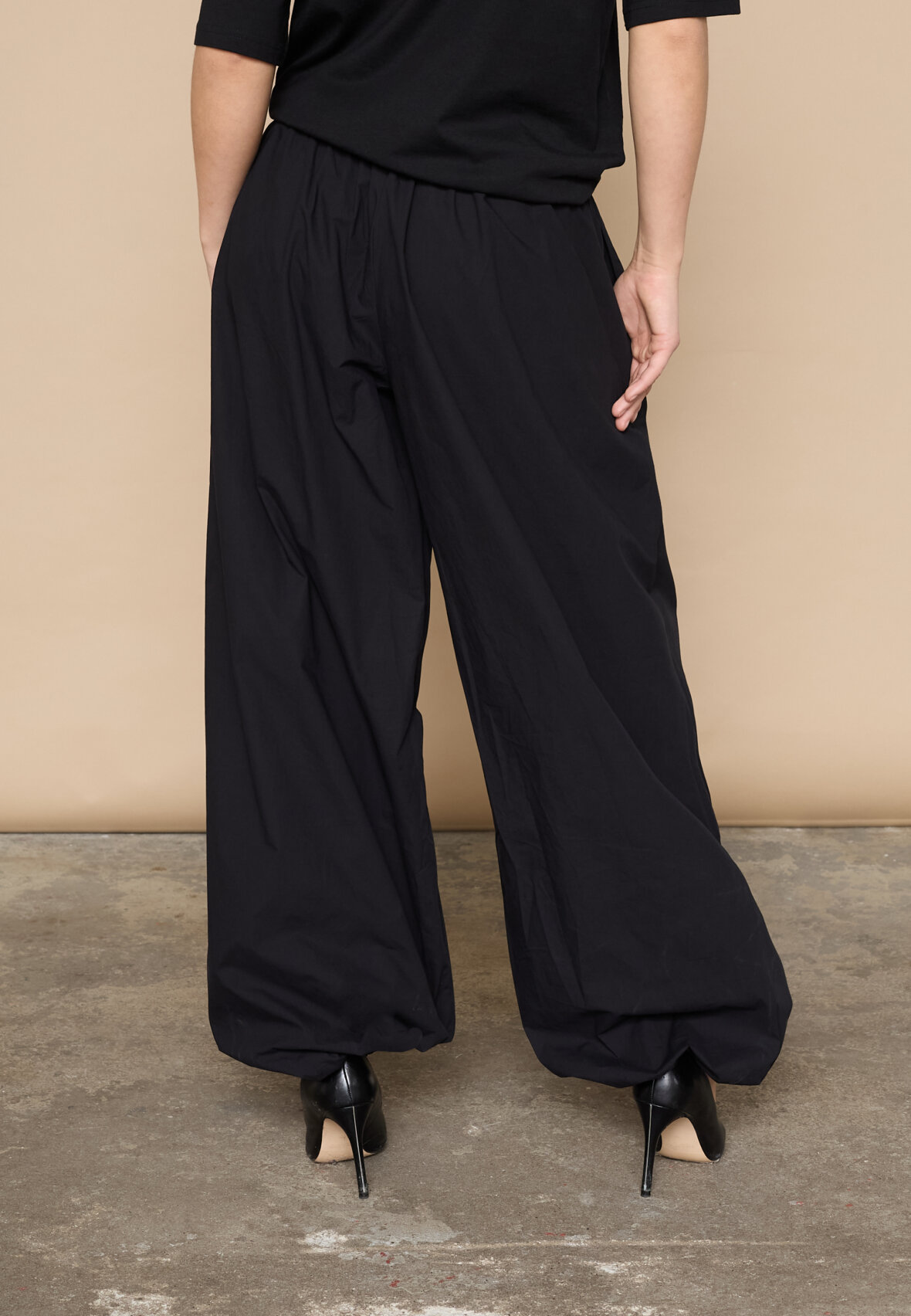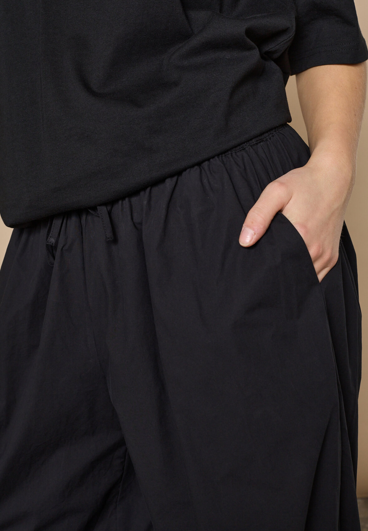 love1466 is a loose-fitting, lightweight trousers in a smooth quality with elastic at the waist and a tie. The trousers have side pockets and elastic at the ankles that can be adjusted, creating a balloon shape. The model is wearing a size S