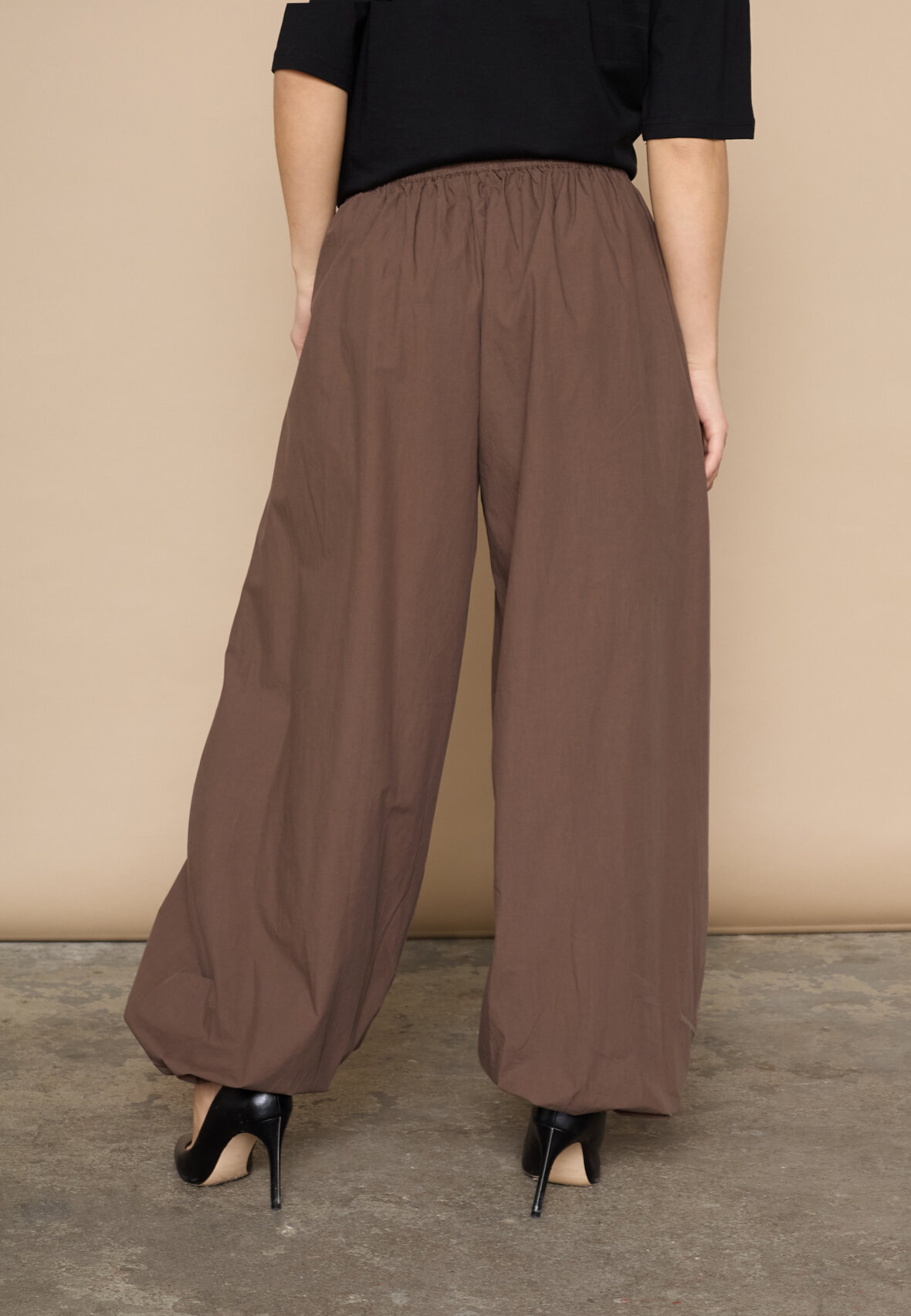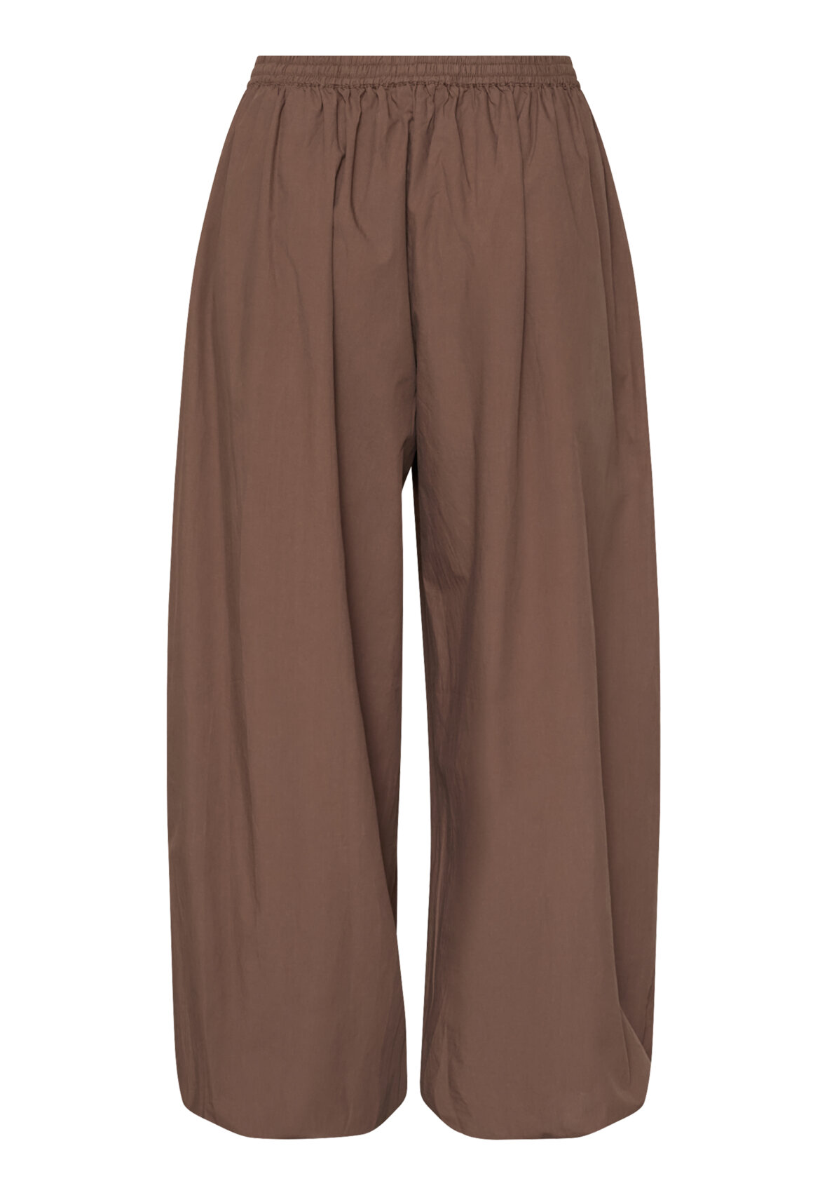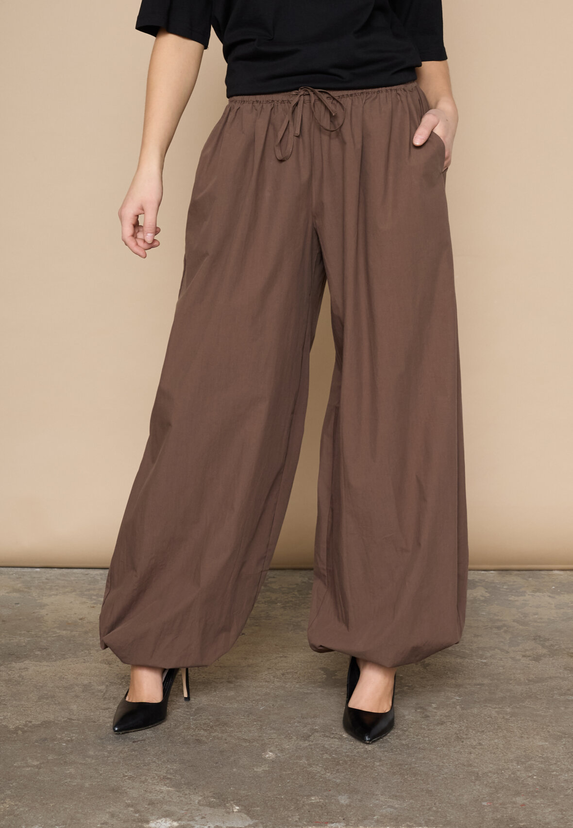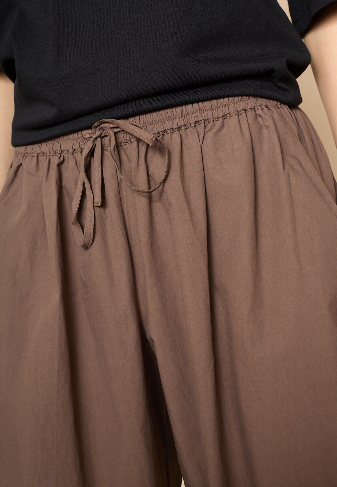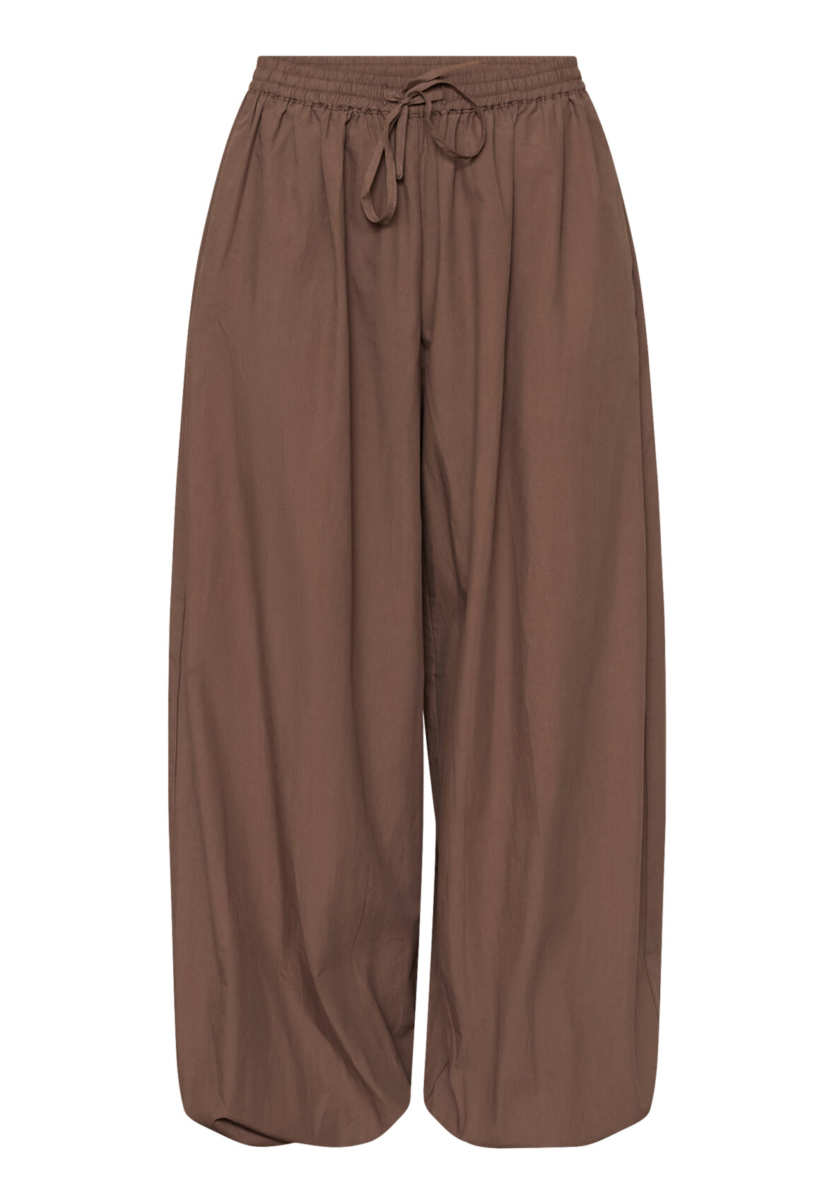 love1466 is a loose-fitting, lightweight trousers in a smooth quality with elastic at the waist and a tie. The trousers have side pockets and elastic at the ankles that can be adjusted, creating a balloon shape. The model is wearing a size S