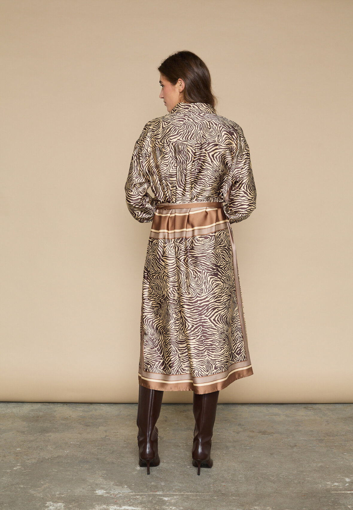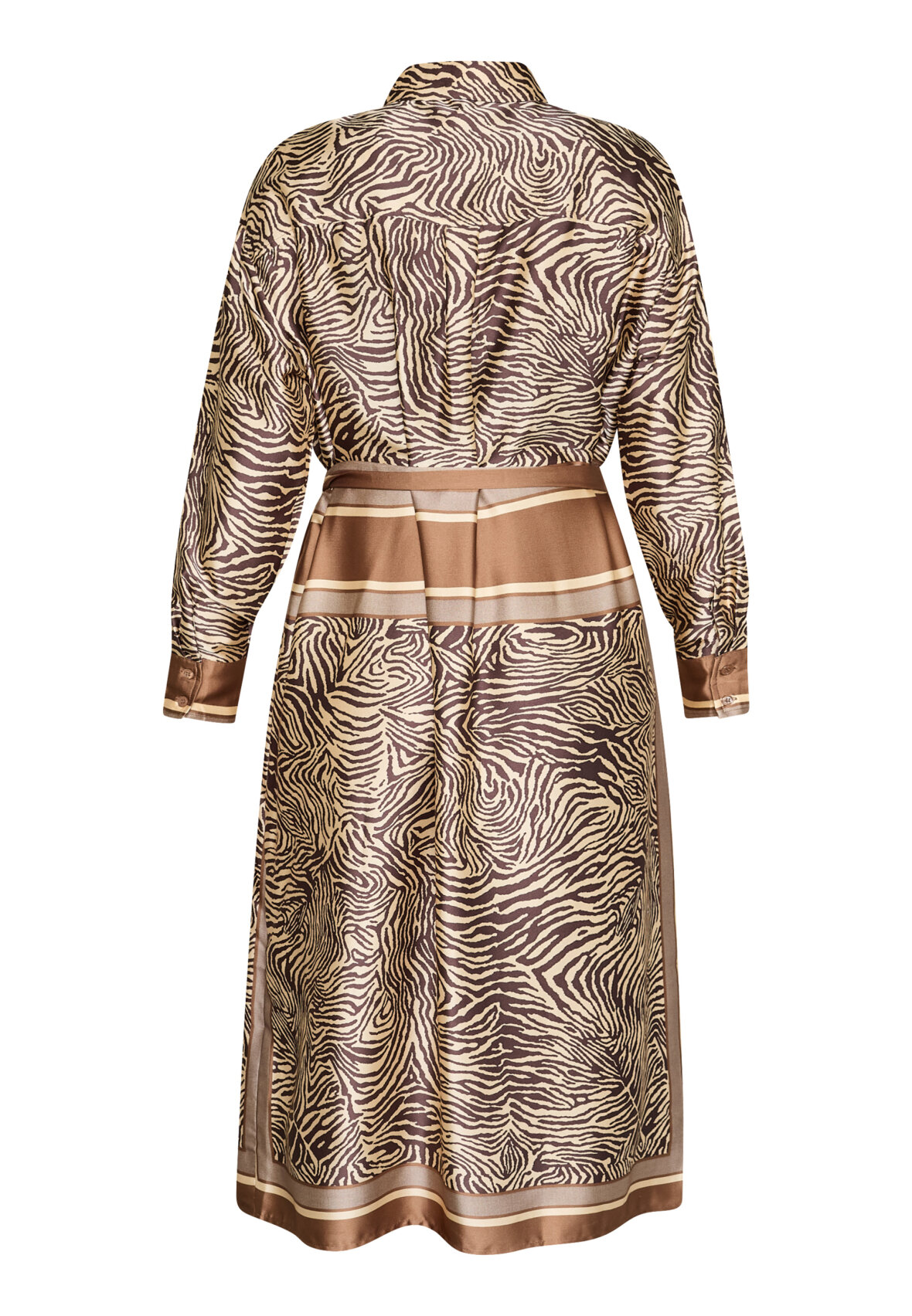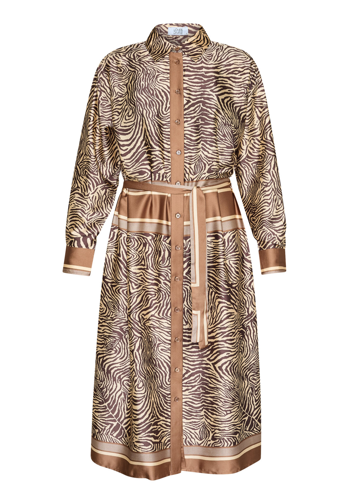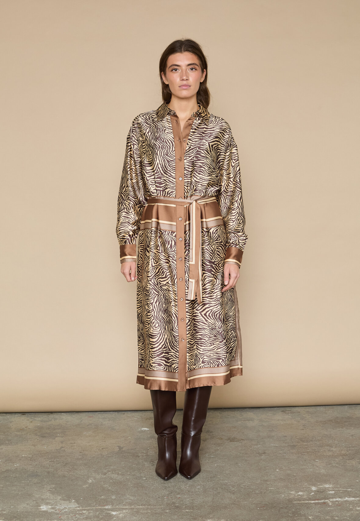love1394-2 is a shirt dress in a zebra print. It has a classic collar and fastens with a row of buttons. The dress has long sleeves and a removable waist belt. The model is wearing a size S.