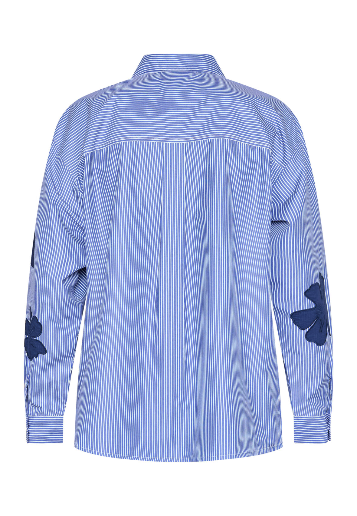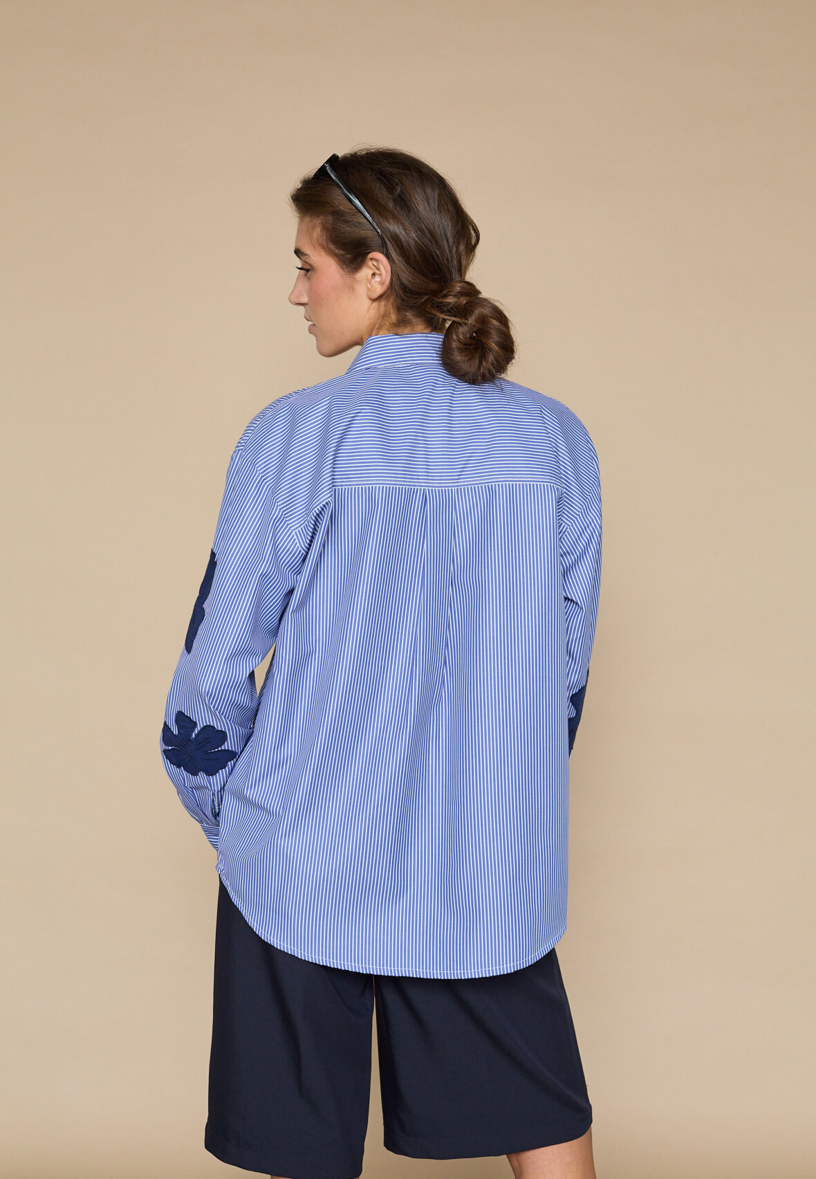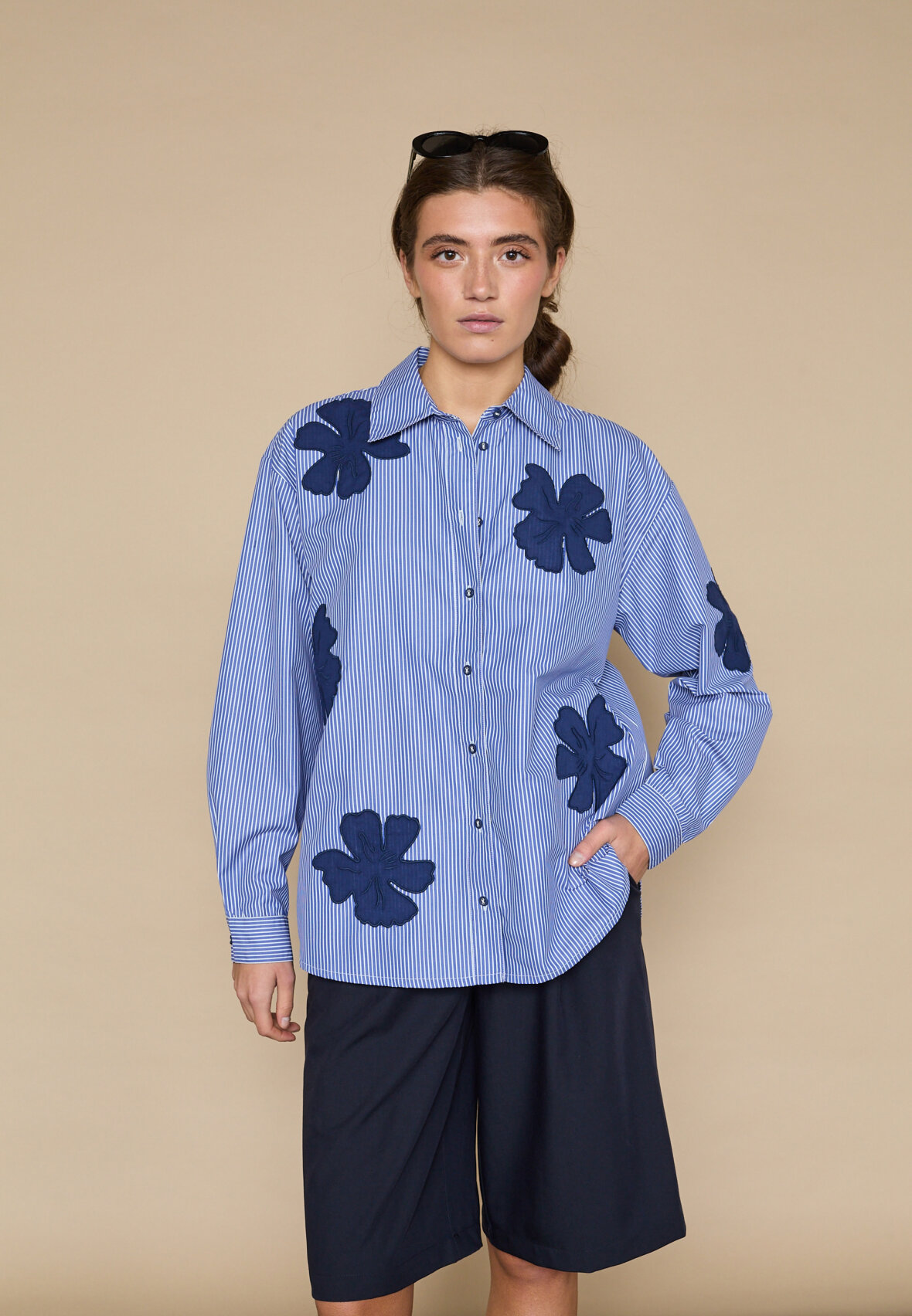 love1499 is a shirt in classic, striped woven fabric with a relaxed fit and long sleeves. It features a collar, button closure, and large, flower-like appliqués in a solid-colored fabric. The model is wearing a size S.