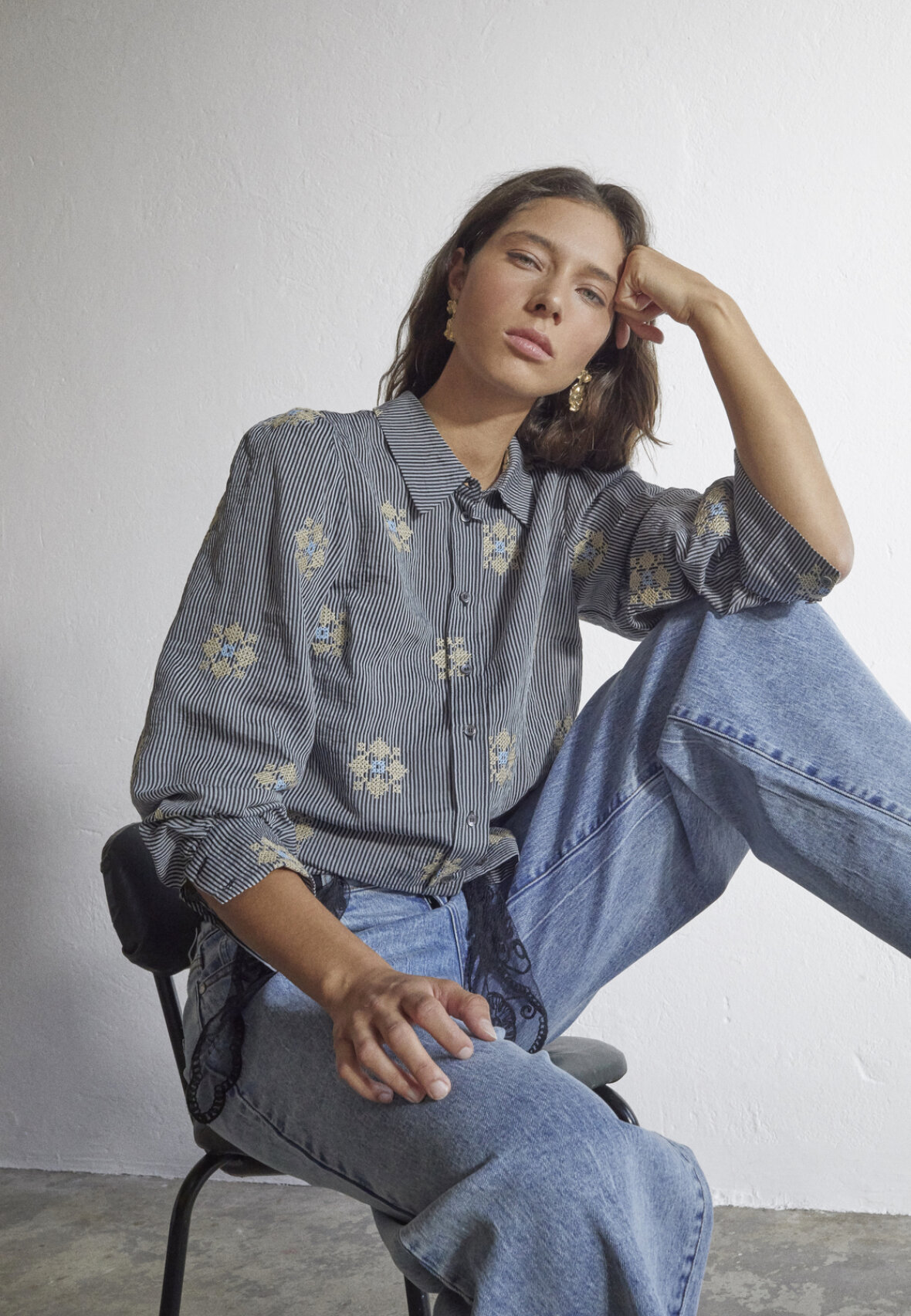 love919-19 is a shirt with a striped print and embroidered details. The shirt has high cuffs, a classic collar with button closure and a regular fit. The model is wearing a size S