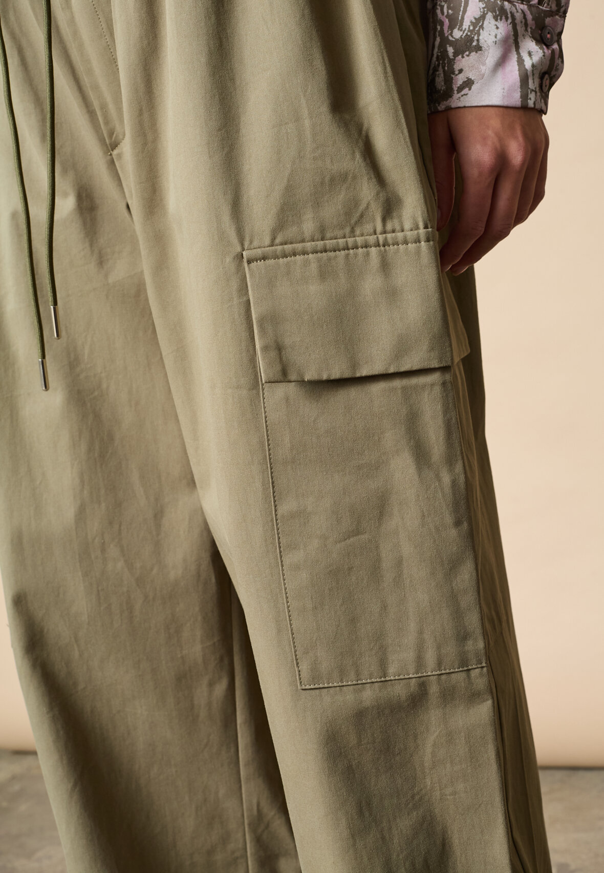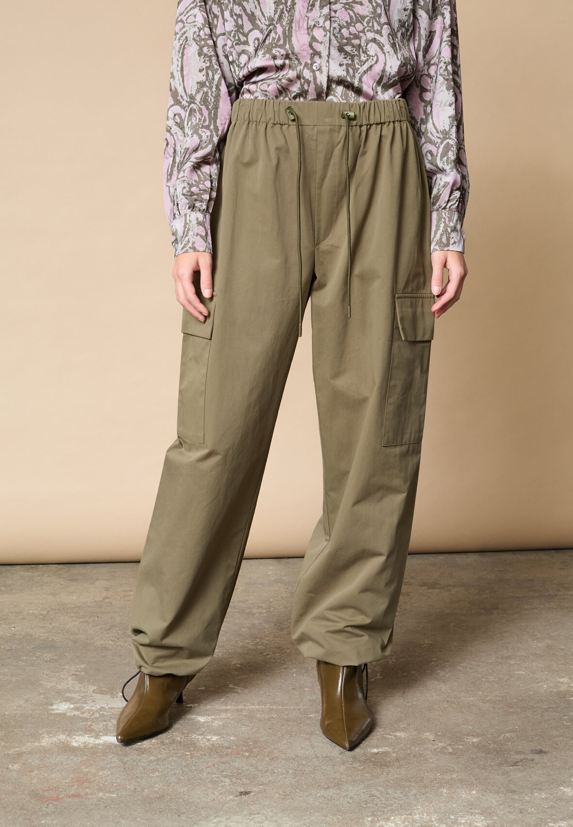 love1465 are a pair of cargo pants with a relaxed look. They have an elastic waistband with an adjustable drawstring. The pants has pockets on the sides of the legs. The model is wearing a size S and is 175 cm tall.