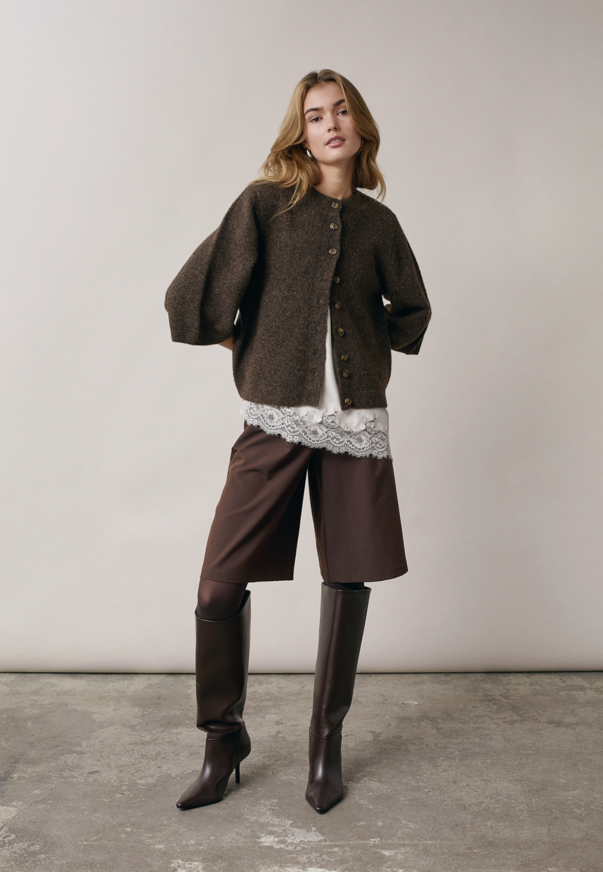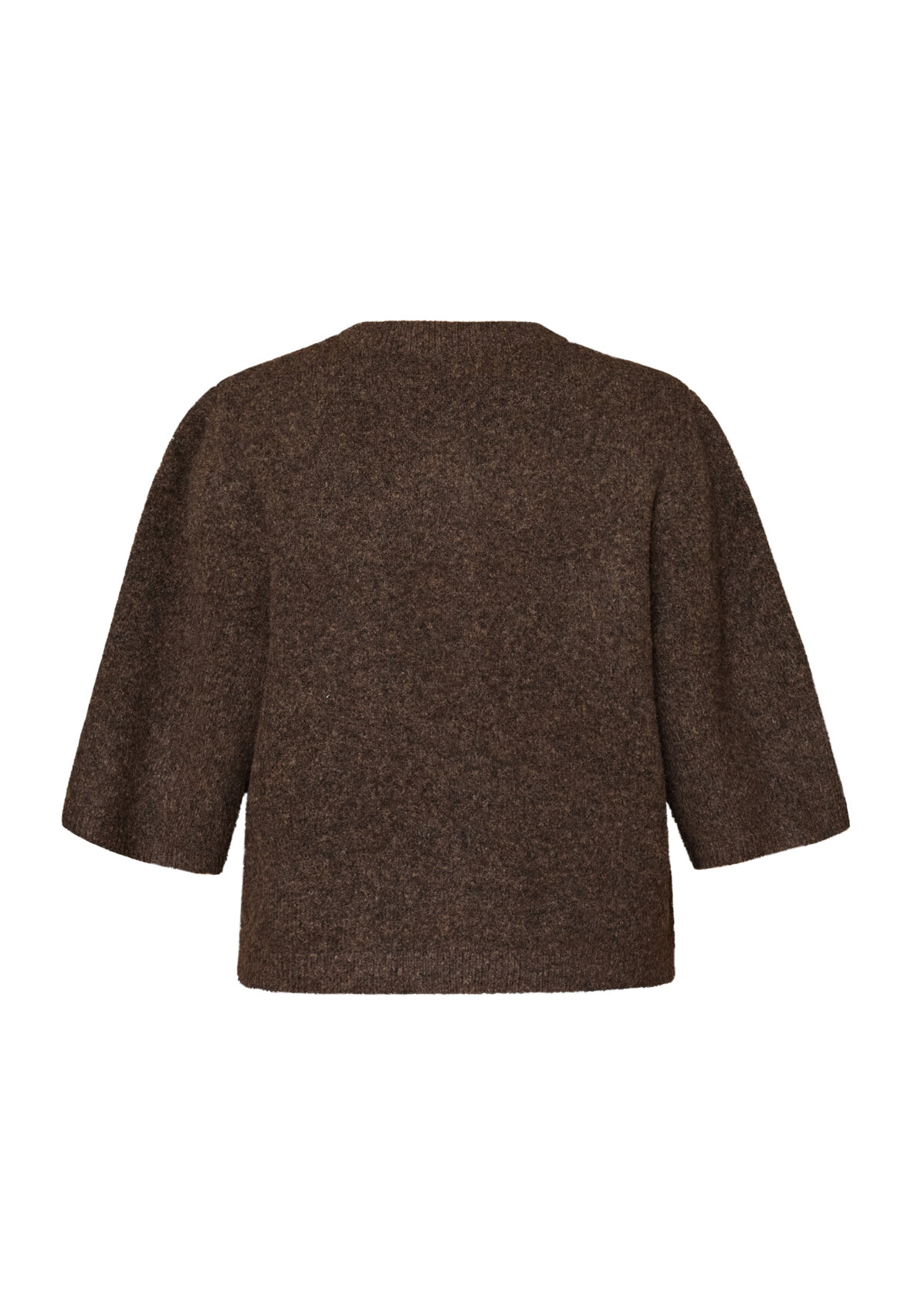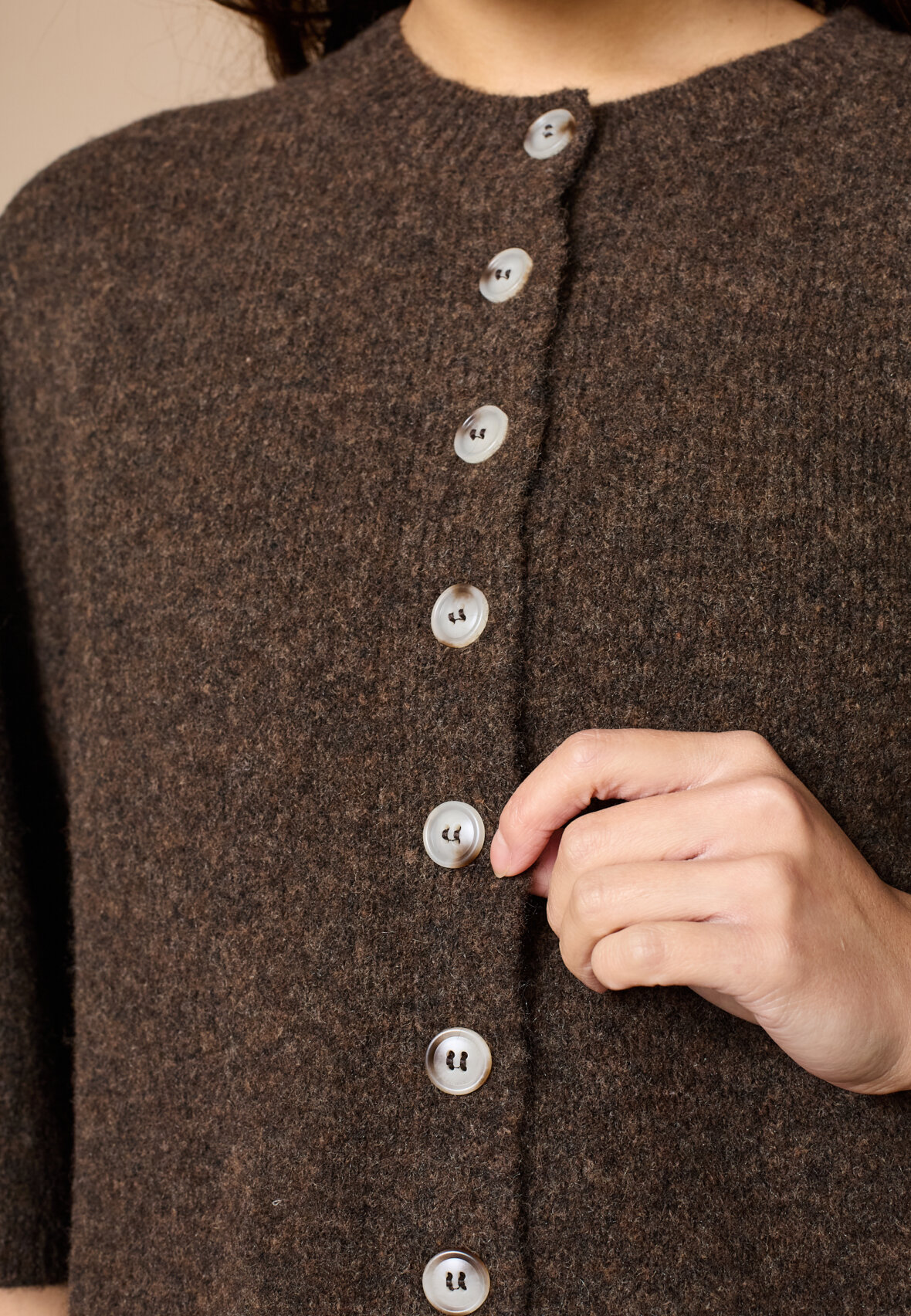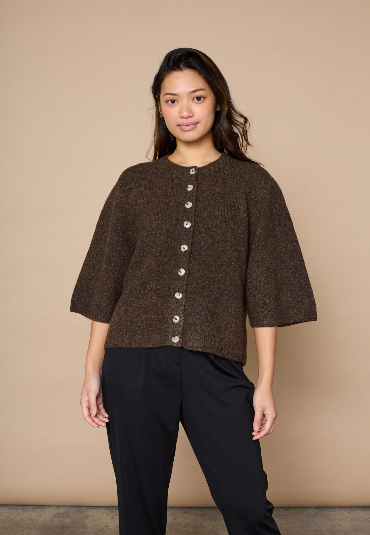 love1508 is a cardigan in a fine, ribbed knit material with a round neckline. It has a continuous button closure with round buttons and short, bell-shaped sleeves. The fit is light and boxy. The model is wearing a size S on.