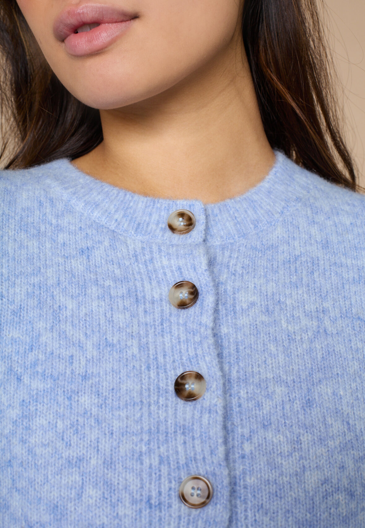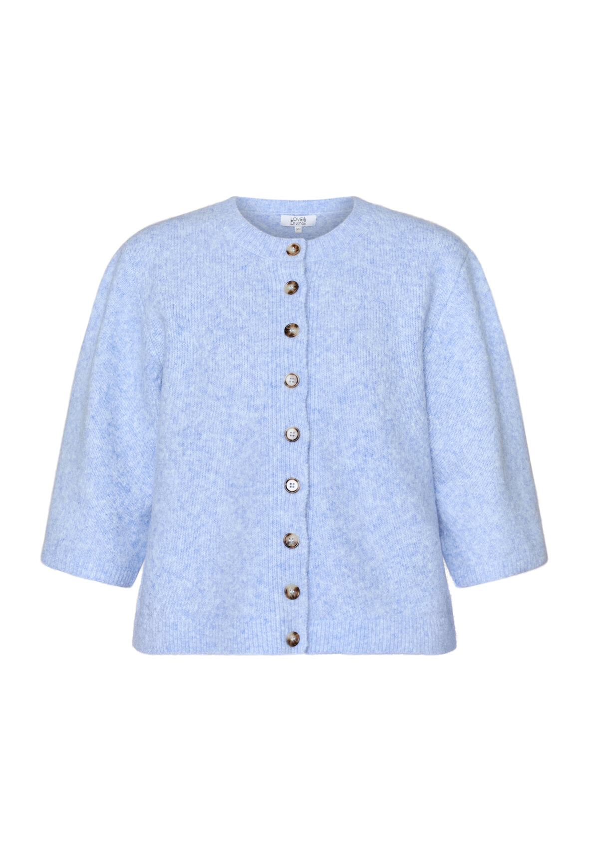 love1508 is a cardigan in a fine, ribbed knit material with a round neckline. It has a continuous button closure with round buttons and short, bell-shaped sleeves. The fit is light and boxy. The model is wearing a size S on.