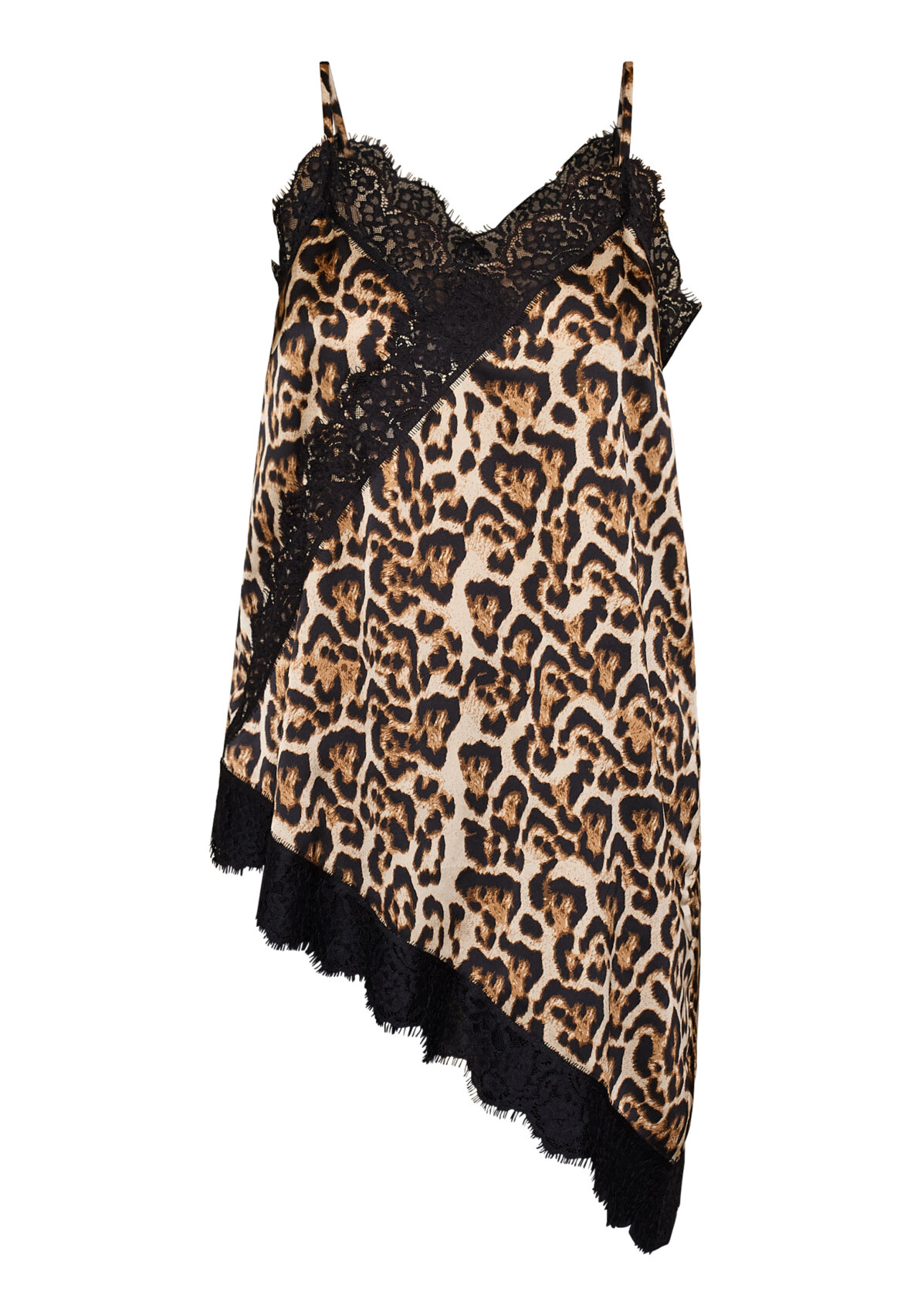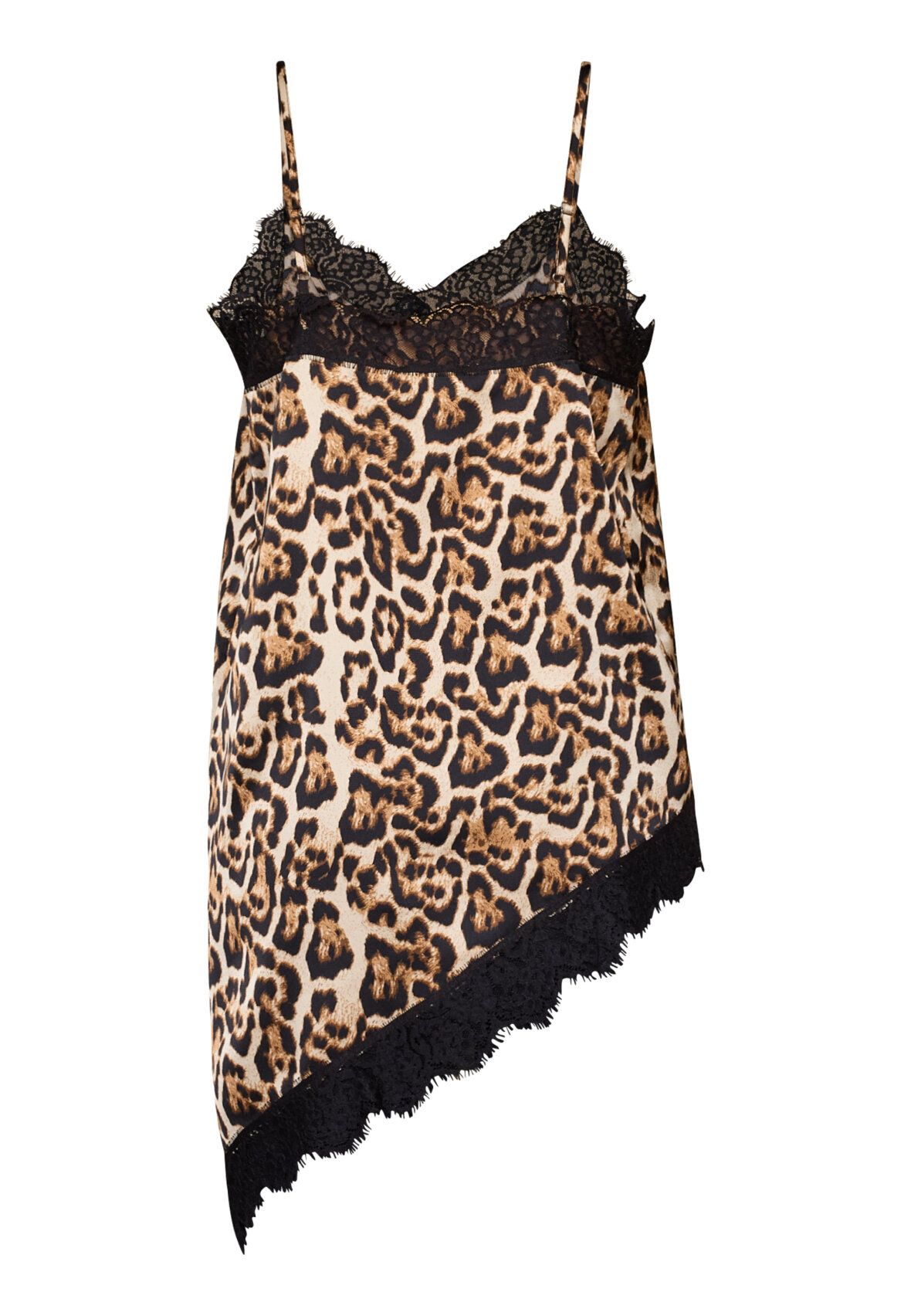 love1472-2 is a beautiful and feminine satin top with lace details and a leopard pattern. The top has adjustable straps and a slanted lace detail at the bottom of the top. The model is wearing a size S.