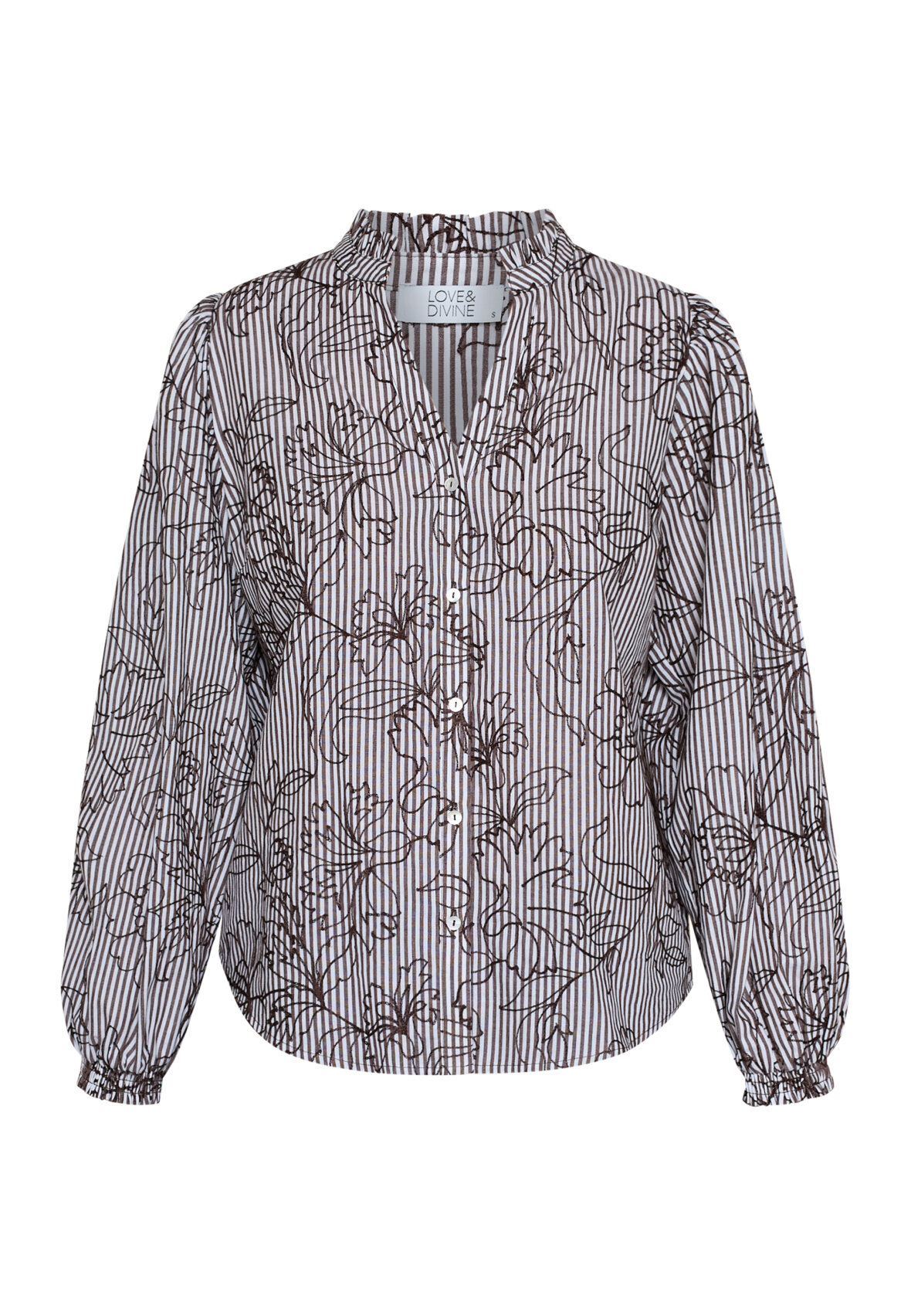 love1507 is a feminine blouse with a graphic pattern. It has a feminine mandarin collar with ruffles, a V-neck and voluminous balloon sleeves with narrow cuffs. The model is wearing a size S.