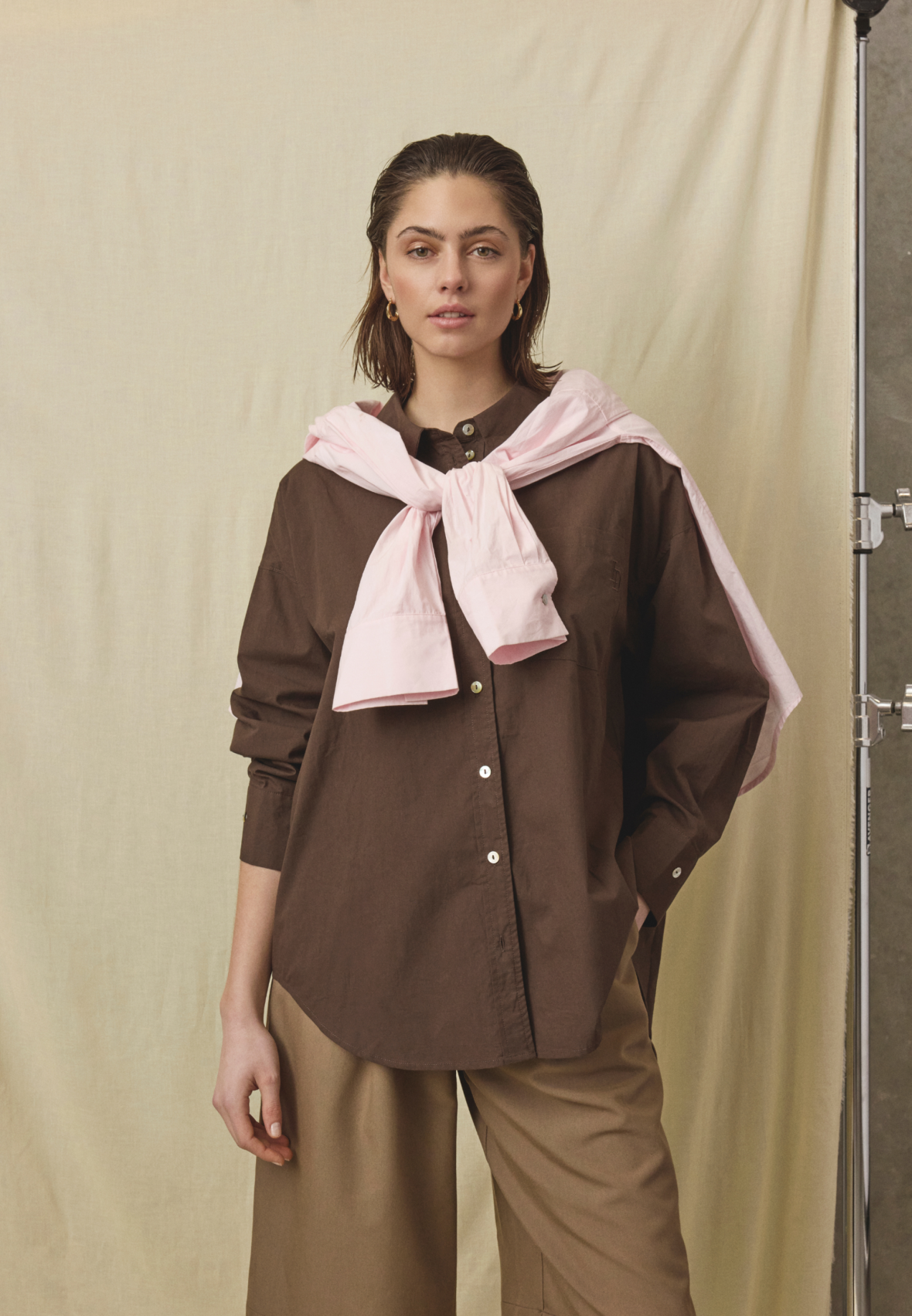 love1518 is an oversized poplin shirt in a relaxed boyfriend fit. The shirt has a classic collar, drop shoulders and an elegant chest pocket with discreet logo embroidery. The model is wearing a size S.