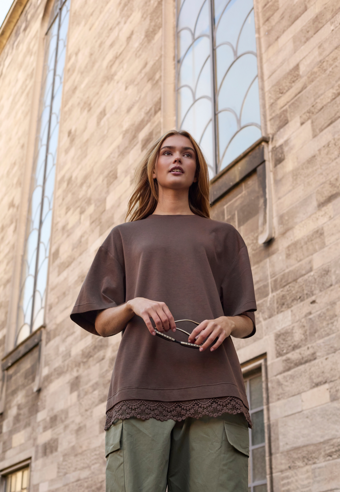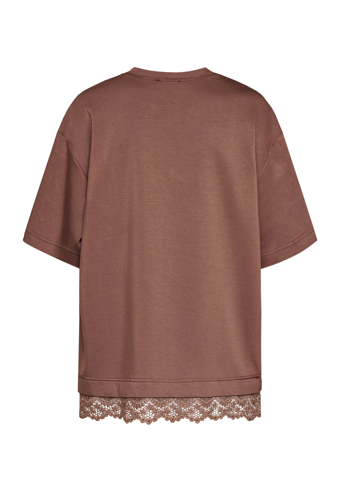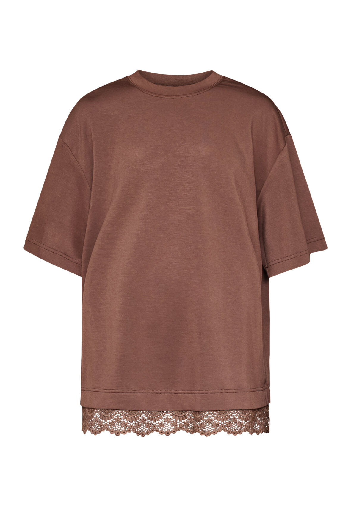 love1462 is a t-shirt made of sweatshirt material. The t-shirt is detailed with an appliqué lace trim. The model is wearing a size S.