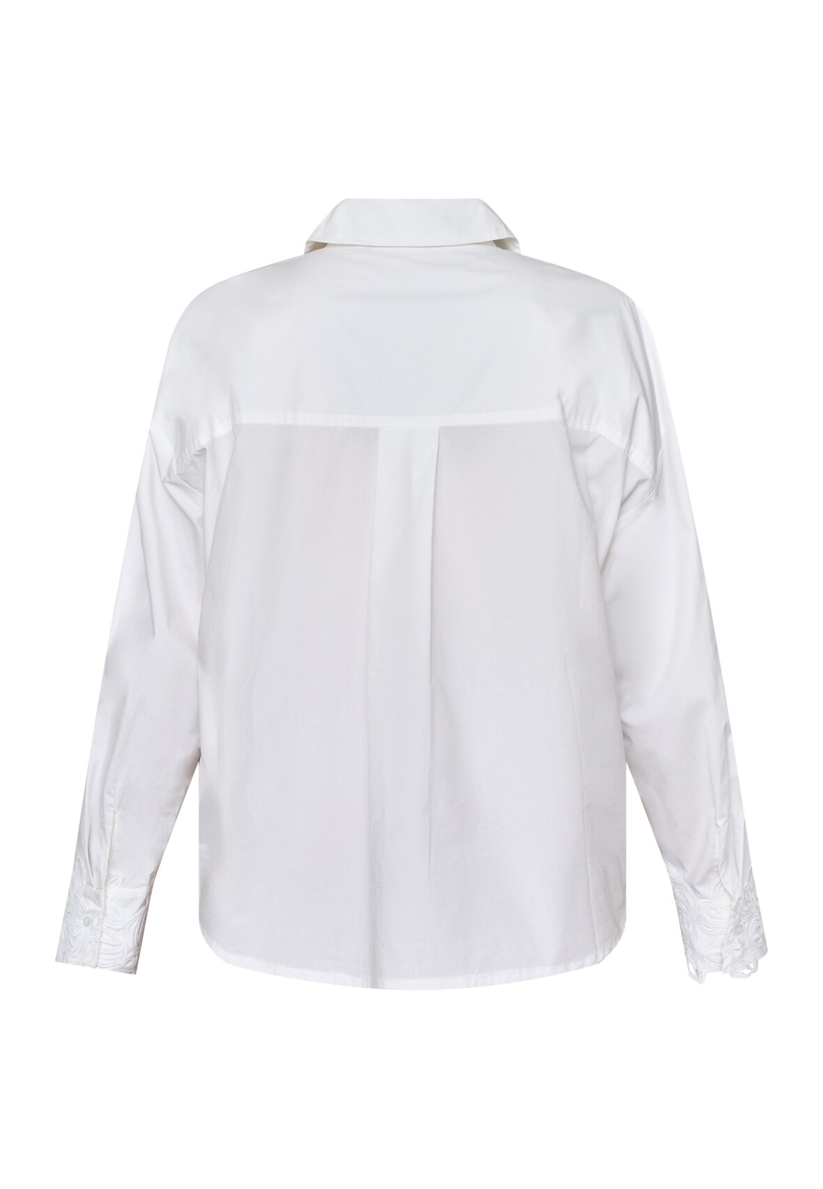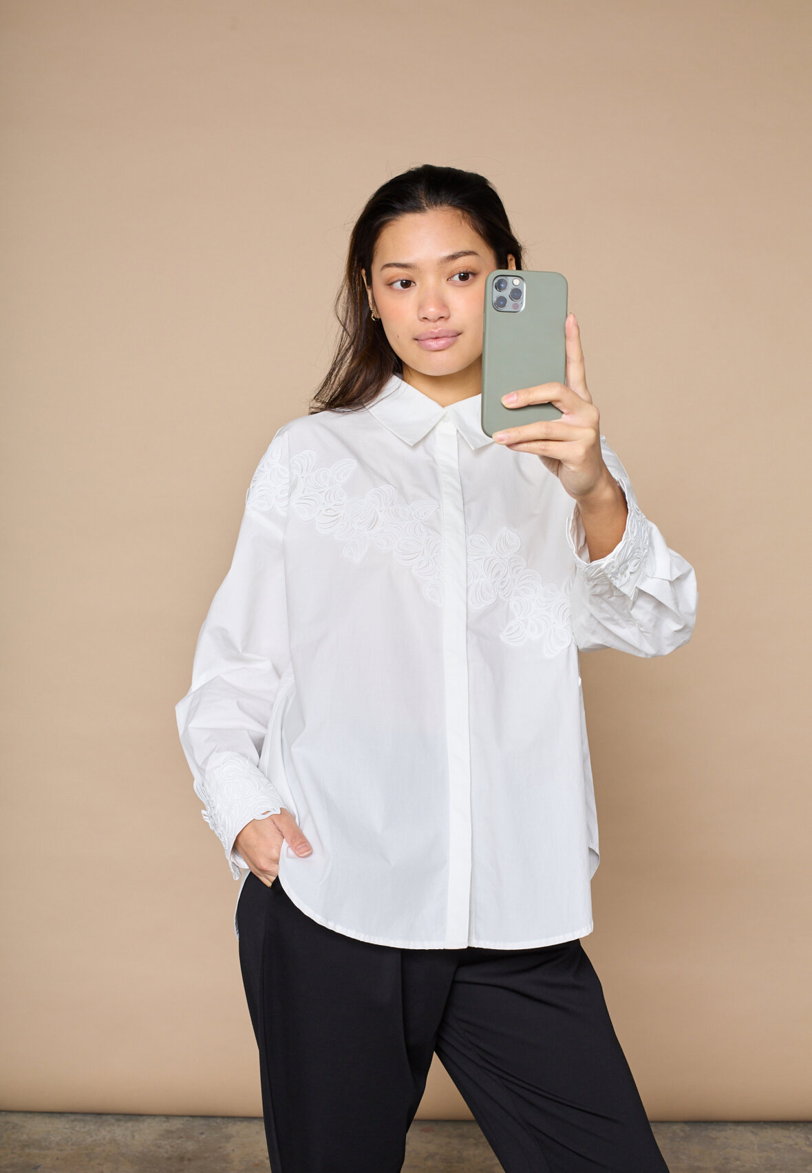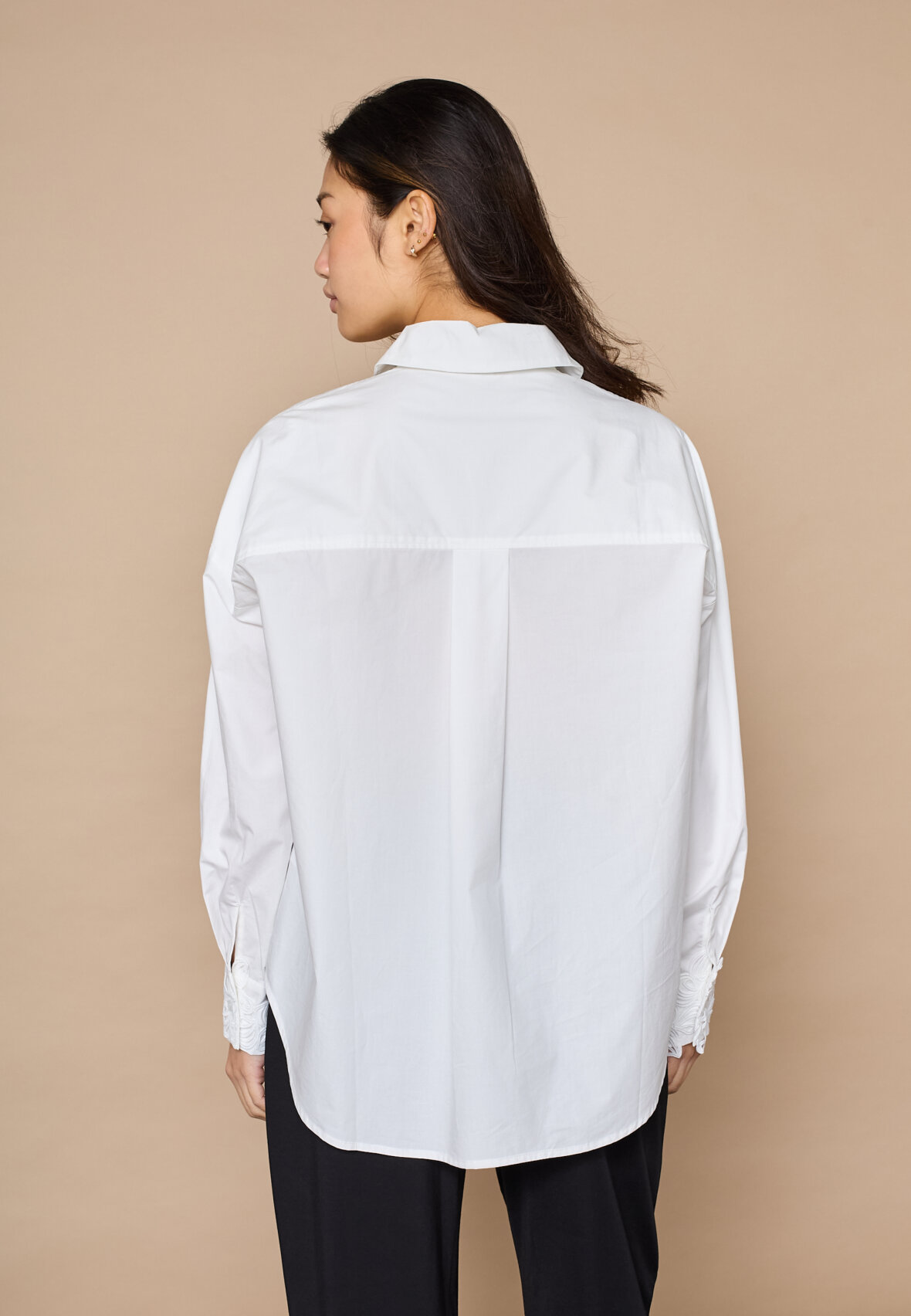 love1509 is an exclusive poplin shirt with a classic oversized cut and unique, textured tone-on-tone embroidery. The shirt is buttoned through the front and has detailed cuffs. The model is wearing a size S.