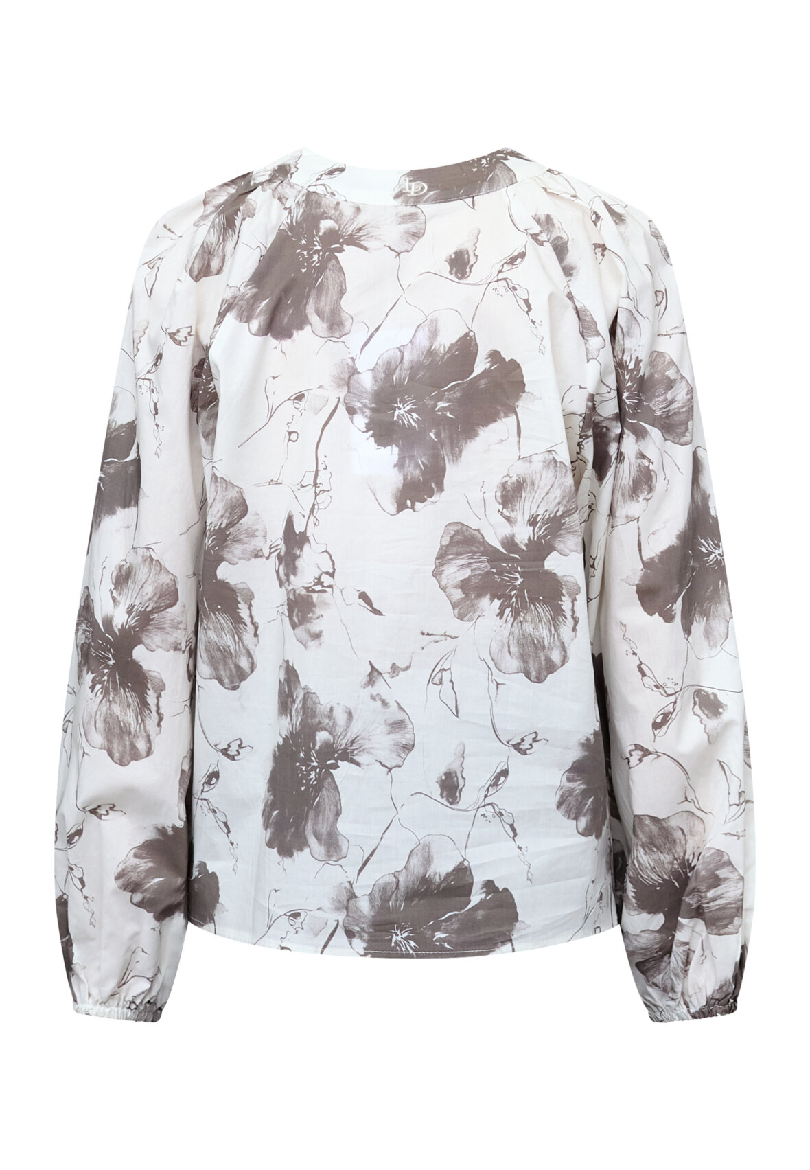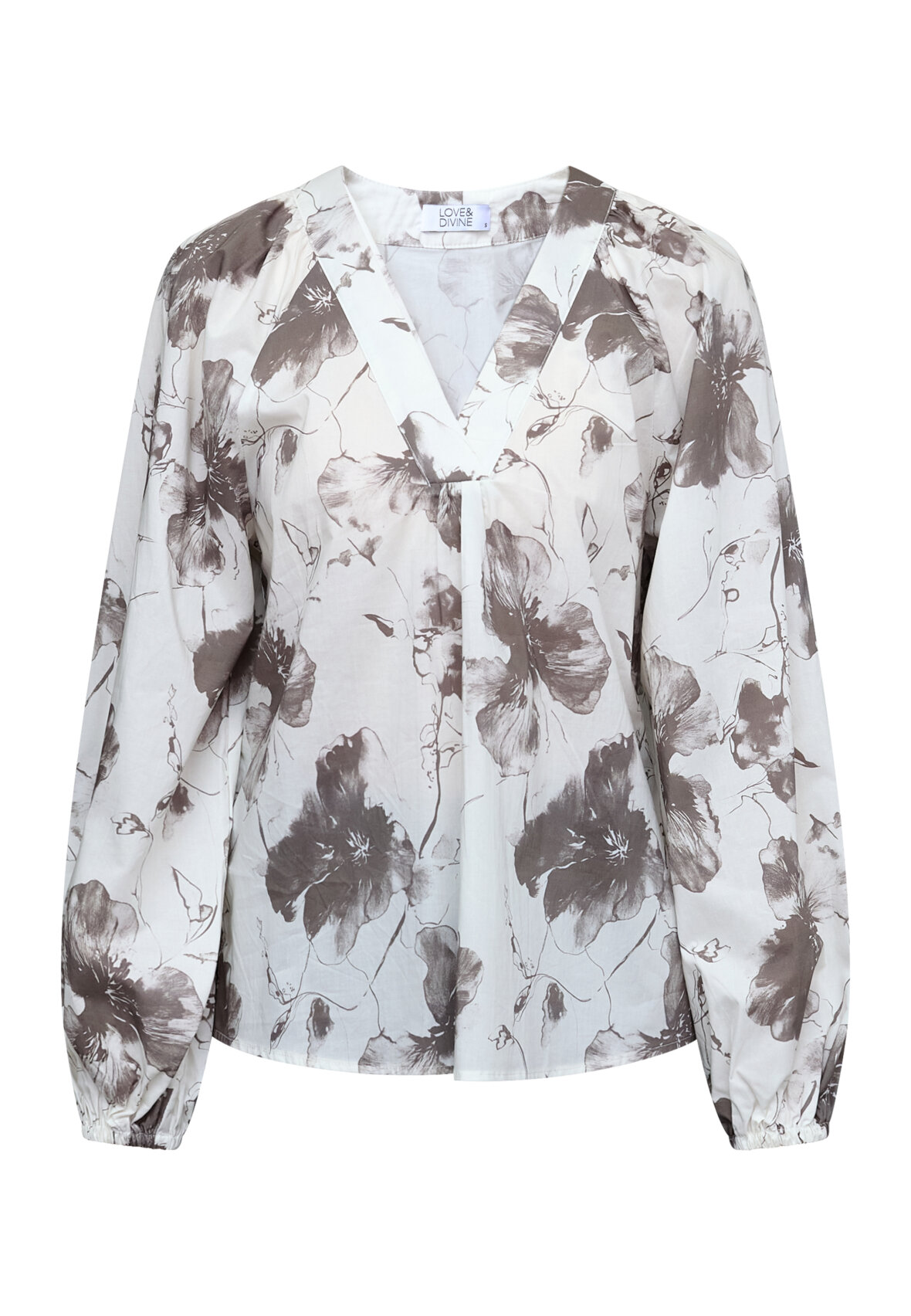 love1528 is an elegant blouse in a beautiful botanical floral print and an airy, oversized silhouette. The design has a V-neck and voluminous balloon sleeves with elastic at the wrists. The model is wearing a size S.