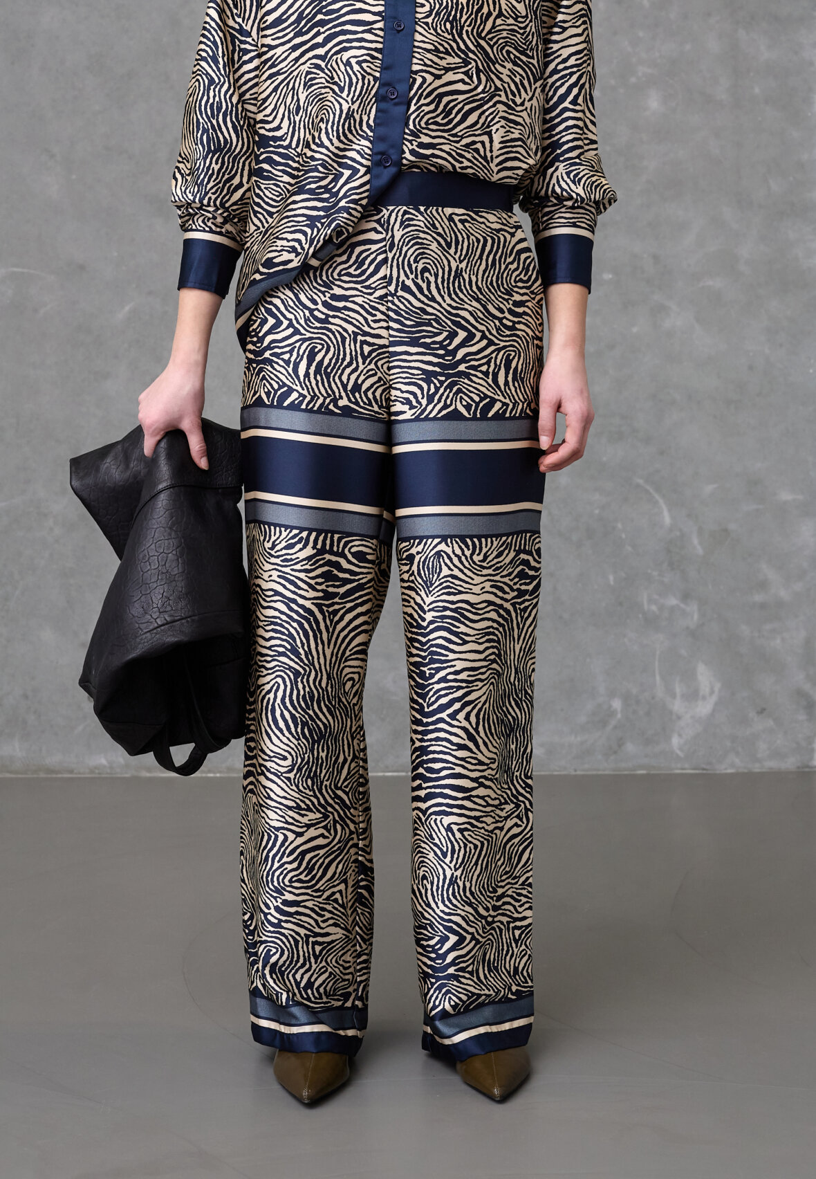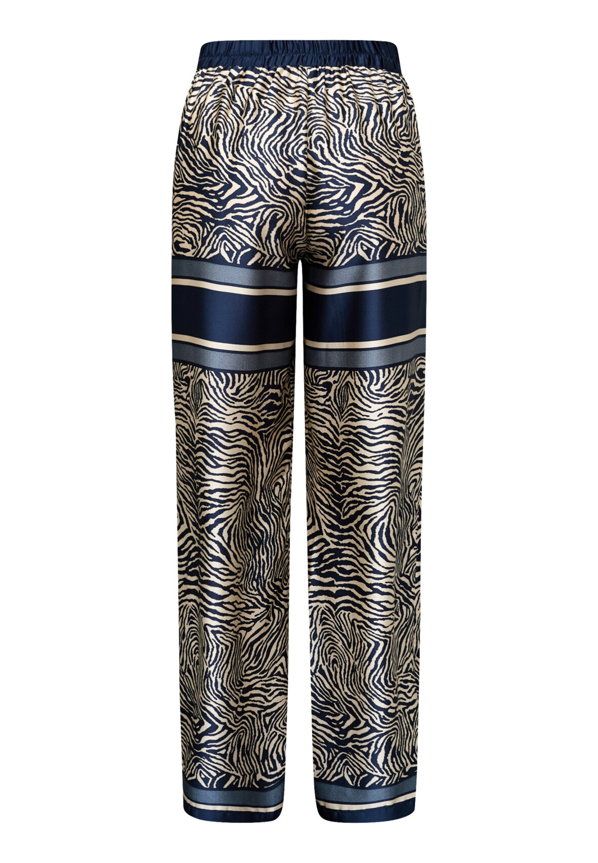 love1024-60 are a pair of wide-leg trousers in a silky quality with a zebra print. The trousers have a relaxed fit, high waist with elastic and panel details at the thighs and hem. The model is wearing a size S and is 175 cm tall.