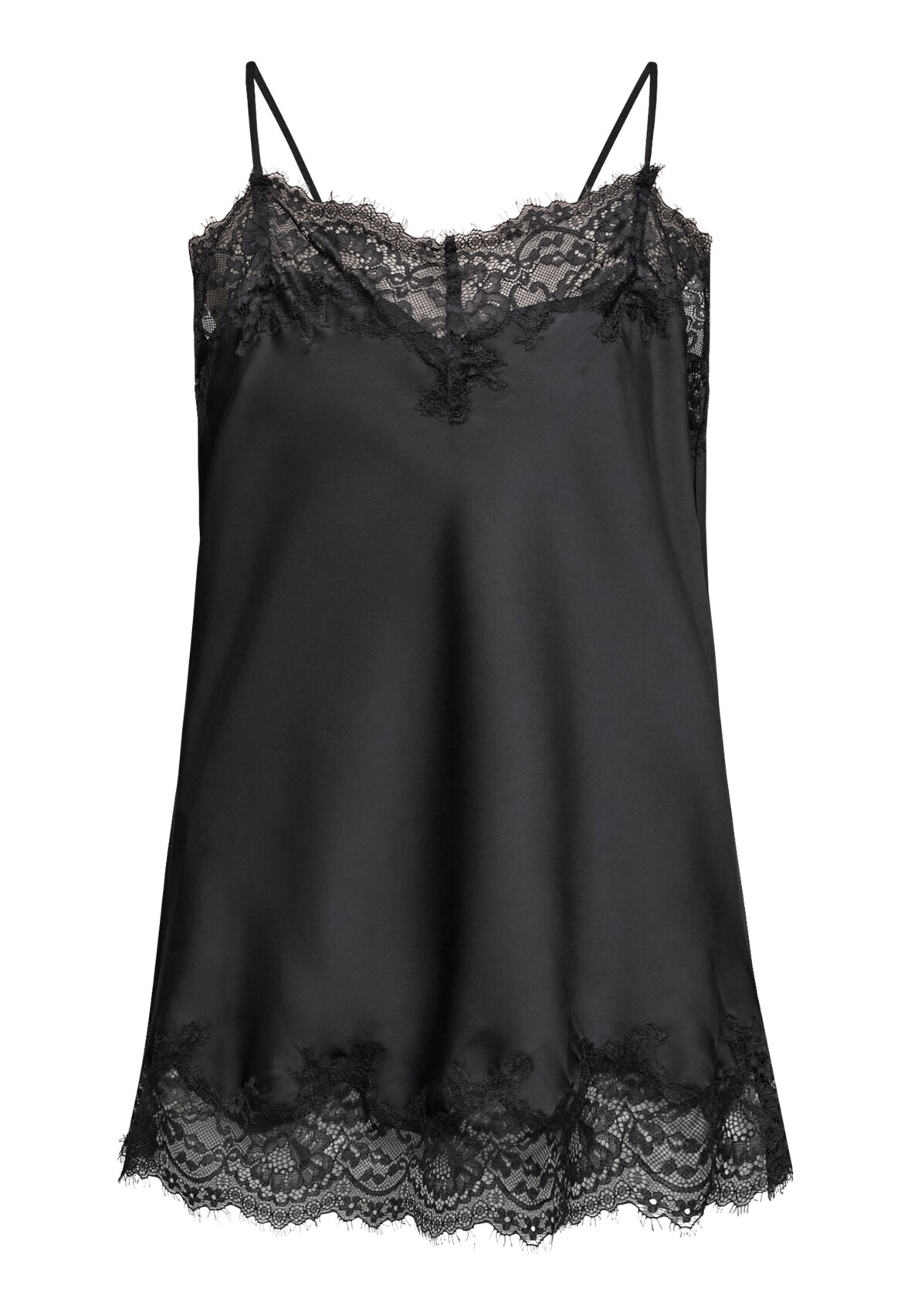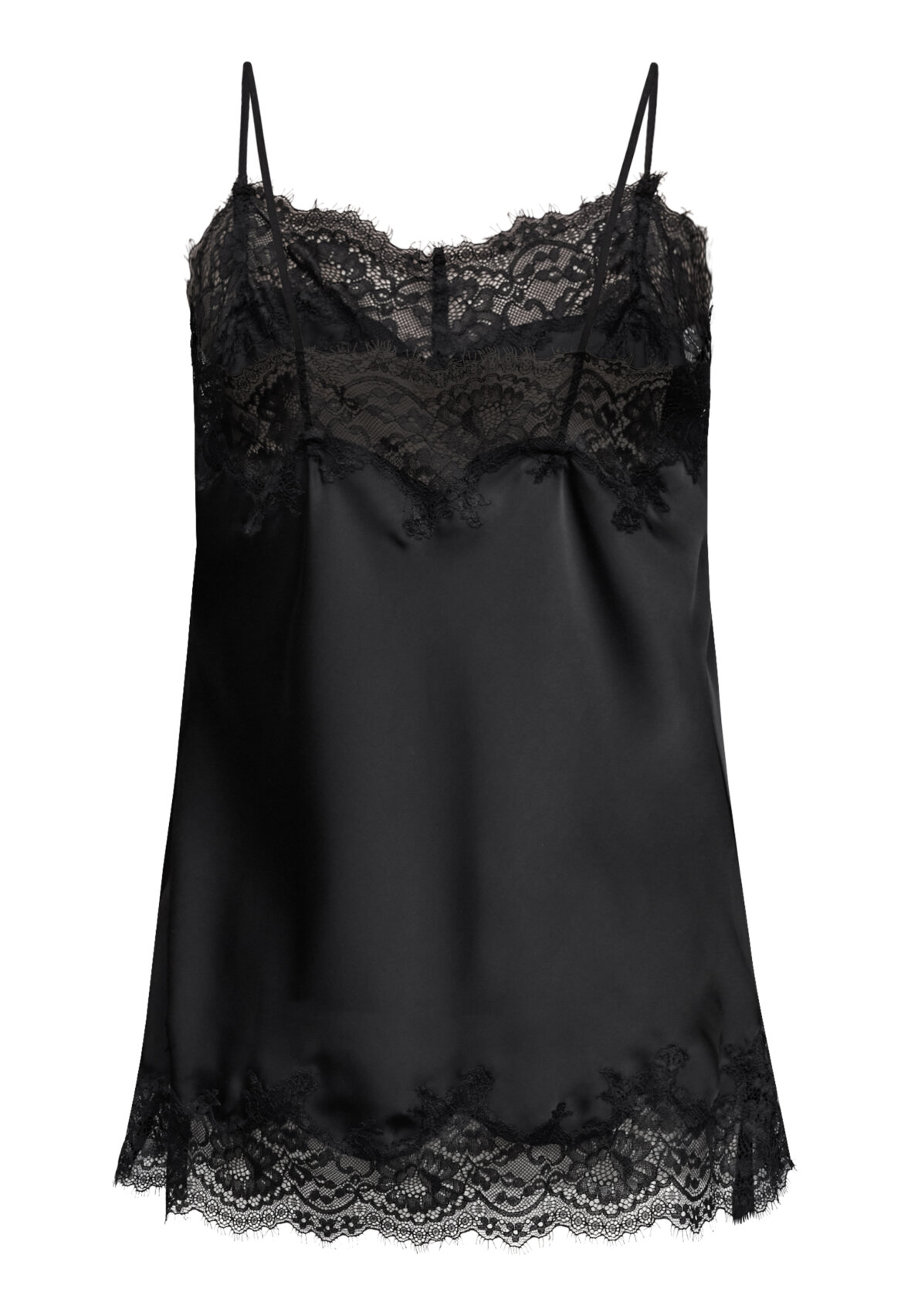 love1502 is a beautiful and feminine satin top with lace details. The top has adjustable straps and an angled lace detail at the bottom. The model is wearing a size S