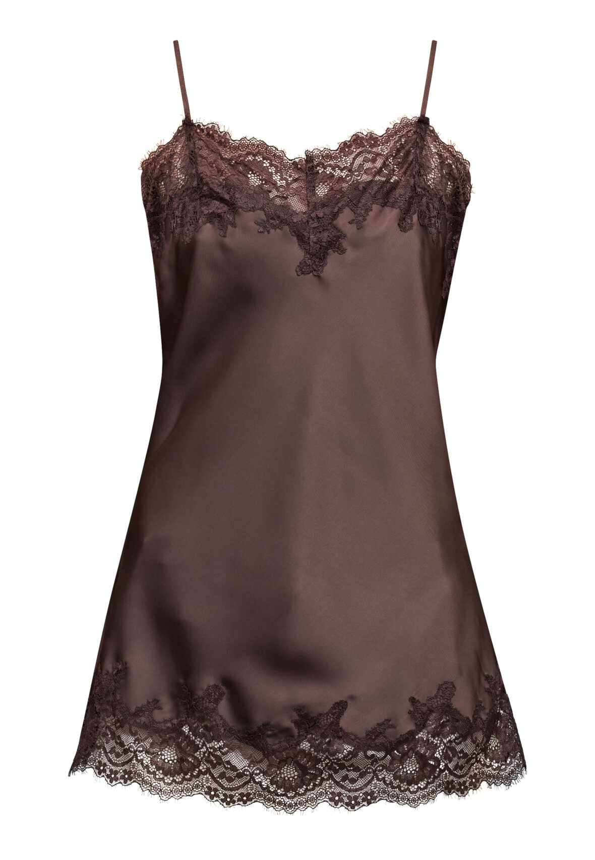 love1502 is a beautiful and feminine satin top with lace details. The top has adjustable straps and an angled lace detail at the bottom. The model is wearing a size S