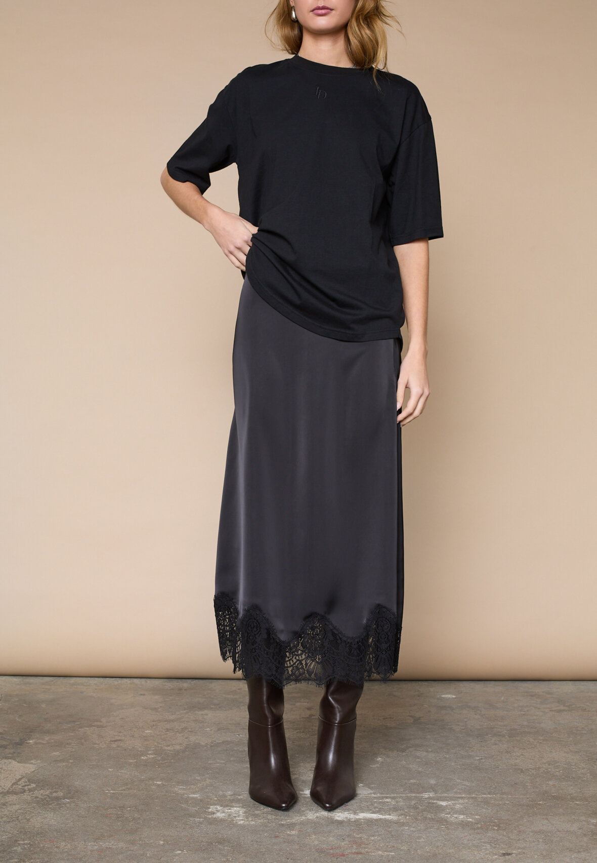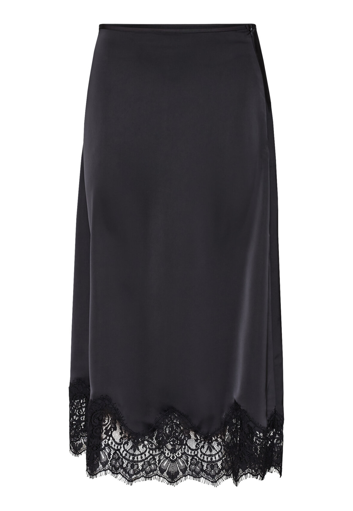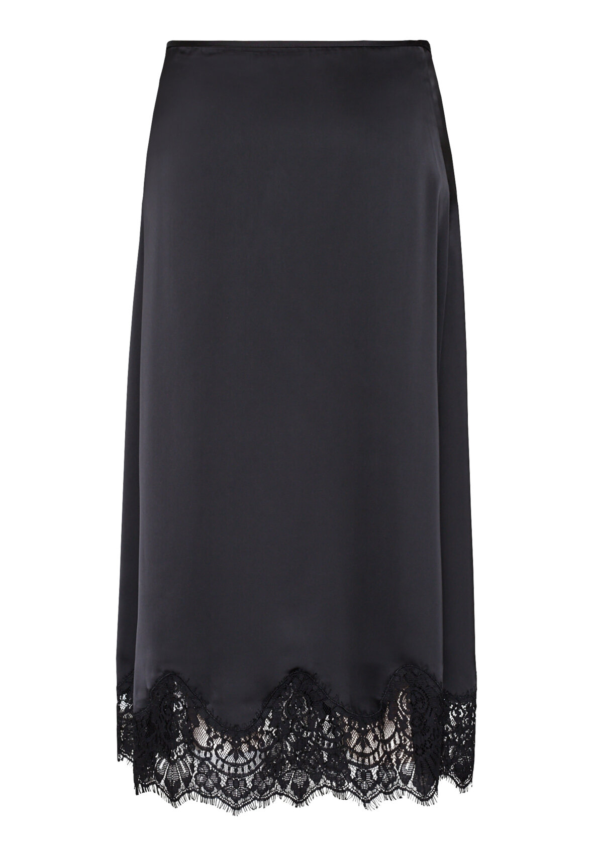 love1503 is an elegant midi skirt in silky satin, featuring a sophisticated bias cut that creates a beautiful fall. Detailed with a luxurious lace edge for a feminine lingerie look. The model is wearing a size S.